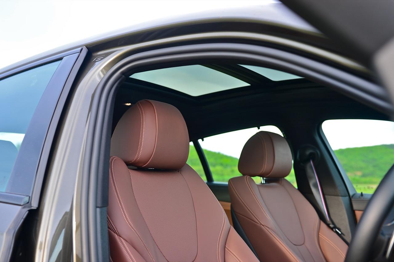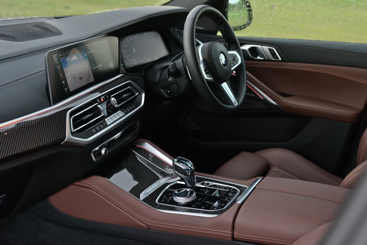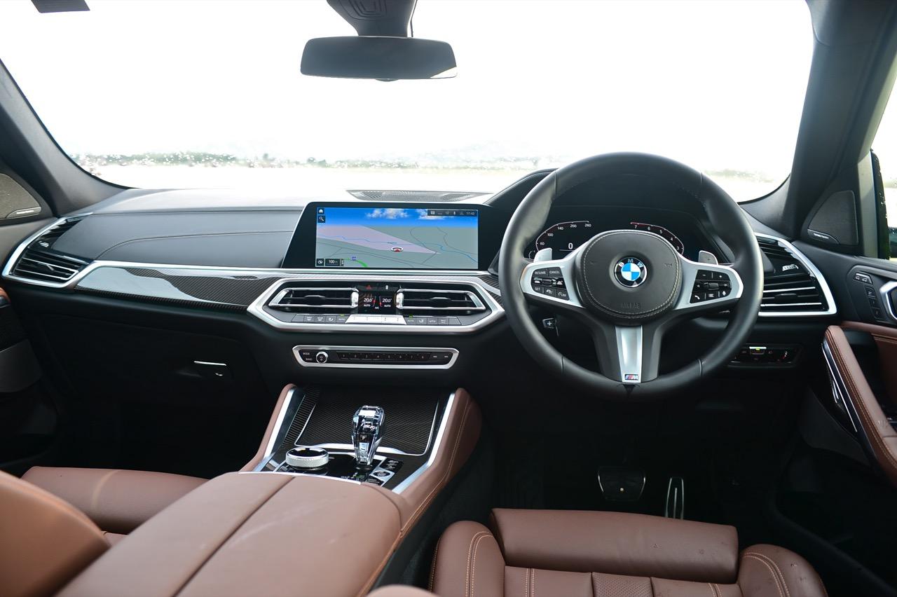 พื้นที่ภายในโปร่งโล่งจากความสูงของหลังคา ยิ่งไม่ได้ติดฟิล์มกรองแสงก็ยิ่งกระจ่างตา มองเห็นรอบๆ ตัวได้อย่างชัดเจน แดชบอร์ดแบบใหม่ใหญ่โตเหมือนเดิม แบ่งการใช้งานหลักๆ ของอุปกรณ์โดยเอียงเข้าหาคนขับเพื่อความสะดวกคล่องตัวในการใช้นิ้วกดเบาๆ หรือหมุน คอนโซลหน้าปรับรูปแบบตามสไตล์ของ BMW ยุคใหม่ มีความหรูหราทุกกระเบียดนิ้วด้วยวัสดุชั้นดี ช่องแอร์ทรงเหลี่ยมล้อมกรอบด้วยพลาสติกที่ทำออกมาให้คล้ายกับอะลูมิเนียม กึ่งกลางแดชบอร์ดตกแต่งด้วยวัสดุคาร์บอนไฟเบอร์ แผงควบคุมระบบปรับอากาศดิจิทัล มีหน้าตาเหมือนกับของ X5 xDRIVE 45e แผงประตูเต็มไปด้วยรายละเอียดของงานดีไซน์ที่ทันสมัยพร้อมวัสดุชั้นดี เพื่อยกระดับความน่าใช้ แผงประตูงดงามจากงานหนังที่ประณีต พลาสติกเดินเส้นข้างมือจับประตูสีเงิน และกรวยลำโพง Harman Kardon พร้อมแผงคาร์บอนไฟเบอร์คาดกลางคอนโซล เชื่อมโยงกับกึ่งกลางของแดชบอร์ดอย่างลงตัว ซุ้มเกียร์เต็มไปด้วยปุ่มและสวิตช์ที่ใช้สั่งงานต่างๆ เช่น ปุ่ม iDrive แบบใหม่ ปุ่มปรับระดับความสูง รวมไปถึงปุ่มปรับโหมด 5 ระดับการขับเคลื่อน