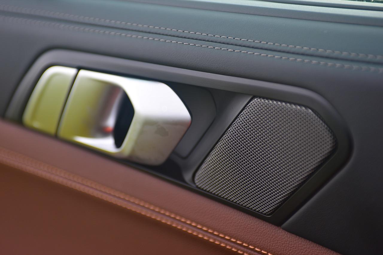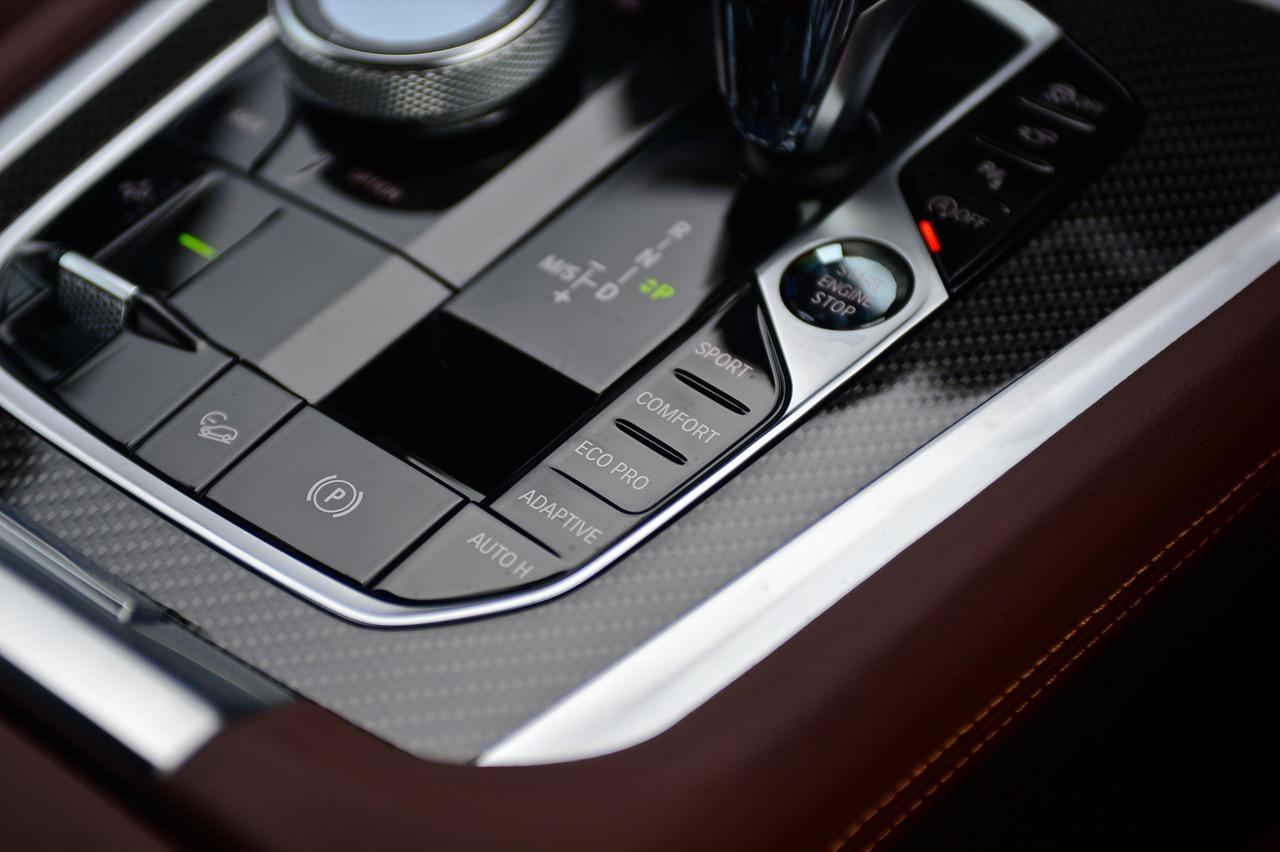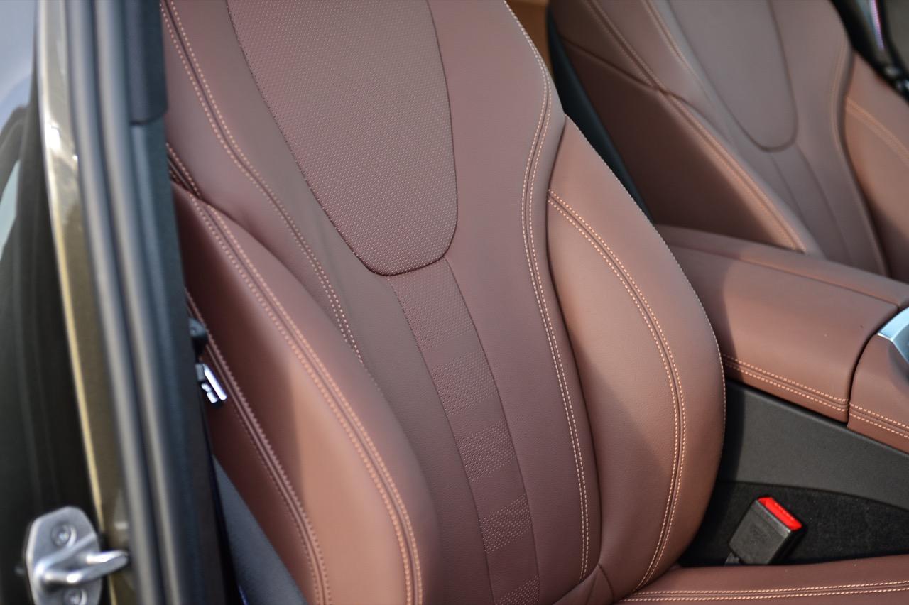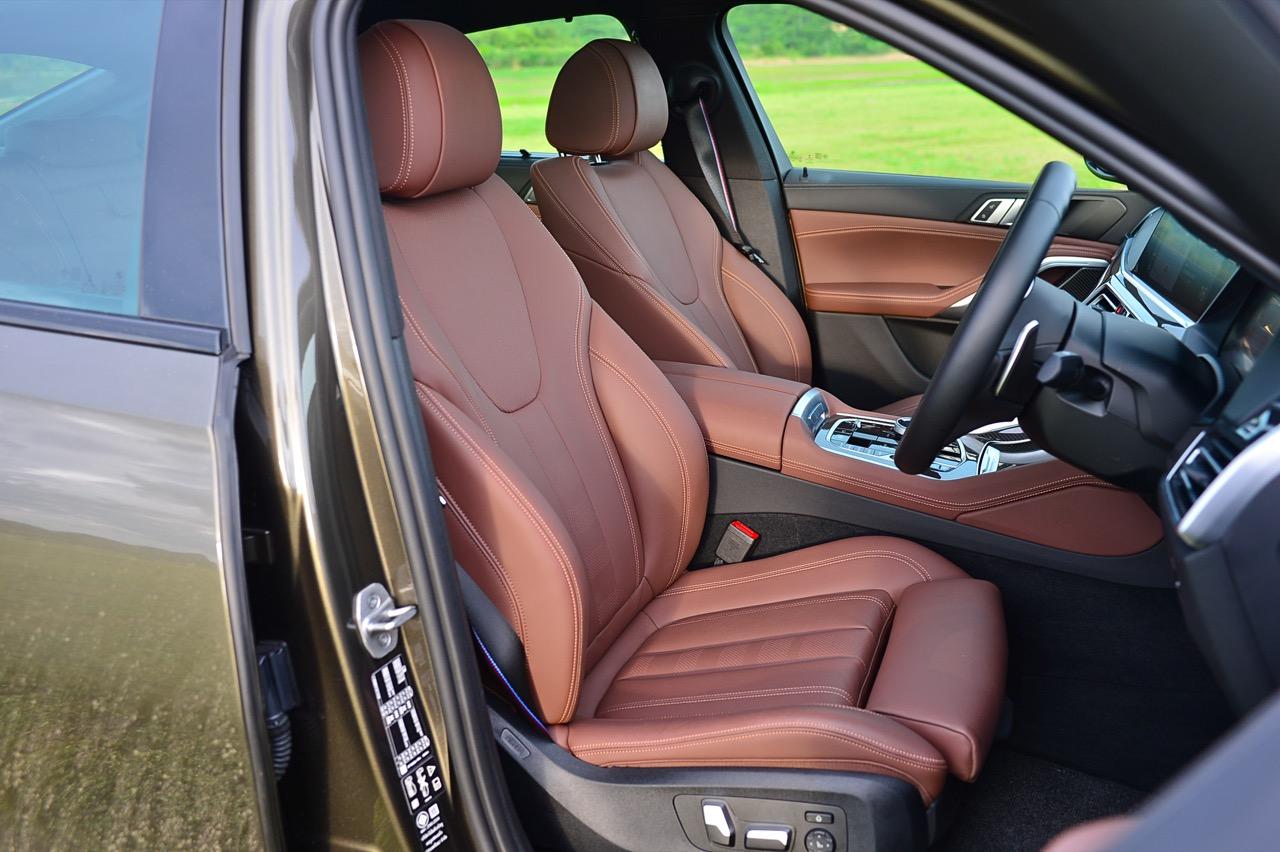 พื้นที่ภายในโปร่งโล่งจากความสูงของหลังคา ยิ่งไม่ได้ติดฟิล์มกรองแสงก็ยิ่งกระจ่างตา มองเห็นรอบๆ ตัวได้อย่างชัดเจน แดชบอร์ดแบบใหม่ใหญ่โตเหมือนเดิม แบ่งการใช้งานหลักๆ ของอุปกรณ์โดยเอียงเข้าหาคนขับเพื่อความสะดวกคล่องตัวในการใช้นิ้วกดเบาๆ หรือหมุน คอนโซลหน้าปรับรูปแบบตามสไตล์ของ BMW ยุคใหม่ มีความหรูหราทุกกระเบียดนิ้วด้วยวัสดุชั้นดี ช่องแอร์ทรงเหลี่ยมล้อมกรอบด้วยพลาสติกที่ทำออกมาให้คล้ายกับอะลูมิเนียม กึ่งกลางแดชบอร์ดตกแต่งด้วยวัสดุคาร์บอนไฟเบอร์ แผงควบคุมระบบปรับอากาศดิจิทัล มีหน้าตาเหมือนกับของ X5 xDRIVE 45e แผงประตูเต็มไปด้วยรายละเอียดของงานดีไซน์ที่ทันสมัยพร้อมวัสดุชั้นดี เพื่อยกระดับความน่าใช้ แผงประตูงดงามจากงานหนังที่ประณีต พลาสติกเดินเส้นข้างมือจับประตูสีเงิน และกรวยลำโพง Harman Kardon พร้อมแผงคาร์บอนไฟเบอร์คาดกลางคอนโซล เชื่อมโยงกับกึ่งกลางของแดชบอร์ดอย่างลงตัว ซุ้มเกียร์เต็มไปด้วยปุ่มและสวิตช์ที่ใช้สั่งงานต่างๆ เช่น ปุ่ม iDrive แบบใหม่ ปุ่มปรับระดับความสูง รวมไปถึงปุ่มปรับโหมด 5 ระดับการขับเคลื่อน