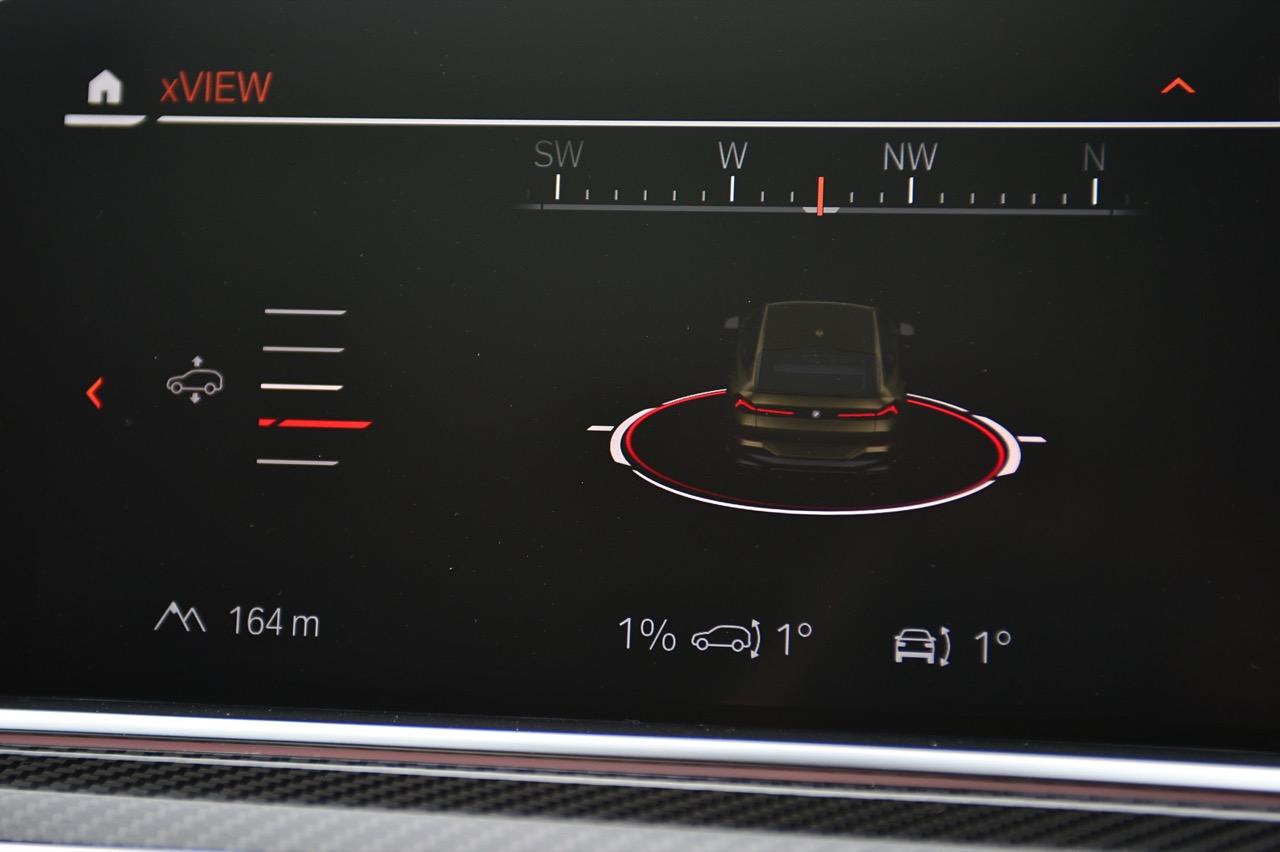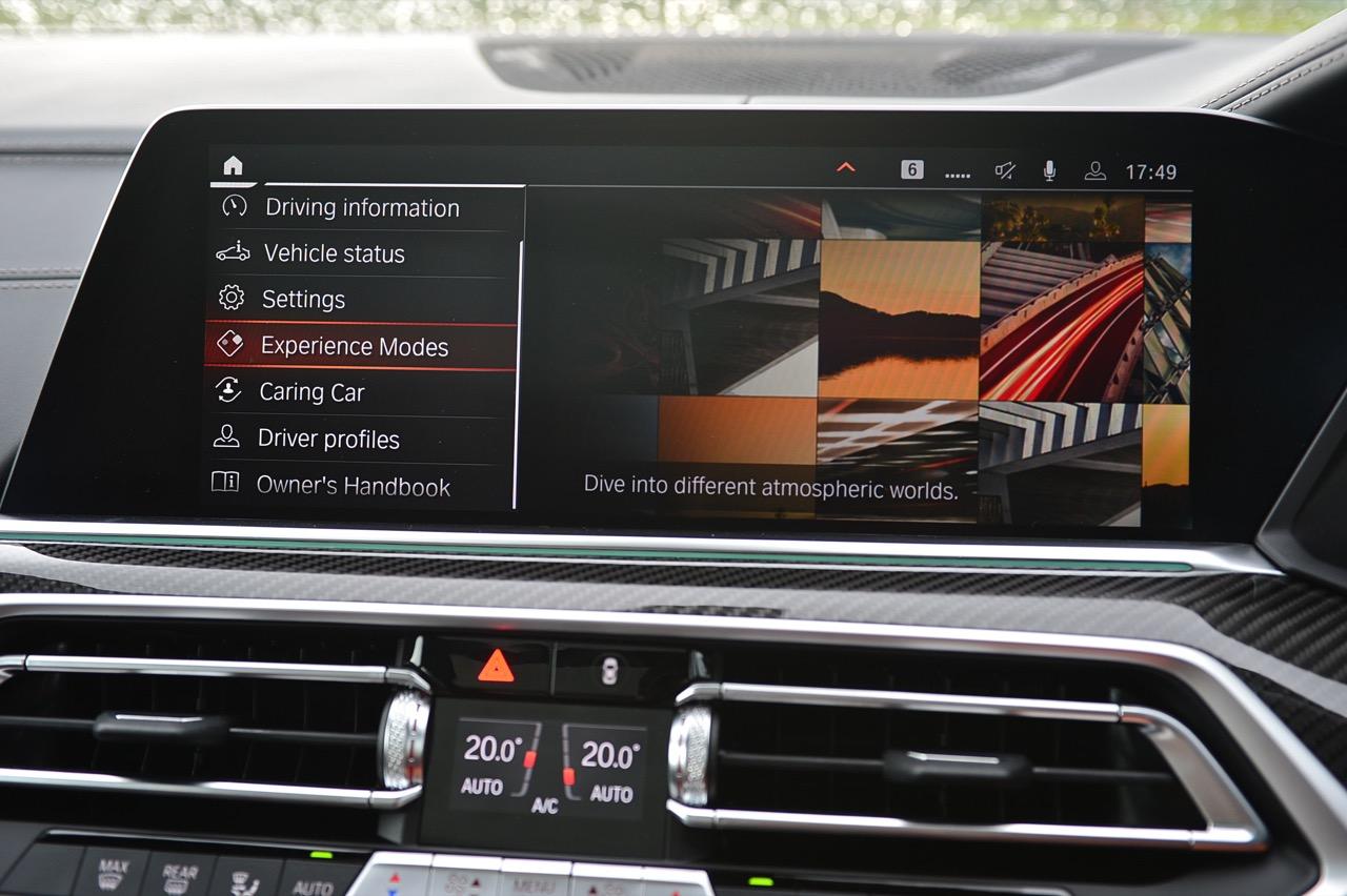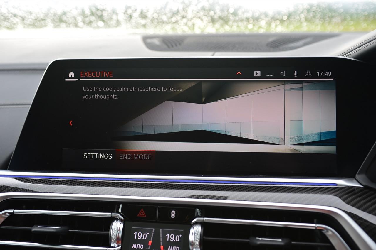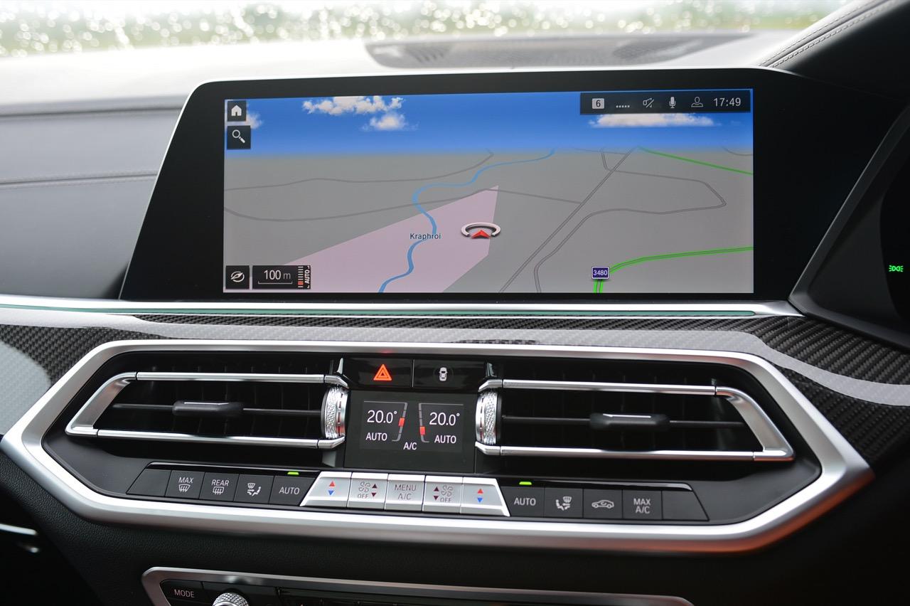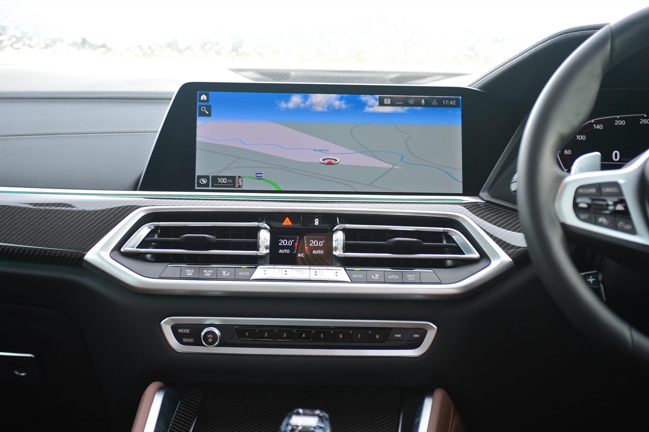 กึ่งกลางแดชบอร์ดคาดด้วยชิ้นงานตกแต่งคาร์บอนไฟเบอร์ ด้านบนติดตั้งจอภาพมอนิเตอร์ขนาดใหญ่ 12.3 นิ้ว พร้อมระบบสั่งงานผ่าน iDRIVE หรือจะสั่งงานด้วยการใช้นิ้วสัมผัสที่หน้าจอก็ยังได้ จอภาพมอนิเตอร์ขนาดยักษ์แบบ Panorama บรรจุโปรแกรมต่างๆ เปรียบเหมือนกับคอมพิวเตอร์ส่วนกลางของรถ มีมาให้ครบ เช่น กล้องมองรอบทิศทางความคมชัดสูง ไม่เกี่ยงแม้ใช้งานตอนกลางคืนก็ยังชัดแจ่ม กล้องมองรอบทิศทางแบบ 360 องศา มาพร้อมเส้นระนาบในการกะระยะถอย เชื่อมโยงกับระบบนำจอดอัตโนมัติ ระบบนำทางด้วยดาวเทียม วิทยุ AM / FM เชื่อมต่ออุปกรณ์ภายนอกในระบบบลูทูธ รองรับแอปพลิเคชันต่างๆ เพียบ จอแสดงผลกลางยังใช้ปรับตั้งค่าต่างๆ เช่น ระบบไฟ ระบบปรับอากาศ ระบบเครื่องเสียง แสดงผลอัตราสิ้นเปลืองเชื้อเพลิง เวลาและวันที่รวมถึงอุณหภูมิ การตั้งค่าล็อกหรือปลดล็อกประตู แรงดันลมยาง การแจ้งเตือนต่างๆ ของระบบขับเคลื่อน การปรับตั้งระบบส่องสว่างทั้งภายนอกและภายใน ที่เจ๋งมากก็คือ ระบบนำทางด้วยดาวเทียมแบบใหม่ของ BMW ที่แจ้งสภาพการจราจรในแบบ Realtime