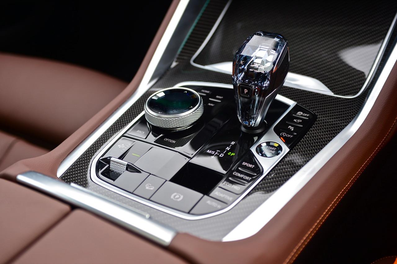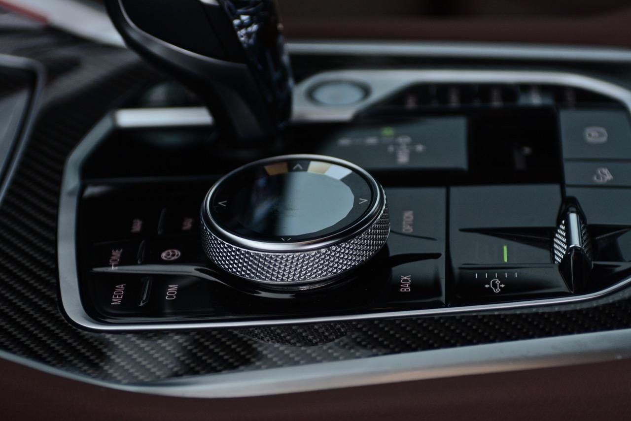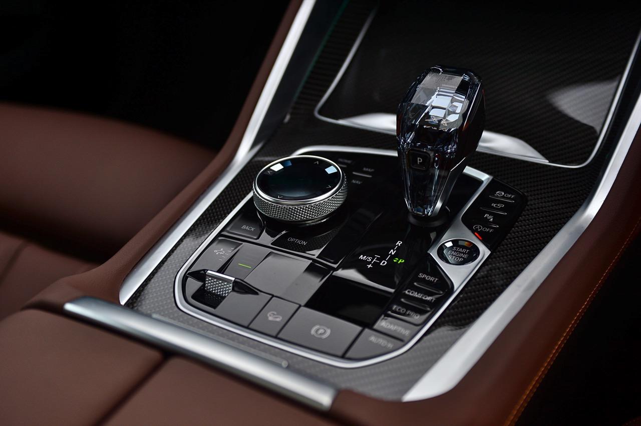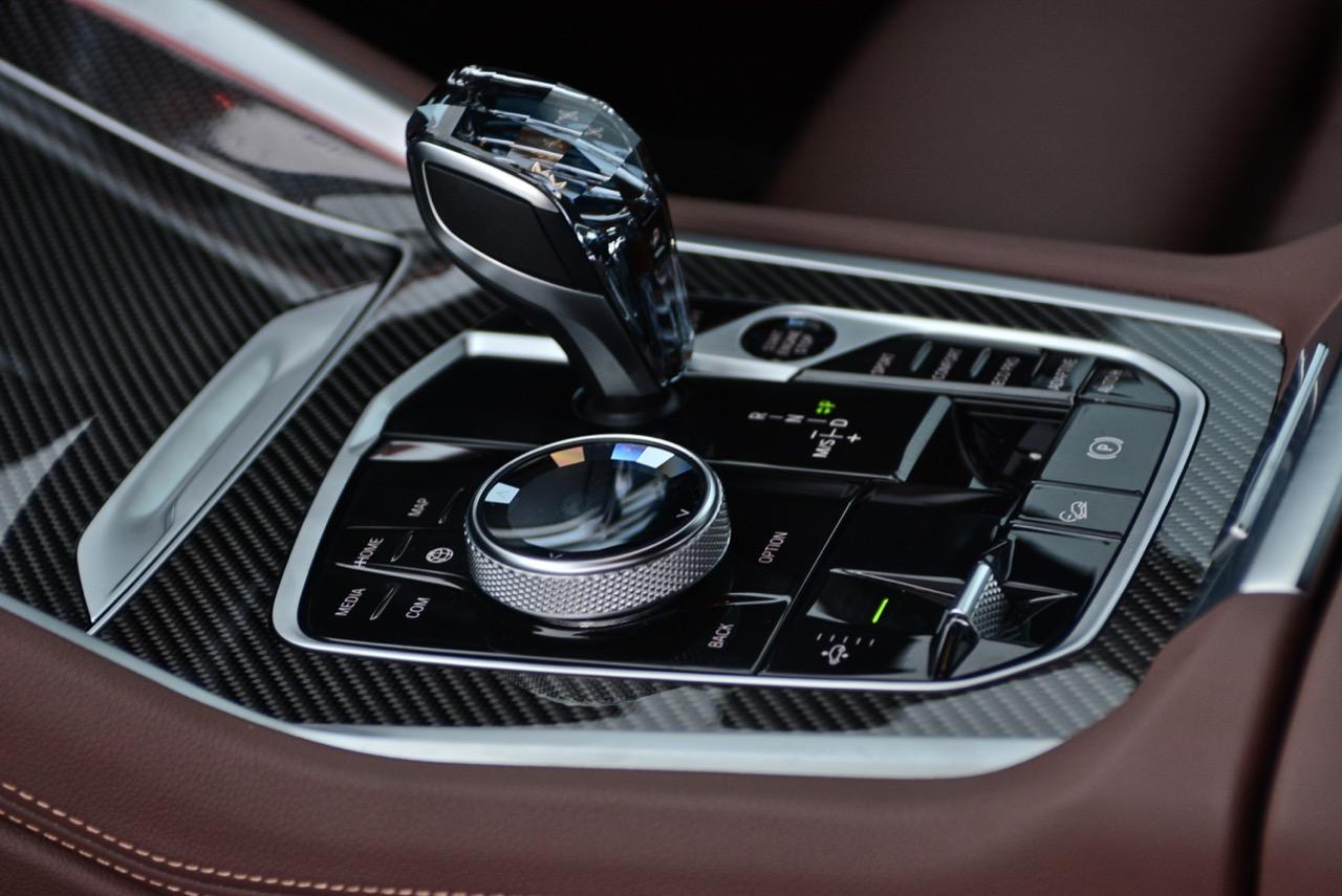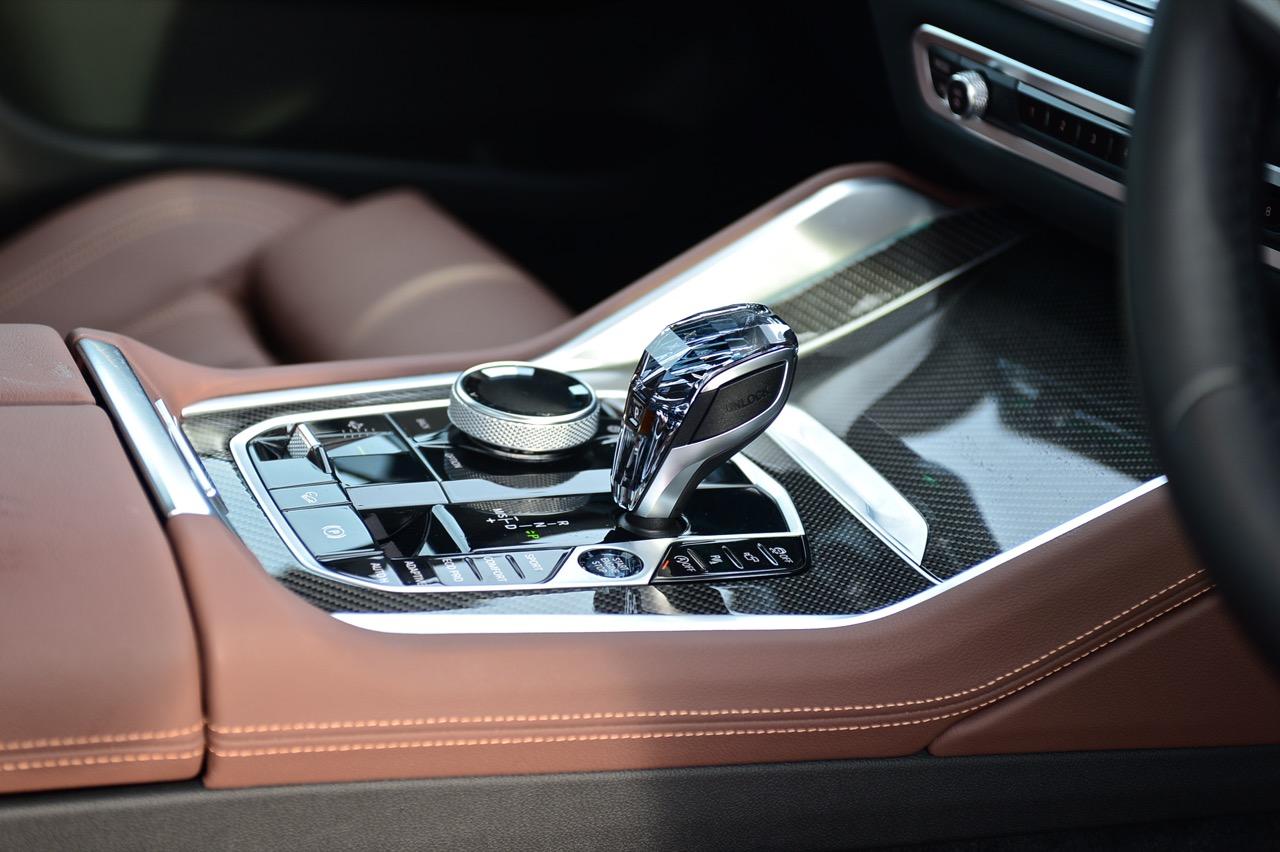 ปุ่ม Touch Controller แบบใหม่สวยงามน่าใช้จัดวางอยู่ข้างๆ คันเกียร์ใหม่ที่ใช้แก้วเจียระไน เรืองแสงสีส้มภายในพร้อมสัญลักษณ์ X นอกจากปุ่ม Touch Controller ข้างๆ ซุ้มเกียร์ยังมีสวิตช์ปรับโหมด เช่น ECO PRO / COMFORT / SPORT / ADAPTIVE ปุ่ม traction control ปุ่มควบคุมกล้องมองภาพรอบคัน ปุ่ม Auto brake Hold ปุ่มสตาร์ตเครื่องยนต์ ปุ่มควบคุมการทำงานของระบบ Auto Start/Stpo เบรกมือไฟฟ้า ระบบควบคุมการขับลงจากทางลาดชัน ปุ่มระบบจอดอัตโนมัติ ปุ่มปรับระดับความสูง-ต่ำ 5 ระดับ ปุ่มเลือกดูภาพรอบตัวรถ และปุ่มแทรคชั่นคอนโทรล ระบบเชื่อมต่อและชาร์จโทรศัพท์แบบไร้สาย อันนี้ใช้ได้เฉพาะ iPhone รุ่นใหม่ๆ ทำงานร่วมกับแท่นชาร์จโทรศัพท์และไมโครโฟน เพื่อให้คุณภาพเสียงในระบบแฮนด์ฟรีดีขึ้นสำหรับการรับหรือโทรออก การเชื่อมต่อเสาสัญญาณบนหลังคาทำให้การรับ-ส่งสัญญาณมีความเสถียร ระบบใหม่ของ X6 ยังช่วยเชื่อมต่อมือถือได้พร้อมๆ กันสองเครื่องผ่านระบบบลูทูธ จุดเด่นของระบบอินโฟเทนเมนต์ใน X6 40i ก็คือ ปุ่มควบคุม iDrive OS7 ที่ผ่านการพัฒนามานานกว่า 15 ปี ออกแบบให้แป้นทรงกลมมีสวิตช์ 5 ทิศทางบรรจุอยู่ภายใน ใช้งานได้คล่องกว่า Touch Pad หัวเกียร์แก้วเจียระไน สวยงามสมราคา 5 ล้าน