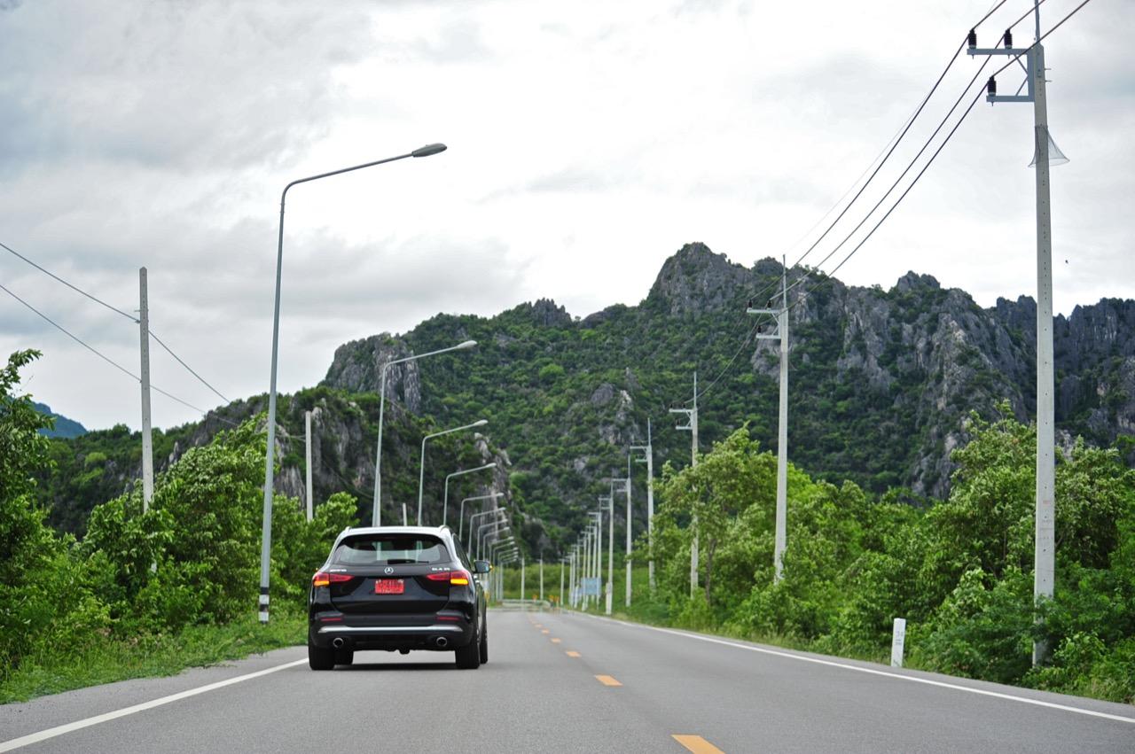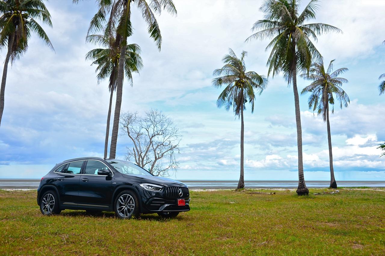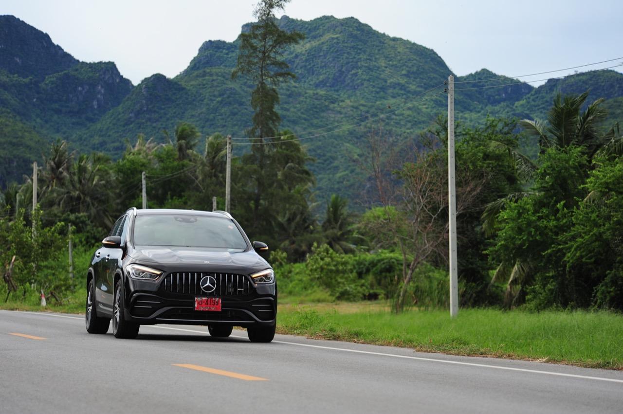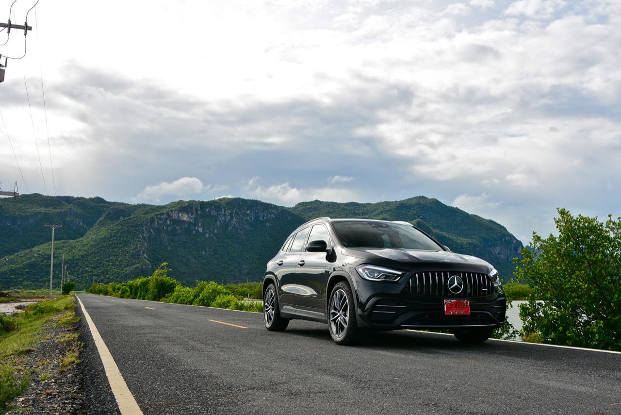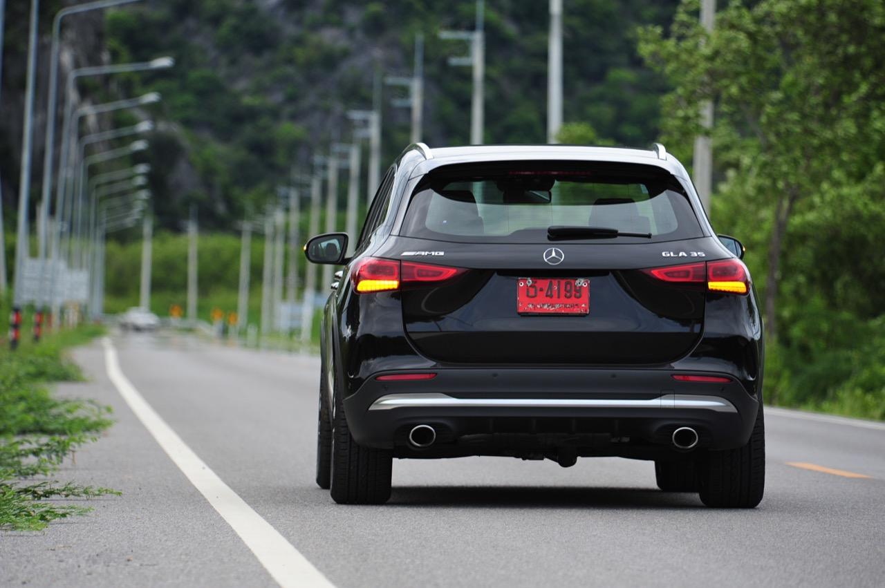 ออกนอกเมืองมาไม่ไกล เครื่องยนต์ AMG 2.0 ลิตรเทอร์โบ ฟื้นคืนชีพอีกครั้งในโหมด Sport + เพราะช่วงแรกของการขับทดสอบในเมืองค่อนข้างอึดอัด รวมถึงต้องคลานฝ่าสายฝนมาตลอดทาง ตั้งแต่เพชรบุรี ชะอำ ไปจนถึงบายพาสปราณบุรีด้วย Comfort Mode เจ้า AMG GLA35 รับมือกับผิวถนนที่เปียกชื้นได้ดี ช่วงล่างออกแนวหนึบๆ หนุบๆ จะแข็งก็ไม่ใช่ จะนิ่มก็ไม่เชิง ผมชอบช่วงล่างของ AMG CLA35 มากกว่า และอาจเป็นเพราะความสูงของ GLA35 ที่มากกว่า CLA35 ในการทำตัวเป็นครอสโอเวอร์พลังสูง เมื่อถนนโล่ง ผมกดคันเร่งจนมิดเพื่อดูการตอบสนองของเครื่องยนต์ M260 เมื่อคันเร่งถูกกระแทก เสียงท่อคำรามตามรอบเครื่องที่ถูกดันให้สูงขึ้นอย่างรวดเร็วและเสียงหวิดของเทอร์โบก็ดังเข้ามาให้ได้ยิน มันกระโจนผ่าน 6500 รอบอย่างว่องไว เกียร์คลัตช์คู่ 8 สปีดทำงานเนียนเหลือกำลังลาก จากการที่มีคลัตช์ถึงสองชุด เทคนิคการจูนอัตราทดให้กับเกียร์ 8 สปีด ทำให้ AMG GLA35 มีความจัดจ้านตั้งแต่ต้นยันปลาย ที่เกียร์ 6 รถก็ยังมีแรงดึงหนักหนาเอาเรื่อง การเร่งความเร็วทำได้ดีแทบจะไม่แตกต่างไปจาก AMG CLA35 ที่ผมเคยขับทดสอบเมื่อปีที่แล้ว การลดหรือเพิ่มเกียร์ผ่าน Paddle Shift หลังพวงมาลัย คุณจะค้นพบว่าเกียร์ตอบสนองได้ดีมากและมีระบบป้องกันการเปลี่ยนตำแหน่งเกียร์ที่ไม่สัมพันธ์กับรอบเครื่องยนต์ เพื่อป้องกันเกียร์กระจายอีกตะหาก