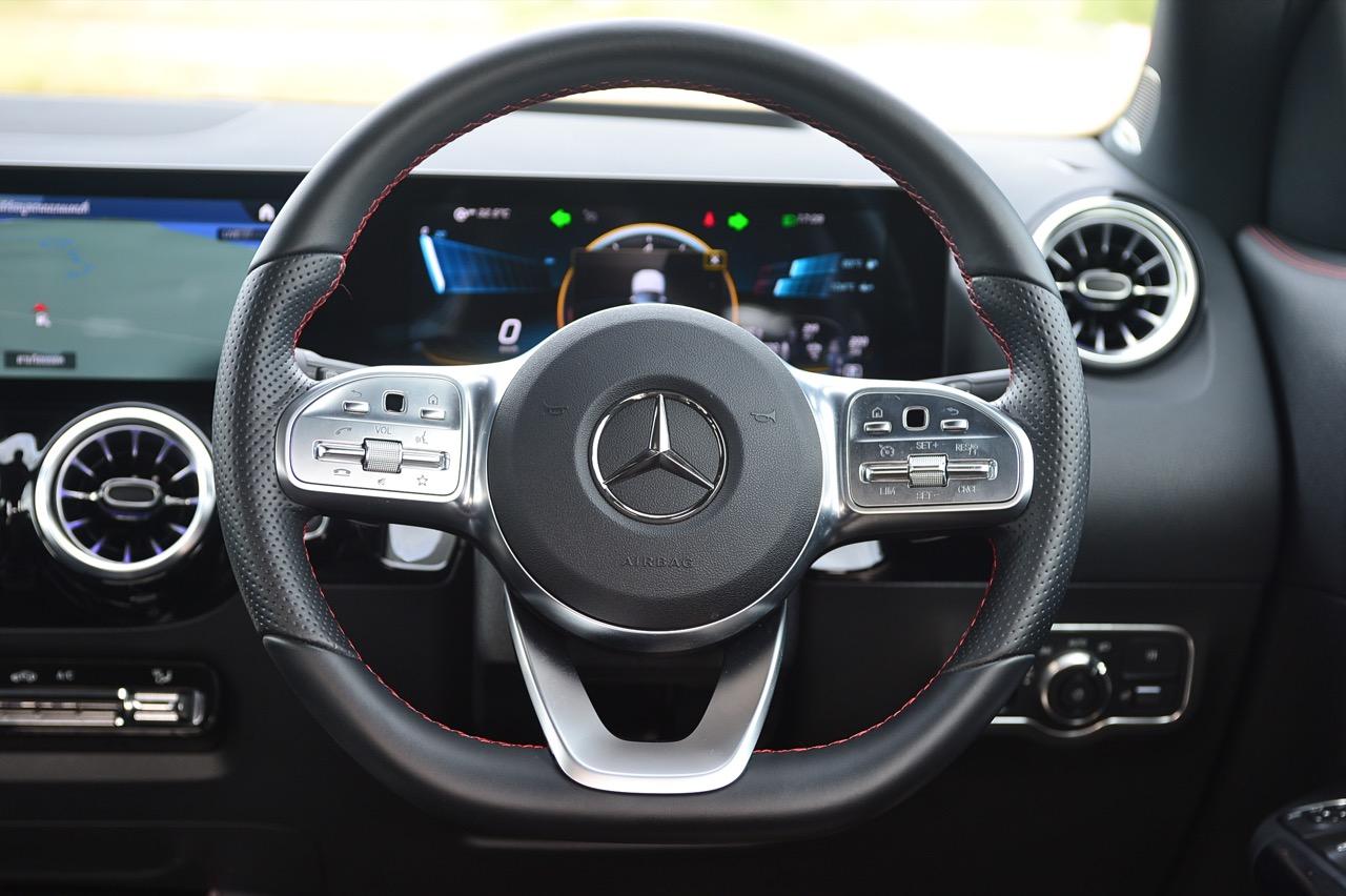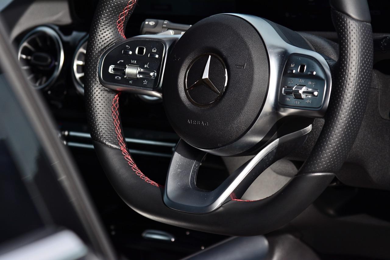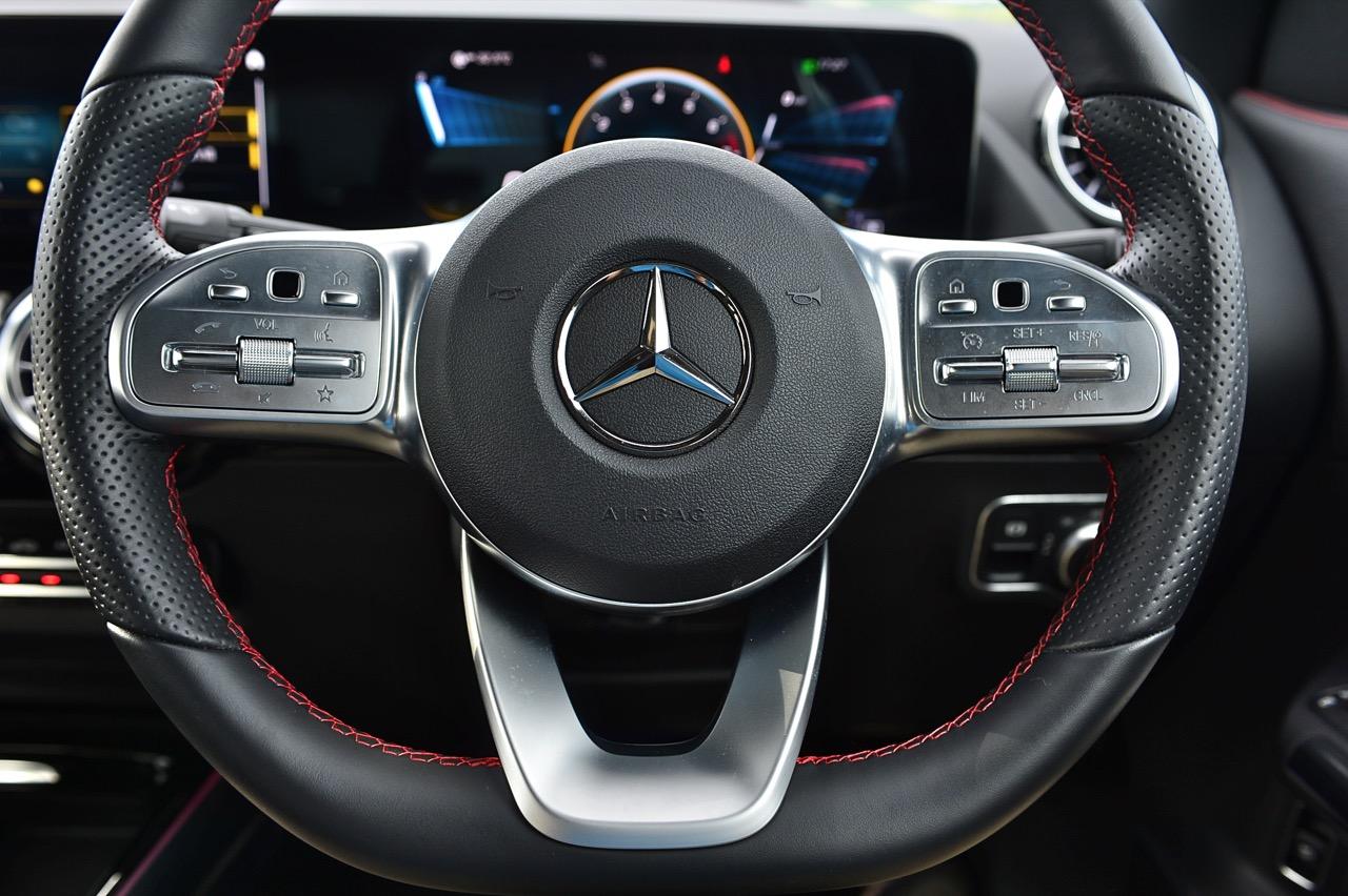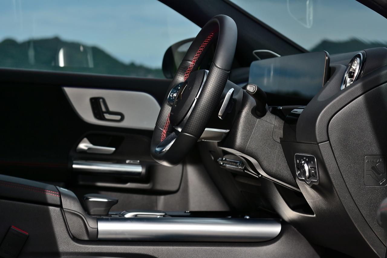 ยุคสุดท้ายของเครื่องยนต์ในประวัติศาสตร์การผลิตยานยนต์สมรรถนะสูงของ Mercedes-AMG® มีความพยายามในการยกระดับประสิทธิภาพของการควบคุม สมรรถนะด้านอัตราเร่ง กำลังในรูปของแรงบิดที่ต่อเนื่อง และไดนามิกส์โดยรวม หนึ่งในการเปลี่ยนแปลงที่โดดเด่นที่สุดใน GLA รุ่น 35 AMG ก็คือ พวงมาลัยประสิทธิภาพสูงจาก AMG® โดยภาพรวม พวงมาลัยของ AMG รุ่นใหม่ จะดูแตกต่างกันเล็กน้อย ขึ้นอยู่กับรุ่น แต่การออกแบบพื้นฐานและฟังก์ชันการใช้งานนั้นเหมือนกัน สวิตช์ควบคุมการทำงานของระบบต่างๆ เช่นการปรับตั้งหน้าจอภาพมาตรวัด การเลือกฟังก์ชันแสดงผล การเชื่อมต่อกับระบบมัลติมีเดียและโทรศัพท์บลูทูธ ระบบควบคุมความเร็วอัตโนมัติ การสั่งงานด้วยเสียงฯ AMG® Steering Wheel ผสมผสานศาสตร์ของการบังคับทิศทางเข้ากับฟังก์ชันการทำงานขั้นสุดยอด พวงมาลัย AMG แบบใหม่ นำเสนอการออกแบบที่แตกต่างจากรถสปอร์ตทั่วไปโดยใช้เอกลักษณ์ของรถ AMG ผนวกกับสไตล์การใช้งานแบบสปอร์ต ส่วนล่างที่แบนแบบฐานตัดเปิดพื้นที่เล็กๆ ในการเข้า-ออกจากเบาะคนขับ ขอบที่โค้งมนหุ้มหนังคล้ายกับพวงมาลัยรถแข่ง หนัง Nappa ถูกใช้เป็นวัสดุมาตรฐานในเกือบทุกรุ่น โดยบางรุ่นมีสีให้เลือก แป้นเปลี่ยนเกียร์ Paddle Shift ที่ติดตั้งบนพวงมาลัย ช่วยสร้างประสบการณ์การเปลี่ยนอัตราทดแบบสปอร์ต เมื่อใช้งานในโหมดเกียร์แมนนวล แต่ขนาดของแป้น Paddle Shift ใน GLA 35 มีขนาดที่เล็กกว่า CLA 35