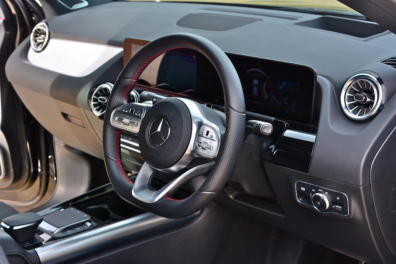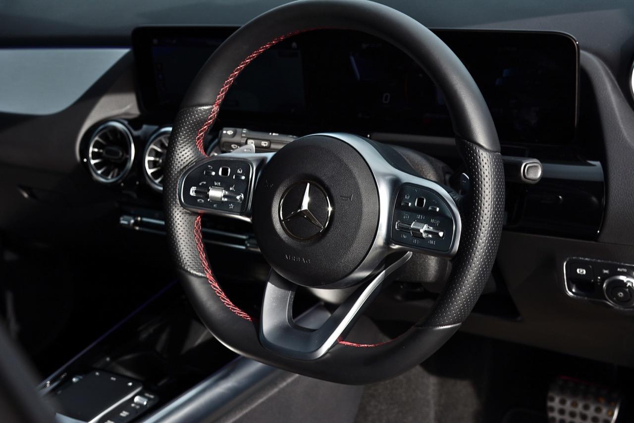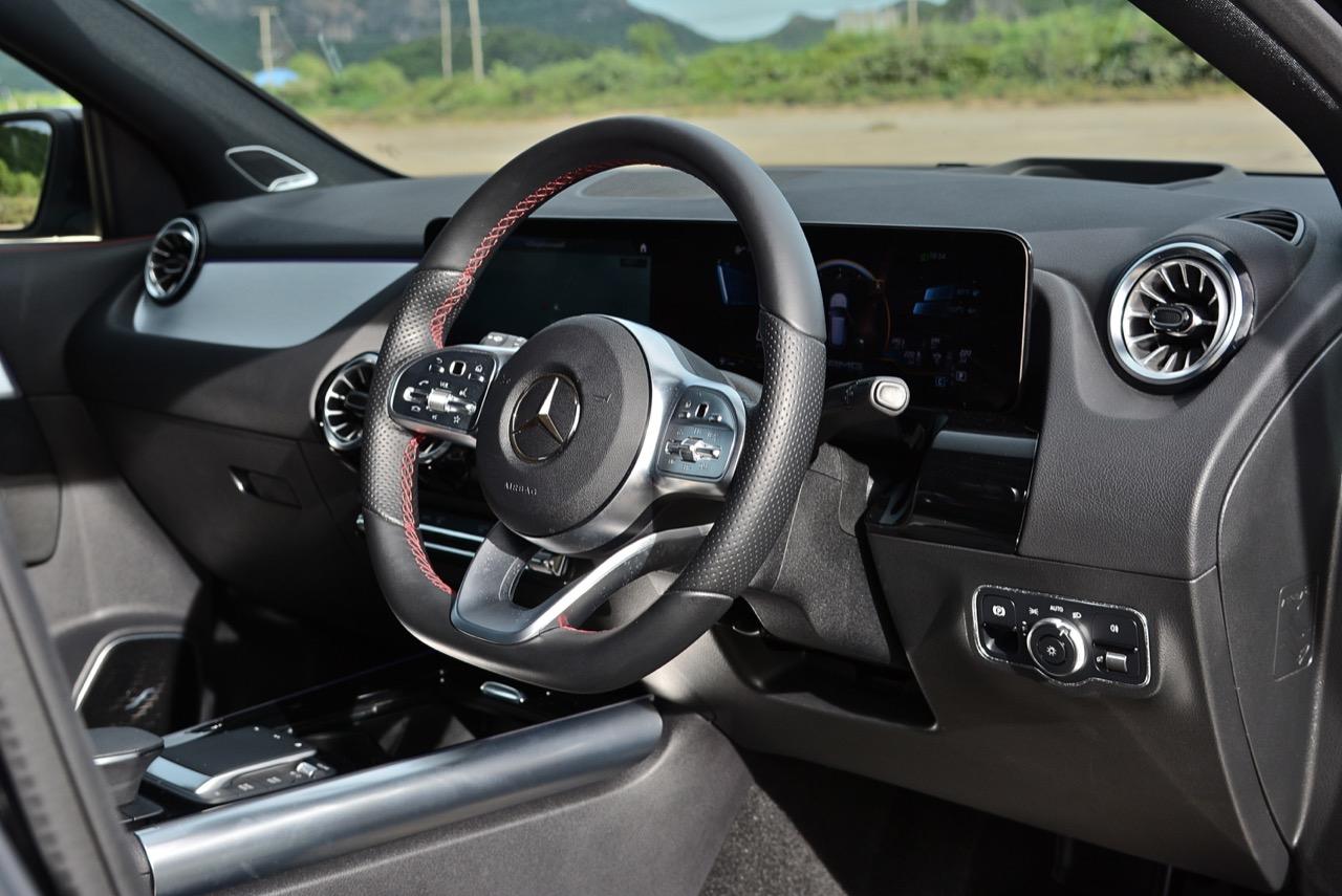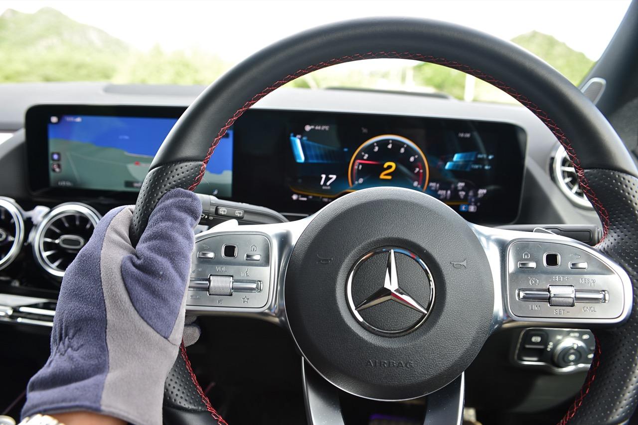 ยุคสุดท้ายของเครื่องยนต์ในประวัติศาสตร์การผลิตยานยนต์สมรรถนะสูงของ Mercedes-AMG® มีความพยายามในการยกระดับประสิทธิภาพของการควบคุม สมรรถนะด้านอัตราเร่ง กำลังในรูปของแรงบิดที่ต่อเนื่อง และไดนามิกส์โดยรวม หนึ่งในการเปลี่ยนแปลงที่โดดเด่นที่สุดใน GLA รุ่น 35 AMG ก็คือ พวงมาลัยประสิทธิภาพสูงจาก AMG® โดยภาพรวม พวงมาลัยของ AMG รุ่นใหม่ จะดูแตกต่างกันเล็กน้อย ขึ้นอยู่กับรุ่น แต่การออกแบบพื้นฐานและฟังก์ชันการใช้งานนั้นเหมือนกัน สวิตช์ควบคุมการทำงานของระบบต่างๆ เช่นการปรับตั้งหน้าจอภาพมาตรวัด การเลือกฟังก์ชันแสดงผล การเชื่อมต่อกับระบบมัลติมีเดียและโทรศัพท์บลูทูธ ระบบควบคุมความเร็วอัตโนมัติ การสั่งงานด้วยเสียงฯ AMG® Steering Wheel ผสมผสานศาสตร์ของการบังคับทิศทางเข้ากับฟังก์ชันการทำงานขั้นสุดยอด พวงมาลัย AMG แบบใหม่ นำเสนอการออกแบบที่แตกต่างจากรถสปอร์ตทั่วไปโดยใช้เอกลักษณ์ของรถ AMG ผนวกกับสไตล์การใช้งานแบบสปอร์ต ส่วนล่างที่แบนแบบฐานตัดเปิดพื้นที่เล็กๆ ในการเข้า-ออกจากเบาะคนขับ ขอบที่โค้งมนหุ้มหนังคล้ายกับพวงมาลัยรถแข่ง หนัง Nappa ถูกใช้เป็นวัสดุมาตรฐานในเกือบทุกรุ่น โดยบางรุ่นมีสีให้เลือก แป้นเปลี่ยนเกียร์ Paddle Shift ที่ติดตั้งบนพวงมาลัย ช่วยสร้างประสบการณ์การเปลี่ยนอัตราทดแบบสปอร์ต เมื่อใช้งานในโหมดเกียร์แมนนวล แต่ขนาดของแป้น Paddle Shift ใน GLA 35 มีขนาดที่เล็กกว่า CLA 35