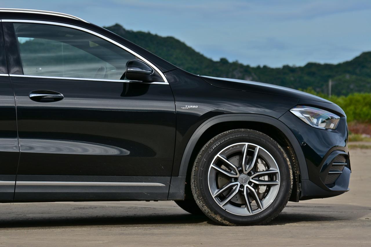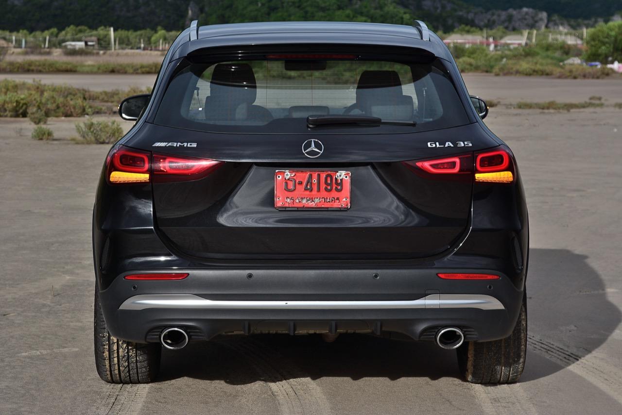 กระจังหน้า AMG-specific radiator grille เชื่อมโยงความดุดันตามแบบฉบับรถยนต์สมรรถนะสูงจาก AMG ไฟหน้า LED ไฟหรี่กลางวัน LED Daytime Running Light ฝากระโปรงหน้าแบบเพาเวอร์โดรม ยกสันนูนเพื่อให้เข้ากับทรงของกระจังและไฟหน้า ด้านข้างซุ้มล้อหุ้มพลาสติกกันกระแทกสีดำ ชายล่างของบานประตู ตกแต่งด้ยพลาสติกสีเงิน แรคหลังคาอัลลอยสีเงิน กรอบกระจกและแถบมือจับประตูตกแต่งด้วยโลหะสีเงิน แก้มข้างพร้อมตราสัญลักษณ์ Turbo 4Matic ด้านหลังลุคสปอร์ตด้วยปลายท่อไอเสีย 2 ท่อ ตกแต่งโครเมียม สปอยเลอร์ด้านหลังบนฝากระโปรงท้าย AMG spoiler lip มิติตัวถังของดาวเล็กสายแรง AMG GLA35 4Matic มีขนาดความยาว 4,445 มิลลิเมตร กว้าง 1,804 มิลลิเมตร สูง 1,479 มิลลิเมตร ความยาวฐานล้อ 2,699 มิลลิเมตร ระยะห่างจากพื้นถึงใต้ท้องรถ 183 มิลลิเมตร พื้นที่เก็บสัมภาระท้าย (พับเบาะหลัง) 1,235 ลิตร น้ำหนัก 1,667 กิโลกรัม ความจุถังเชื้อเพลิง 56 ลิตร ล้ออัลลอย AMG ขอบ 19 นิ้ว ลายคล้าย AMG CLS53 แต่มีขนาดเล็กกว่า ห่อรัดด้วยยาง Continental Cross Contac ยางล้อหน้าและหลังเท่ากันที่ ไซส์ 235/50 R19 ช่วงล่างหน้า-หลัง AMG Ride Control Sports Suspension ระบบเบรกด้านหน้าใช้คาลิปเปอร์เบรก AMG 4 พอต ด้านหลังคาลิปเปอร์แบบซิงเกิลพอต