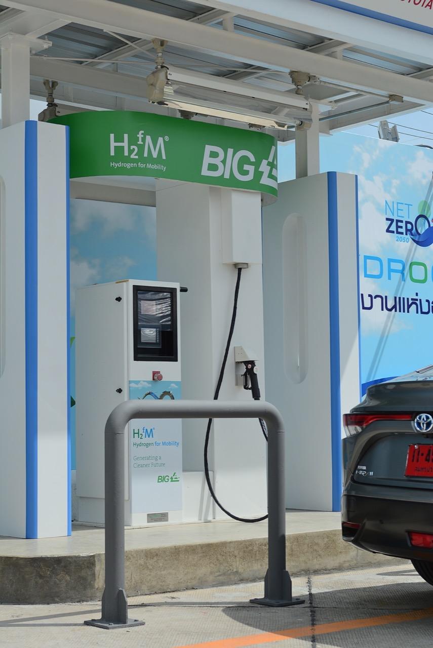 1 ไฮโดรเจนถูกเติมให้กับ MIRAI ที่สถานีเติมเชื้อเพลิง โดยมีขั้นตอนและระยะเวลาในการเติมเท่ากับรถยนต์ปกติที่เติมน้ำมัน