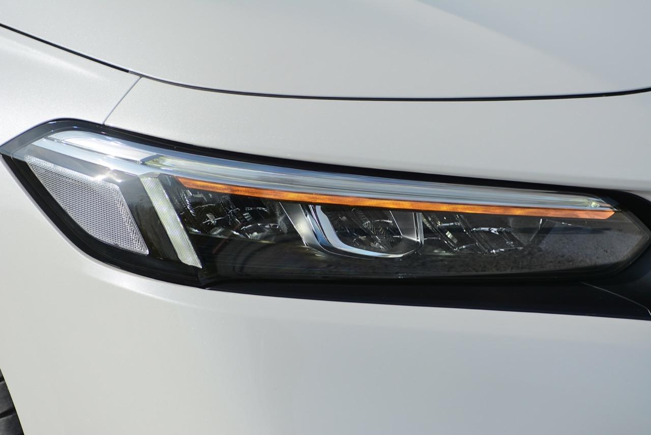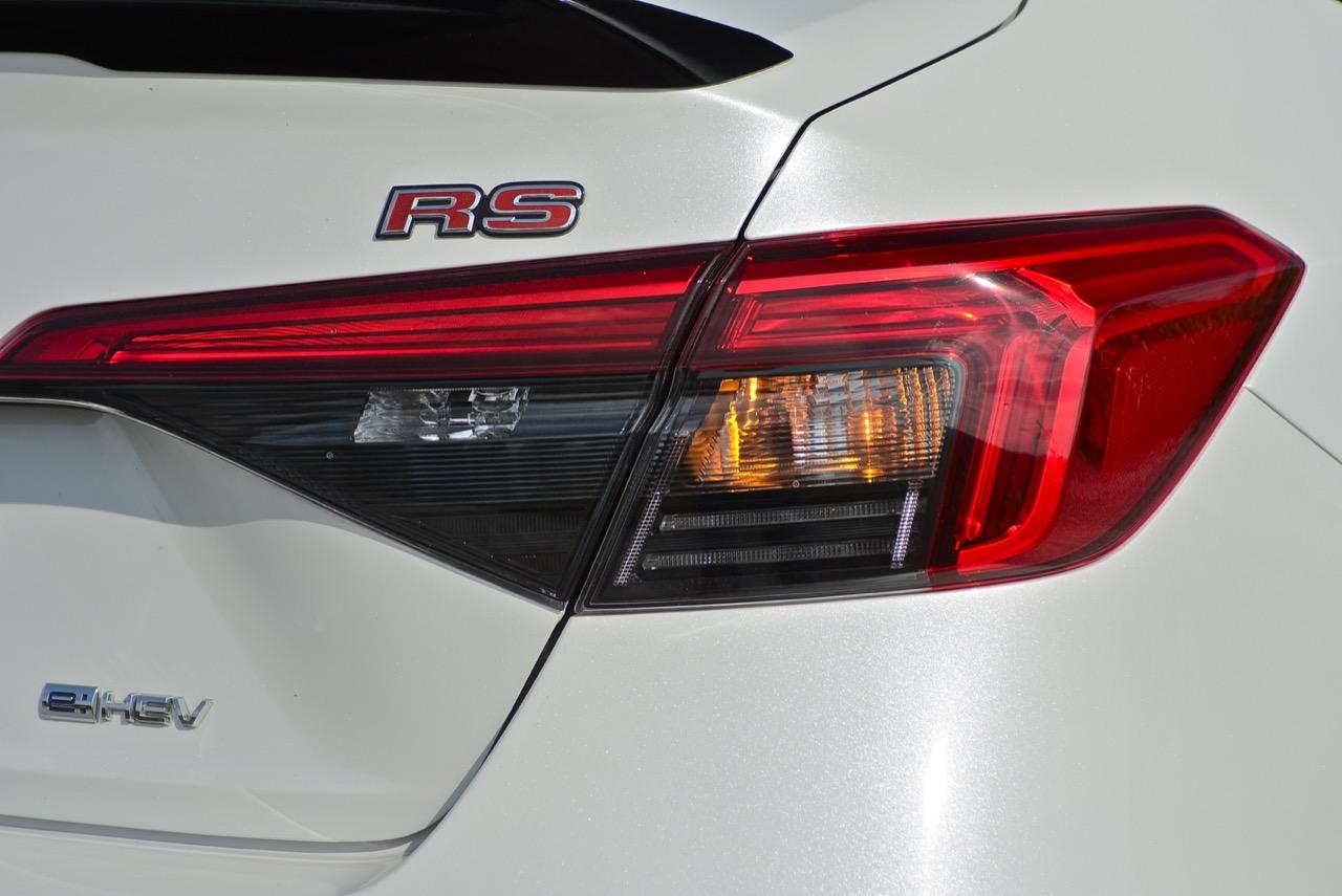 Civic FE รุ่นท็อปสุด RS e:HEV มีจุดเด่นตรงที่ส่วนกระจังหน้าโหนกนูน ไฟหน้า LED พร้อมระบบยกหรือลดไฟสูงอัตโนมัติมีไฟ LED Daytime Running Light พร้อมกับไฟเลี้ยว LED อยู่ภายใต้กรอบไฟเดียวกัน กระจังหน้าเรียวเล็ก แปะตราสัญลักษณ์ RS เพื่อบ่งบอกตัวตนถึงความเป็น Civic รุ่นสูงสุด ตัวอักษร H โทนสีน้ำเงินบ่งบอกตัวตนถึงรุ่น e:HEV กันชนหน้าปิดคลุมส่วนหน้าของรถเกือบทั้งหมด เวอร์ชัน RS จะมีชุดแต่งที่แตกต่างไปจากรุ่น EL โดยเฉพาะการตกแต่งชิ้นงานรอบตัวถังด้วยพลาสติกสีดำเงาแนว Black Edition กันชนหน้าออกแบบช่องรับอากาศโดยใช้พลาสติกสีเทาดำ โดยเฉพาะบริเวณมุมของกันชนซึ่งเป็นที่อยู่ของไฟตัดหมอก LED ฝากระโปรงหน้าเรียบหรูมีการยกสันนูนบริเวณขอบของไฟหน้าเพื่อสร้างความเชื่อมโยงกับแก้มข้าง ไฟหน้า LED มาพร้อมระบบไฟอัตโนมัติ ทำงานโดยยกหรือลดไฟสูงขณะขับตอนกลางคืนบนถนนที่ปราศจากแสงไฟ โดยภาพรวม กระจังหน้าและกันชนหน้าดีไซน์ใหม่ ค่อนข้างลงตัว โดยเฉพาะไฟหน้าที่มากับระบบยกหรือลดไฟสูงอัตโนมัติ พร้อมไฟส่องสว่างสำหรับการขับขี่ในเวลากลางวัน ไฟตัดหมอกคู่หน้า ไฟท้าย LED แบบ C line ที่ใช้เทคนิค Fine Cut เอกลักษณ์เฉพาะของ Honda ที่ควบคุมการกระจายแสงสว่างอย่างสม่ำเสมอ ให้แสงไฟชัดเจน