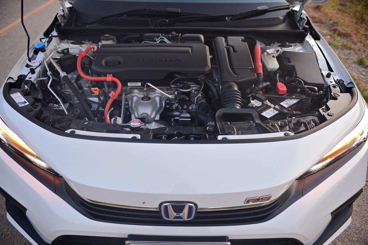 Civic RS รุ่น 1.5 เทอร์โบ มีกำลังสูงสุดรวม 178 แรงม้า แรงบิดอยู่ที่ 240 นิวตันเมตร แต่รุ่น RS e:HEV ที่ผมเอามาขับทดสอบหลังจากออกขายมาได้สักระยะหนึ่ง มีกำลังมากกว่าที่ 184 แรงม้า ในย่าน 5,000 - 6,000 ต่อนาที ถือว่ารอบจัดพอใช้ได้ ส่วนแรงบิดใส่มาให้มากถึง 315 นิวตันเมตรในย่าน 0-2000 รอบต่อนาที เน้นเทแรงบิดสูงสุดในรอบต่ำ เพื่อการออกตัวจากจุดหยุดนิ่งที่คล่องแคล่วว่องไวระบบรองรับของ Civic e:HEV ด้านหน้าแบบแมคเฟอร์สัน สตรัท สปริง โช้คอัพและเหล็กกันโคลง สำหรับกันสะเทือนด้านหลังเป็นแบบมัลติลิงค์ ช่วงล่างชุดใหม่ทำให้สัดส่วนความสูงลดลงเล็กน้อย เหล็กกันโคลงมีการเพิ่มความหนาขึ้นอีกนิดเพื่อความแข็งแรง เข้ายึดซับเฟรมช่วงล่างติดกับตัวถังถูกขั้นด้วย Hydraulic Suspension Bushing ช่วยซับแรงสั่นสะเทือน ระบบบังคับเลี้ยวยังคงใช้พวงมาลัยไฟฟ้า Dual Pinion Variable Ratio Electric Power Assisted Rack and Pinion Steering มีการปรับปรุงการทำงานคล้ายกับพวงมาลัยไฟฟ้าติดตั้งมอเตอร์ทั่วไป แต่สิ่งที่แตกต่างจากพวงมาลัยไฟฟ้าแบบอื่นๆ ก็คือนอกจากจะใช้มอเตอร์ผ่อนแรงหมุนเหมือนกันแล้ว อัตราทดของพวงมาลัยยังแปรผันไปตามความเร็วได้แบบอัตโนมัติ เป็นการเพิ่มเติมประสิทธิภาพของชุดบังคับเลี้ยวให้ดีขึ้นกว่าที่เคยมีมา น้ำหนักที่ผกผันไปตามความเร็วมีทั้งเบาสบายมือในย่านความเร็วต่ำ และตึงกระชับสอดรับกับการใช้ความเร็ว ส่วนห้ามล้อใช้ดิสเบรกหน้า-หลัง จานดิสหน้ามีช่องระบายความร้อน พร้อมกับระบบช่วยเบรก เช่น ระบบป้องกันล้อล็อก ABS ระบบกระจายแรงเบรก EBD ระบบช่วยออกตัวบนทางลาดชัน HAS ระบบช่วยควบคุมการทรงตัว VSA