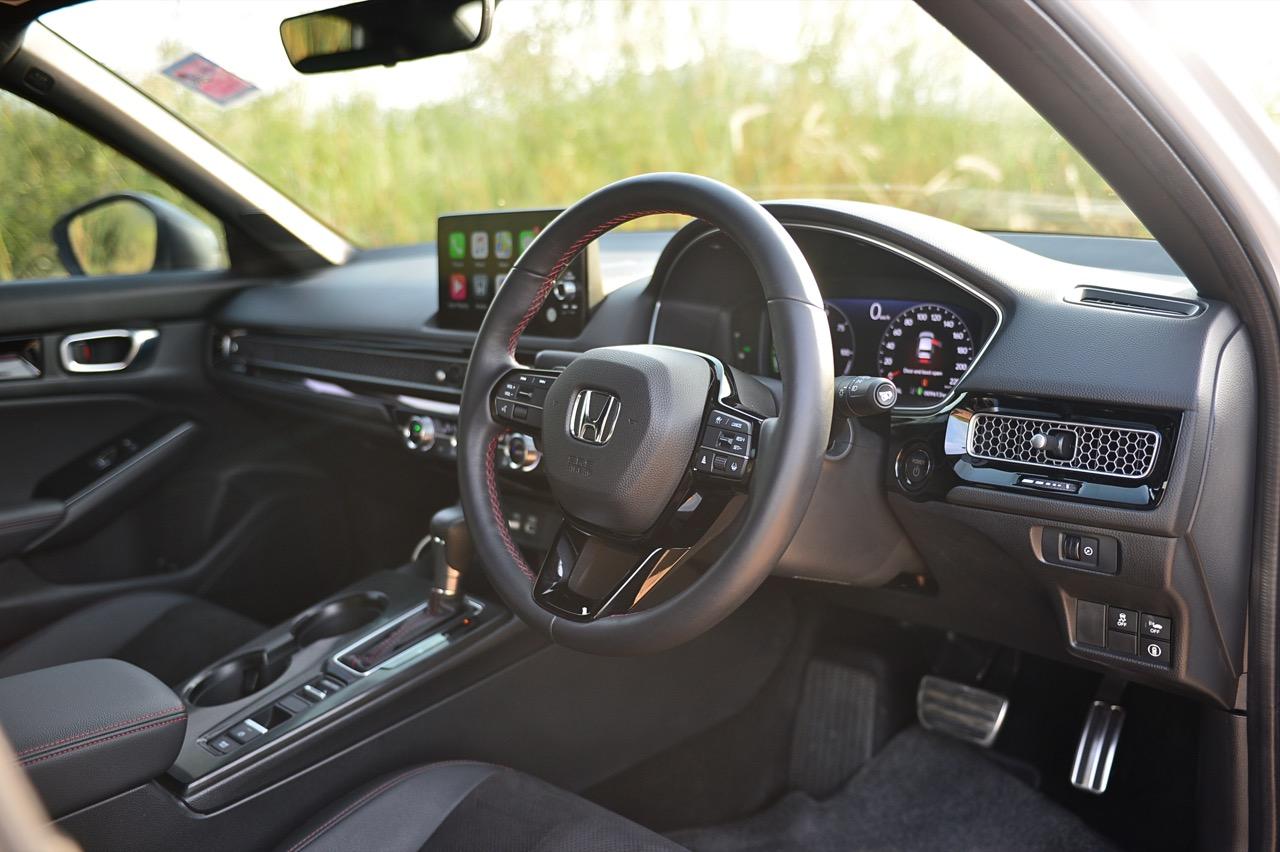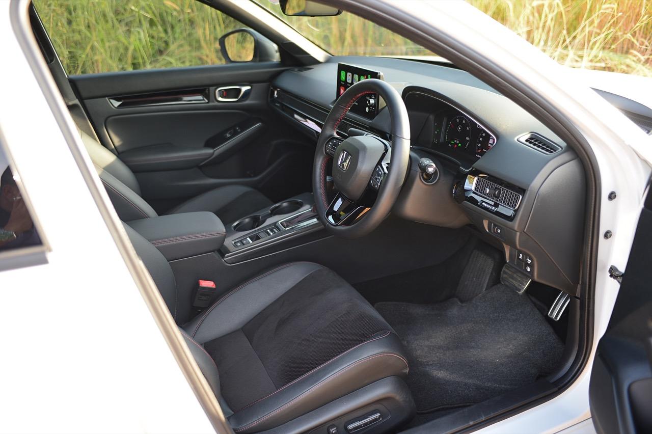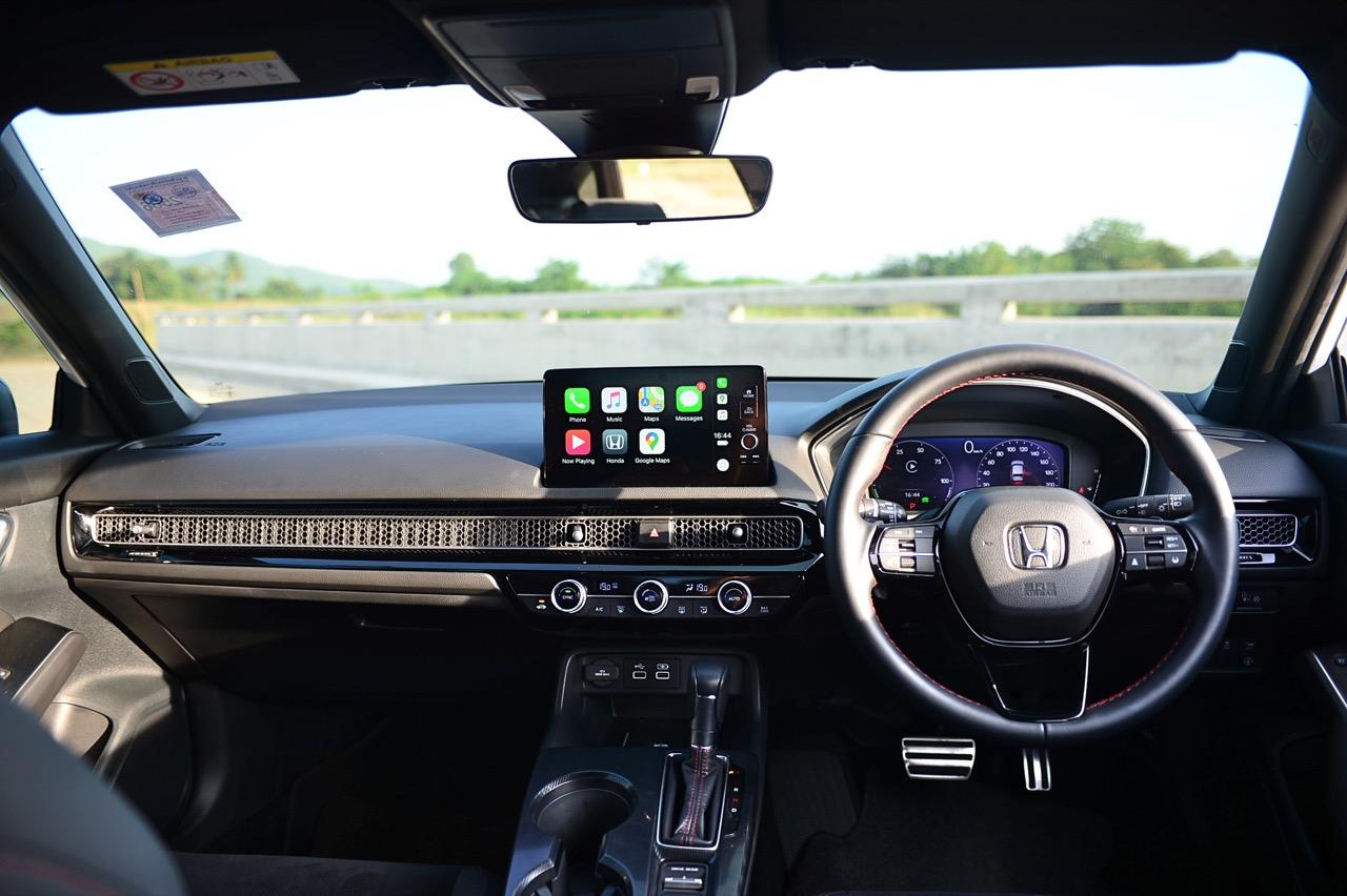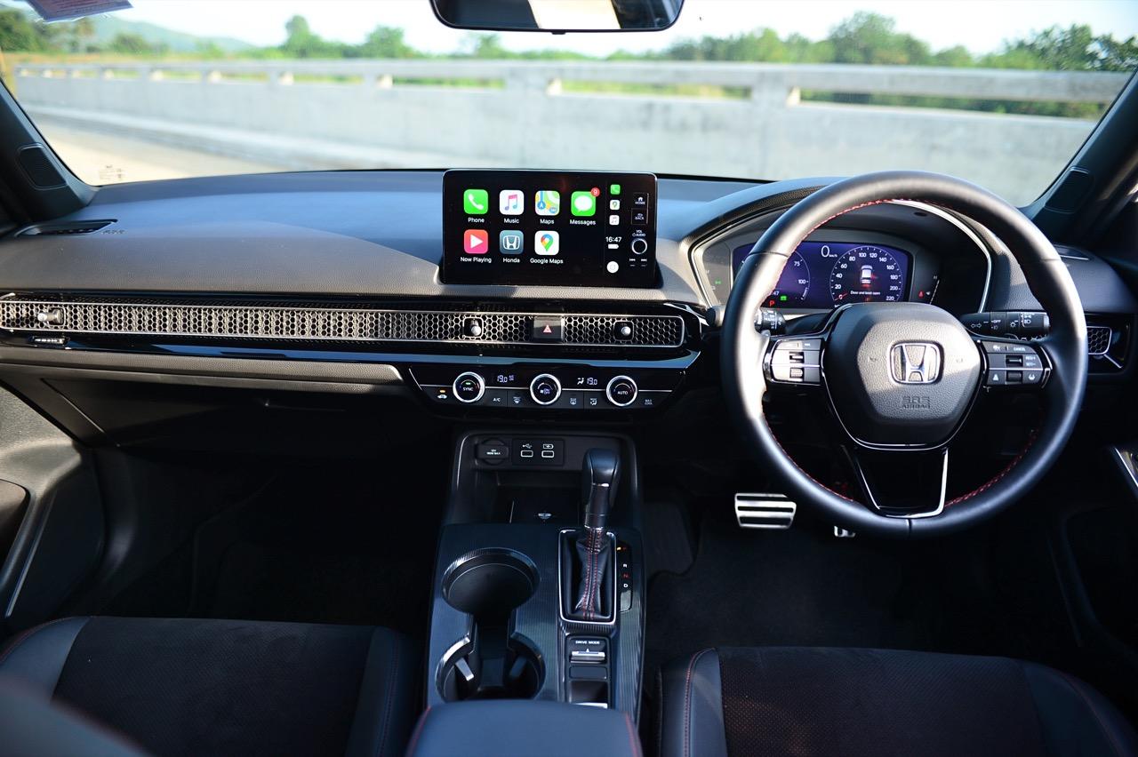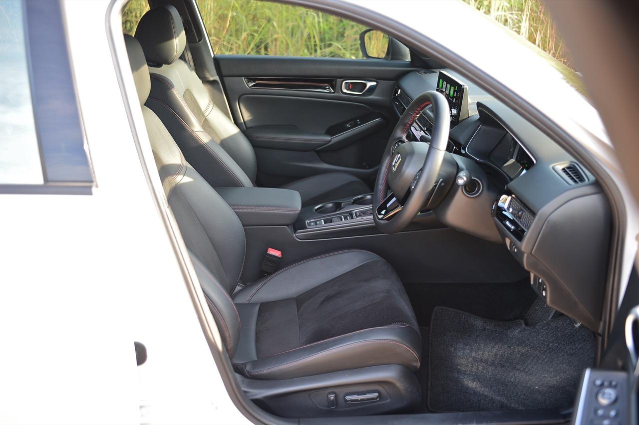 ห้องโดยสารของ Civic RS e:HEV มีการออกแบบที่ Honda เรียกว่า “Fine Morning” เน้นการสร้างความรู้สึกที่แปลกใหม่ของงานตกแต่ง แดชบอร์ดคอนโซลที่ห่อหุ้มด้วยไวนิลแบบผิวสัมผัสนุ่ม ความสะดวกสบายเข้าไปนั่งในห้องโดยสาร วัสดุและรูปแบบของเบาะตัวใหม่ ลามไปถึงเบาะหลังที่มีพื้นที่กว้างมากพอ งานตกแต่งด้วยพลาสติก หนังเทียมและผ้าเนื้อดีที่ทำให้ผิวสัมผัสเปลี่ยนไปในทางที่ดีขึ้น FE มาพร้อมคอนโซลหน้าดีไซน์ใหม่ จัดวางเลย์เอาต์และฟังก์ชันการใช้งานให้ลงตัว ด้วยรูปแบบใหม่ที่ฉีกออกไปจาก Civic รุ่นที่แล้วแบบหน้ามือเป็นหลังมือ มันยังทำตัวได้ดีเมื่อลองนั่งในเบาะผู้โดยสารตอนหลัง เบาะแบบใหม่หุ้มด้วยไมโครไฟเบอร์ที่ให้ผิวสัมผัสคล้ายกับหนังกลับ Alcantara สะดวกสบายยิ่งขึ้นกับเบาะที่นั่งคนขับที่ได้รับการปรับปรุงใหม่ พร้อมโครงสร้างแผ่นเรซินรองรับสรีระแบบเต็มพื้นที่ ตั้งแต่ช่วงหลังส่วนบน กระดูกเชิงกราน จนถึงต้นขา เพื่อให้ได้ความรู้สึกในการนั่งที่โอบกระชับและรับน้ำหนักได้อย่างสมดุล เบาะคู่หน้าปรับไฟฟ้า เบาะทุกตำแหน่งเย็บเดินตะเข็บด้วยด้ายสีแดง ซึ่งแสดงออกถึงความเป็นรถ Honda ในเวอร์ชัน RS