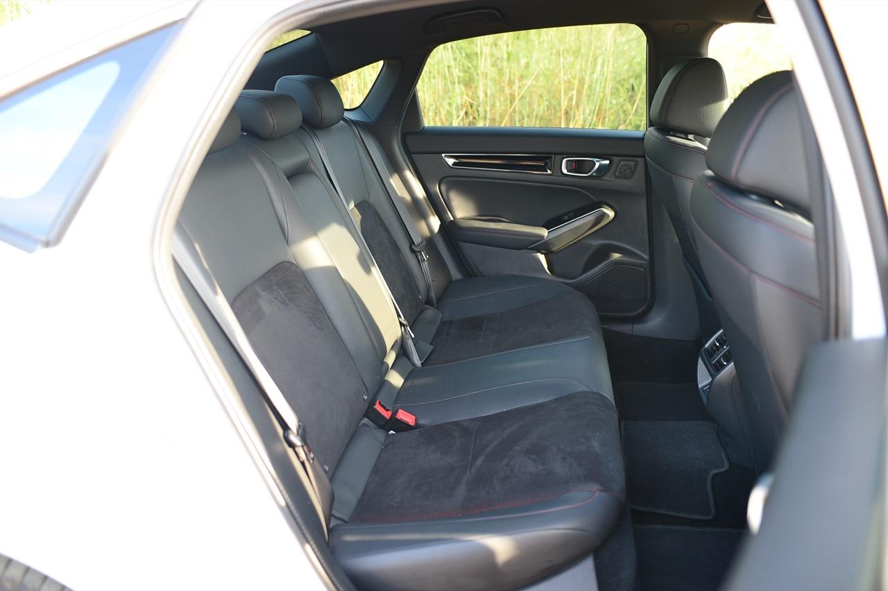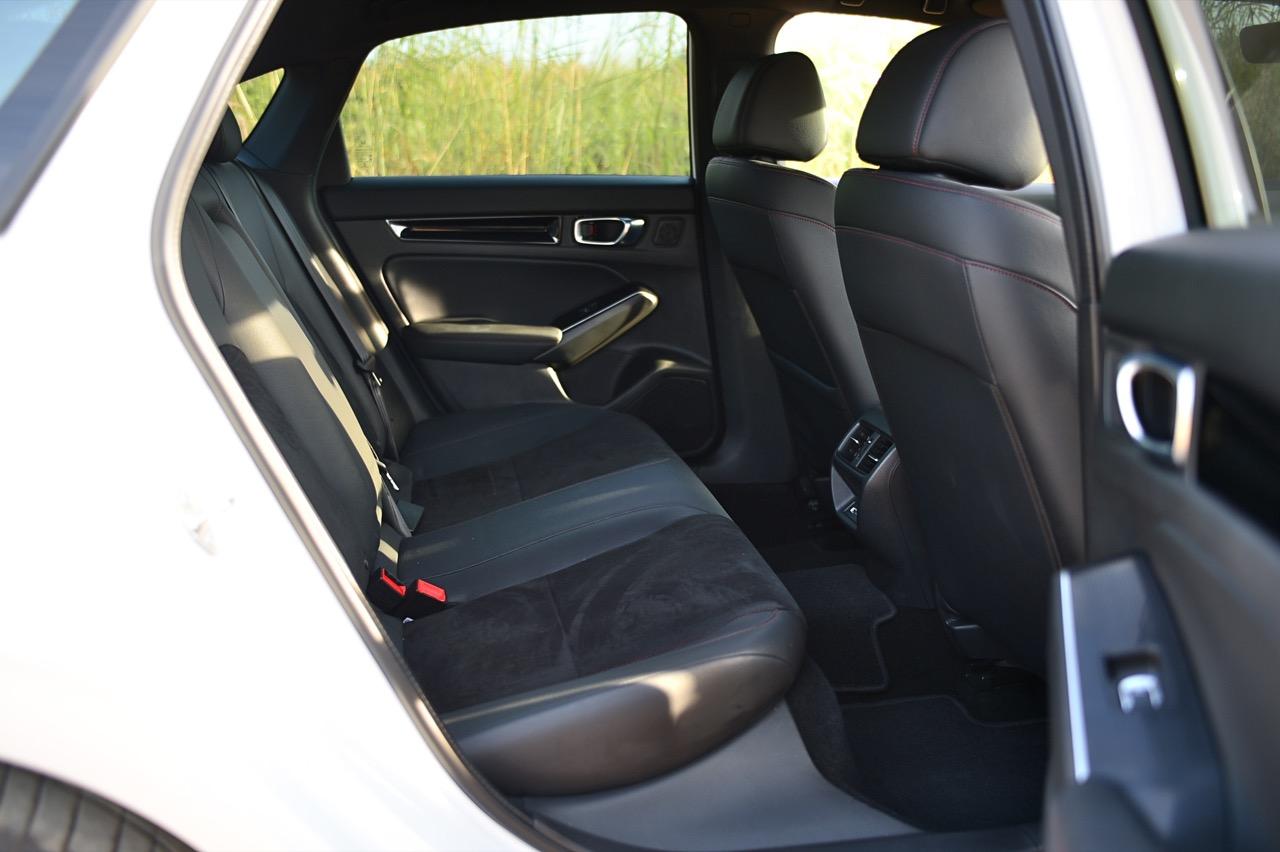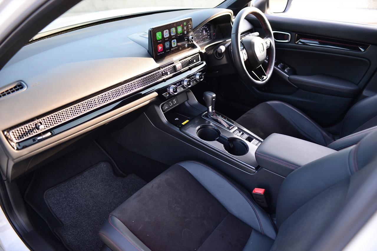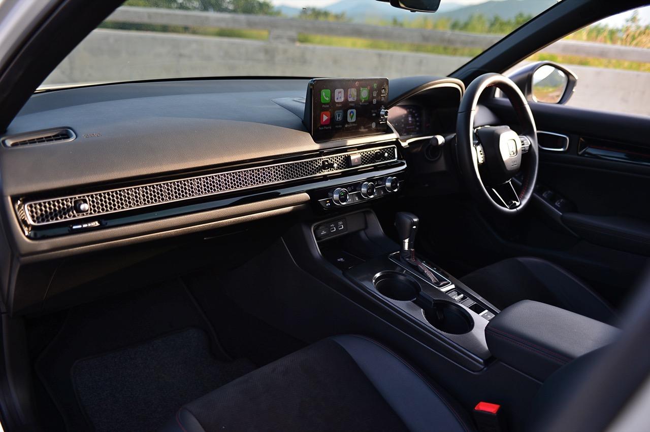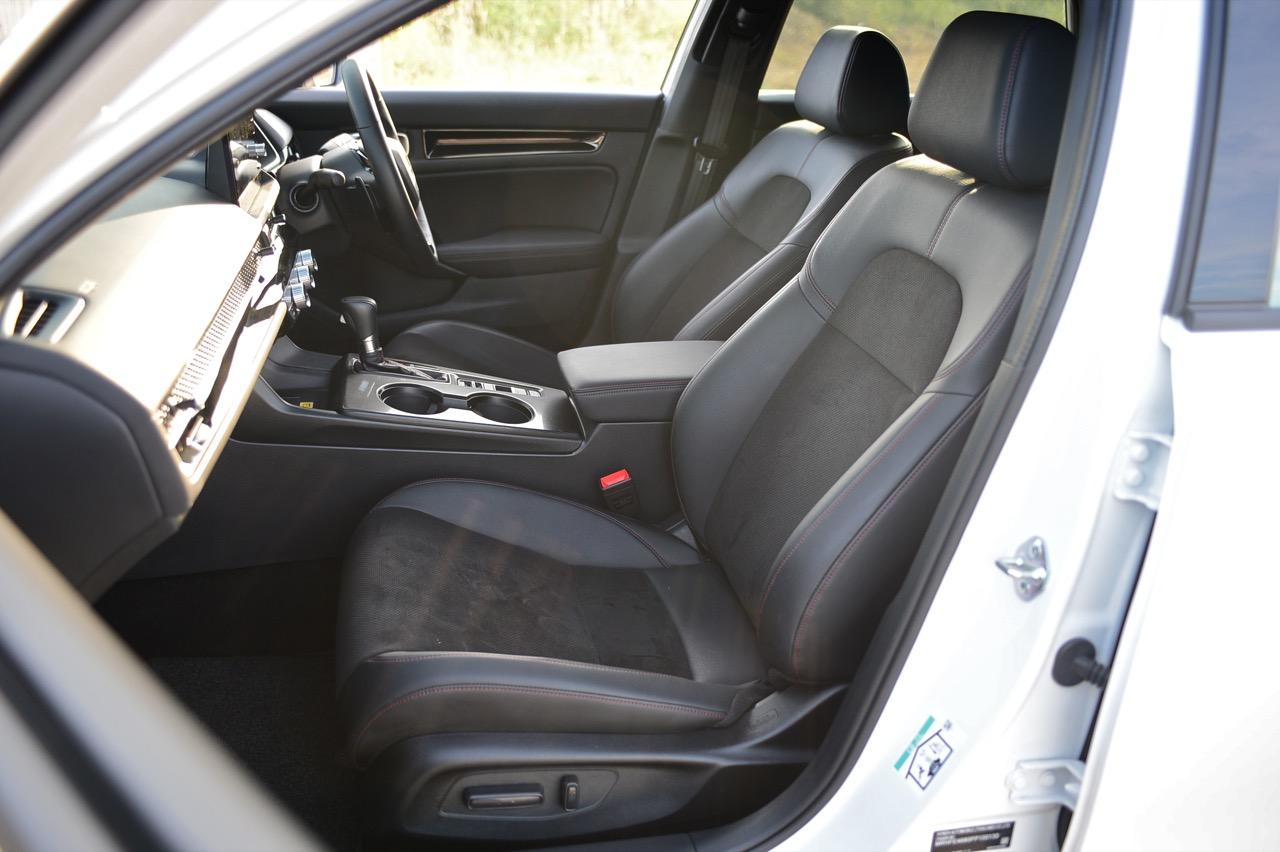 ห้องโดยสารของ Civic RS e:HEV มีการออกแบบที่ Honda เรียกว่า “Fine Morning” เน้นการสร้างความรู้สึกที่แปลกใหม่ของงานตกแต่ง แดชบอร์ดคอนโซลที่ห่อหุ้มด้วยไวนิลแบบผิวสัมผัสนุ่ม ความสะดวกสบายเข้าไปนั่งในห้องโดยสาร วัสดุและรูปแบบของเบาะตัวใหม่ ลามไปถึงเบาะหลังที่มีพื้นที่กว้างมากพอ งานตกแต่งด้วยพลาสติก หนังเทียมและผ้าเนื้อดีที่ทำให้ผิวสัมผัสเปลี่ยนไปในทางที่ดีขึ้น FE มาพร้อมคอนโซลหน้าดีไซน์ใหม่ จัดวางเลย์เอาต์และฟังก์ชันการใช้งานให้ลงตัว ด้วยรูปแบบใหม่ที่ฉีกออกไปจาก Civic รุ่นที่แล้วแบบหน้ามือเป็นหลังมือ มันยังทำตัวได้ดีเมื่อลองนั่งในเบาะผู้โดยสารตอนหลัง เบาะแบบใหม่หุ้มด้วยไมโครไฟเบอร์ที่ให้ผิวสัมผัสคล้ายกับหนังกลับ Alcantara สะดวกสบายยิ่งขึ้นกับเบาะที่นั่งคนขับที่ได้รับการปรับปรุงใหม่ พร้อมโครงสร้างแผ่นเรซินรองรับสรีระแบบเต็มพื้นที่ ตั้งแต่ช่วงหลังส่วนบน กระดูกเชิงกราน จนถึงต้นขา เพื่อให้ได้ความรู้สึกในการนั่งที่โอบกระชับและรับน้ำหนักได้อย่างสมดุล เบาะคู่หน้าปรับไฟฟ้า เบาะทุกตำแหน่งเย็บเดินตะเข็บด้วยด้ายสีแดง ซึ่งแสดงออกถึงความเป็นรถ Honda ในเวอร์ชัน RS