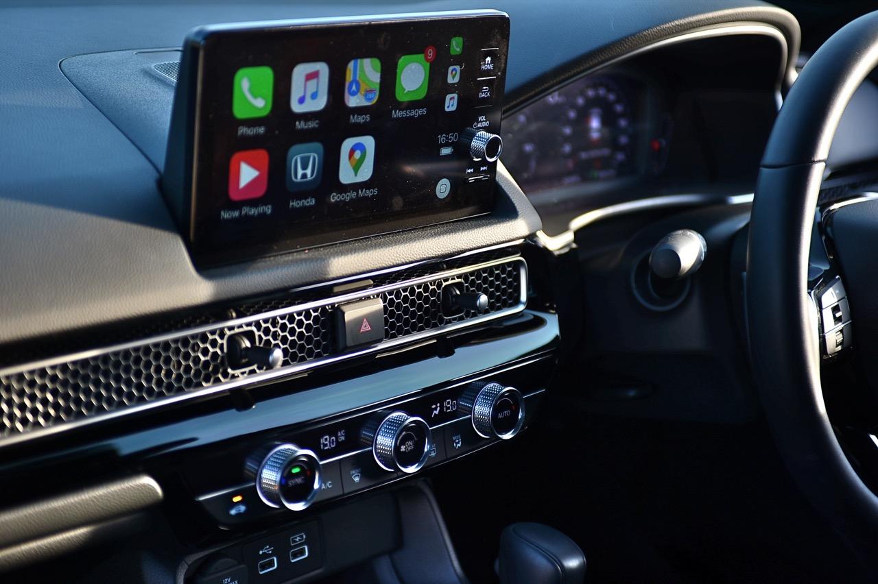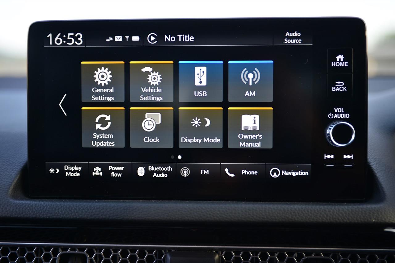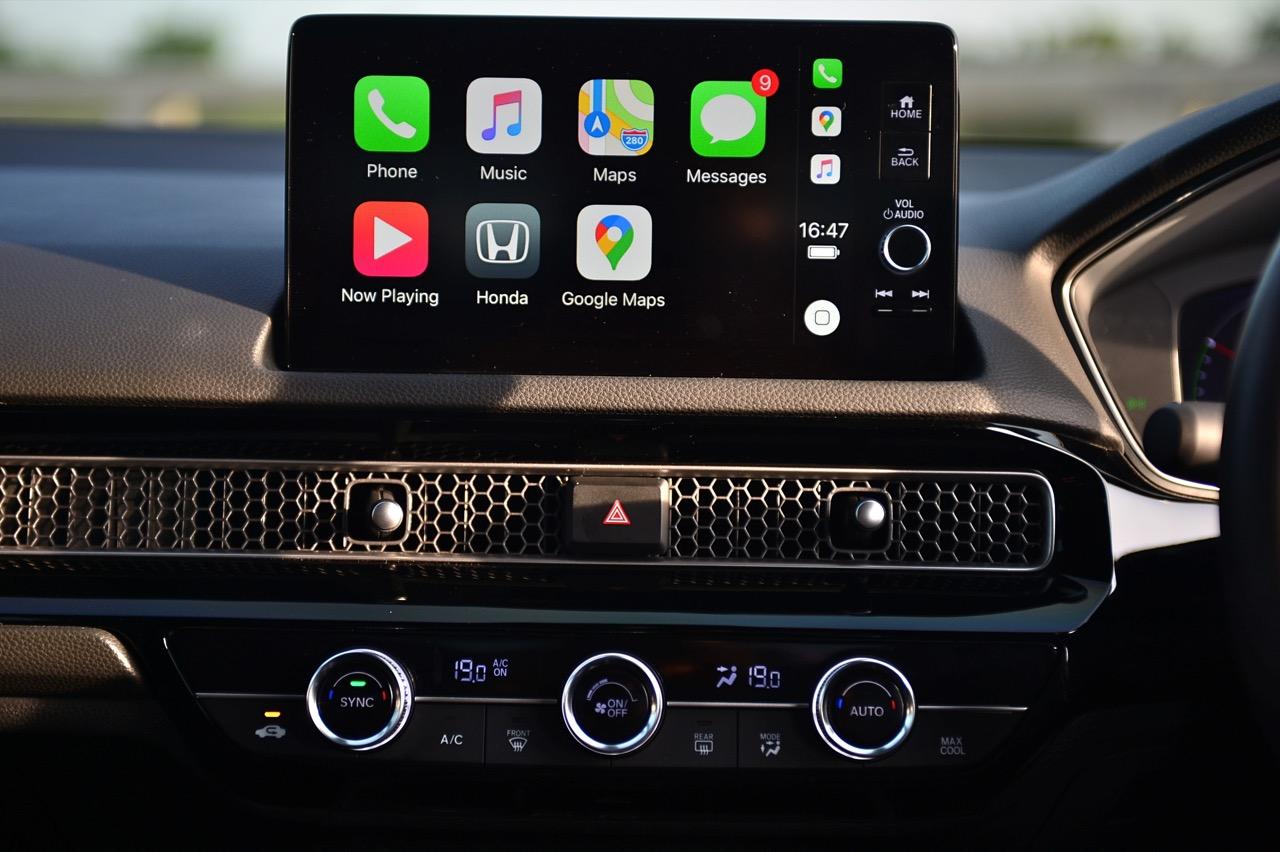คอนโซลของ Civic ใหม่ ทำให้นึกไปถึงคอนโซลของ BMW Series-3 f30 รุ่นที่แล้ว โดยเฉพาะตำแหน่งของจอภาพมอนิเตอร์กลาง จอภาพกลางสั่งงานด้วยระบบสัมผัส ขนาด 9 นิ้ว มีความคมชัดใช้ได้ บรรจุฟังก์ชันการใช้งานครบ ทั้งระบบอินโฟเทนเมนต์ การเชื่อมต่อสื่อสารต่างๆ ระบบบลูทูธซึ่งกลายเป็นของที่ขาดไม่ได้สำหรับรถยนต์ยุคใหม่ Honda ออกแบบหน้าจอได้ดีตรงที่มีปุ่มปรับความดังของลำโพงติดอยู่ข้างจอภาพด้านขวา มันรองรับ Apple CarPlay แบบไม่ต้องเสียบสายให้วุ่นวายอีกต่อไป กล่องเก็บของใต้คอนโซลกลางสำหรับวางโทรศัพท์เพื่อชาร์จไฟ ส่วนโทรศัพท์ที่จะชาร์จได้คงต้องเป็นรุ่นใหม่อย่างแน่นอนที่สุดเพราะลองเอา iPhone 7 ลงไปวางก็ยังนิ่งเงียบไม่มีไฟเข้าแต่อย่างใดทั้งสิ้น Honda ยังให้ช่องเสียบไฟแบบ 12V 180W มาให้ คู่กับช่อง USB สำหรับโทรศัพท์ที่หิวกระหายการชาร์จ ส่วนจอภาพก็มาครบทั้งเนวิเกเตอร์ กล้องมองด้านหลังและด้านข้าง (ซ้าย) คำนวณระยะทางและอัตราสิ้นเปลือง ความคมชัดของจอเมื่อลองเล่นโหมด VDO ผ่าน USB ดูถือว่าใช้ได้เลยทีเดียว