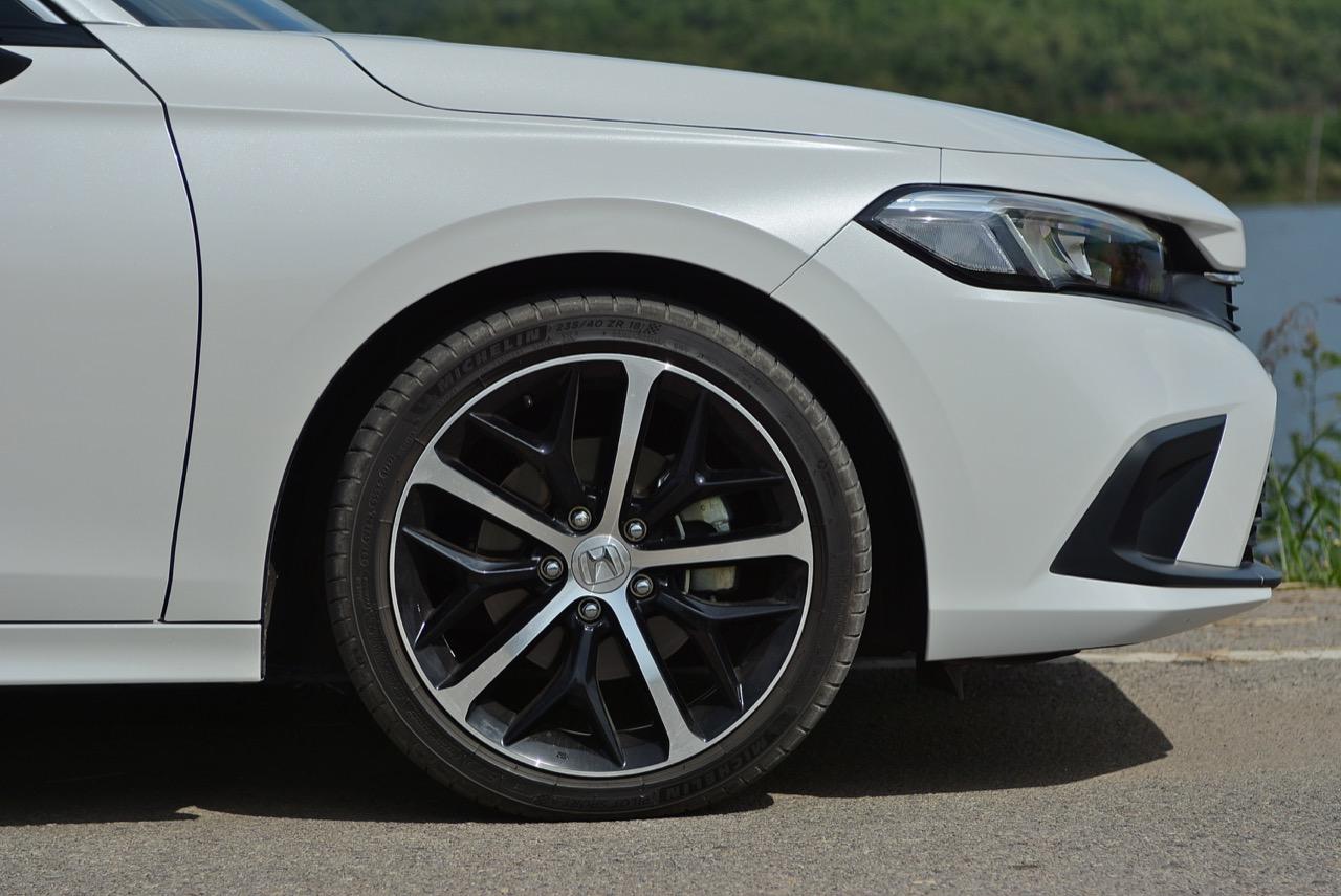 หลายวันมาแล้วที่ช่วงล่างใน Civice e:HEV สามารถรับมือกับสภาพผิวถนนที่มีความหลากหลายได้ดี ช่วงล่างที่เซตค่ามาใหม่ แตกต่างไปจาก Civic รุ่นที่ผ่านมา ในด้านของความนุ่มนวล กระชับและสอดรับกับสภาพถนนในไทย การขับบนถนนสารพัดรูปแบบ ช่วงล่างจะต้องเจอกับผิวถนนที่ไม่เรียบ Civic RS ไฮบริด มีความสบายมากกว่าเดิม จากโช้คอัพและสปริงที่คอยผ่อนสั้นผ่อนยาว ทำให้นั่งขับทางไกลได้โดยไม่มีอาการเหนื่อยล้า ยางติดรถ Pilot Sport 4 ไซส์ 235/40ZR18 มีประสิทธิภาพในด้านการยึดเกาะกับผิวถนนที่สูงมาก แต่เสียงการทำงานของยางจะดังกว่ายาง Yokohama ขอบ 17 นิ้วใน RS 1.5 Turbo เมื่อบดลงไปบนพื้นถนน การยึดเกาะของยางที่ออกมาแบบมาสำหรับรถสปอร์ตพลังสูง ให้สัมผัสถึงกริ้บที่หนึบแน่นเหมือนกับยางสปอร์ตพันธุ์แท้ทั่วไป โดยเฉพาะอาการในโค้งที่เกาะหนึบราวกับตุ๊กแก เมื่อซัดเร็วๆ Pilot Sport 4 ส่งถ่ายกริ้บที่มาดมั่นของยางสายพันธุ์สปอร์ตออกมาอย่างเต็มข้อ มันพยายามเกาะจิกให้ติดกับผิวถนนอยู่ตลอดเวลาจากการปรับแต่งช่วงล่างของวิศวกร Honda ทำให้เกิดความมั่นใจเมื่อใช้ความเร็วสูง โดยเฉพาะการเทโค้ง ที่ความเร็วสูง Pilot Sport 4 ส่งเสียงดังไม่แตกต่างไปจากยางสปอร์ตทั่วไป ซึ่งไม่เน้นการเก็บเสียงแต่เน้นไปที่การยึดเกาะ ที่ความเร็วต่ำถือว่าเก็บเสียงของหน้ายางที่บดลงไปบนถนนได้ดีพอใช้ ดอกยางแบบสปอร์ตและแก้มยางที่แข็งแรง มีส่วนช่วยทำให้รถเกาะถนนได้ดีมาก เมื่อมันทำงานร่วมกับช่วงล่างที่เซ็ตมาดี ทำให้ Civic RS e:HEV มียางที่ประสิทธิภาพดีกว่ายางของ RS 1.5 Turbo อย่างเห็นได้ชัด