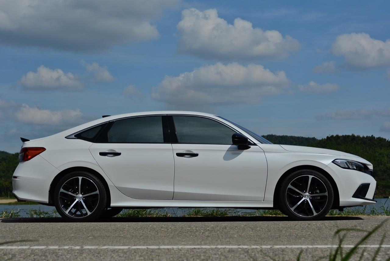 ด้านข้าง ออกแบบโดยใช้เส้นสายในแนวนอนที่ยาวต่อเนื่องจากด้านหน้าไปจนถึงด้านหลัง องศาความลาดเอียงของเสาหน้าให้ความรู้สึกโฉบเฉี่ยว จากการจัดวางโครงสร้างแบบ Low & Wide ที่ปรับให้รถรุ่นใหม่คันนี้มีจุดศูนย์ถ่วงต่ำลง ออกแบบให้ตัวถังกว้างและยาวขึ้นกว่าเดิมเล็กน้อย เน้นให้มีพื้นที่ภายในโปร่งโล่ง และทัศนวิสัยที่ดี เทคโนโลยี Roof Braze ในการประกอบตัวถัง เพื่อลดรอยต่อบริเวณหลังคา ช่วยให้ตัวรถมีเส้นสายที่สวยงามและเฉียบคม มิติตัวถังของ Honda new Civic RS e:HEV มีขนาดความยาว 4,673 มิลลิเมตร กว้าง 1,800 มิลลิเมตร สูง 1,414 มิลลิเมตร ความยาวฐานล้อ 2,735 มิลลิเมตร ระยะห่างล้อหน้า 1,546 มิลลิเมตร ระยะห่างล้อหลัง 1,574 มิลลิเมตร รถรุ่นใหม่ ยาวขึ้น 25 มิลลิเมตร กว้างขึ้น 1 มิลลิเมตร เตี้ยลง 2 มิลลิเมตร และ ระยะฐานล้อยาวขึ้น 37 มิลลิเมตร ล้ออัลลอยสีดำด้าน แบบสปอร์ต ขนาด 18 นิ้ว ยาง michelin pilot sport 4 ไซส์ 235/40 ZR18