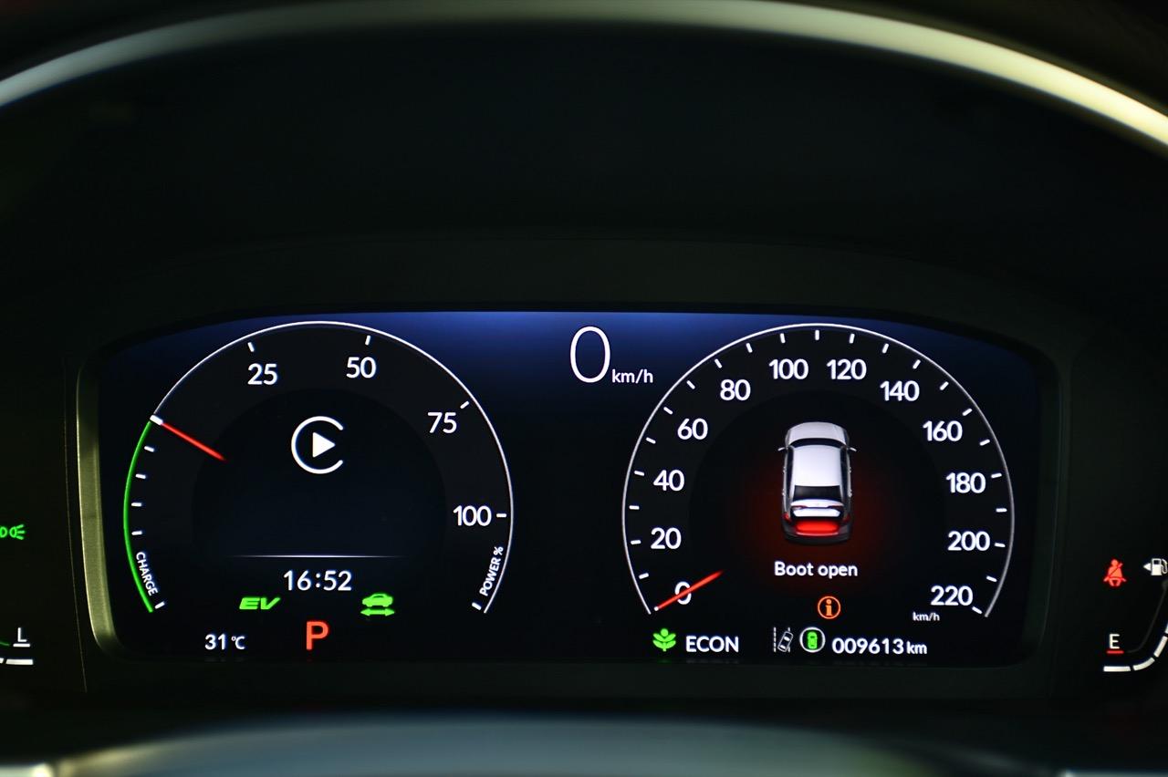แรงม้า 184 ตัว เพิ่มจากรุ่นเทอร์โบ 6 ตัว แรงบิด จาก 240 มาเป็น 315 นิวตันเมตร แรงขึ้นเยอะเลยทีเดียว การปรับจูนระบบขับเคลื่อนพลังงานผสม เพื่อให้ดูสมน้ำสมเนื้อกับขนาดและน้ำหนักตัว Civic e:HV ใหม่ นับเป็นซีดานพลังงานผสมที่คล่องแคล่วว่องไวและเร่งความเร็วได้เอาเรื่องเลยทีเดียว เมื่อทะยานไปที่ย่านความเร็วสูงแบบกดคันเร่งอย่างต่อเนื่อง ความเร็วไหลขึ้นไปเรื่อยๆ พร้อมกับเจ้า Civic ไฮบริด ที่พุ่งลิ่วๆ ไปตามแรงเท้า รอบสูงสุดของเกียร์แปรผัน E-CVT ลากไปได้ถึง 5,900 รอบต่อนาที เกียร์สายพานที่มีมอเตอร์ภายใน ออกแบบการใช้แป้น Paddle ไม่ใช่เพื่อล็อกตำแหน่งเกียร์ แต่ใช้เพื่อปรับการทำงานของระบบ regenerative braking เพื่อปรับระดับการหน่วงความเร็ว