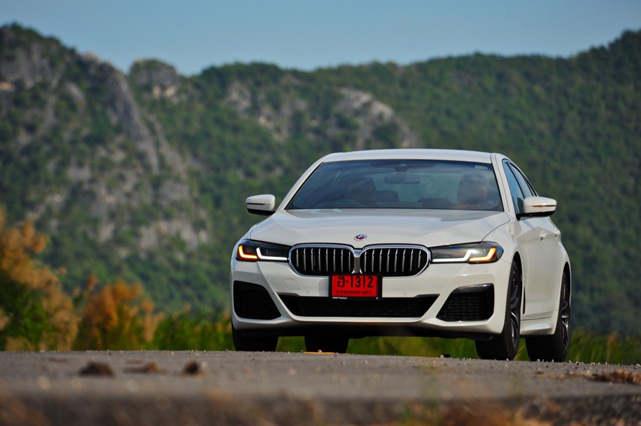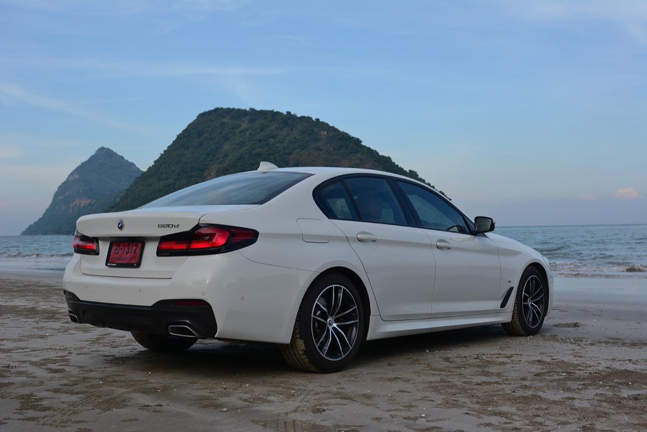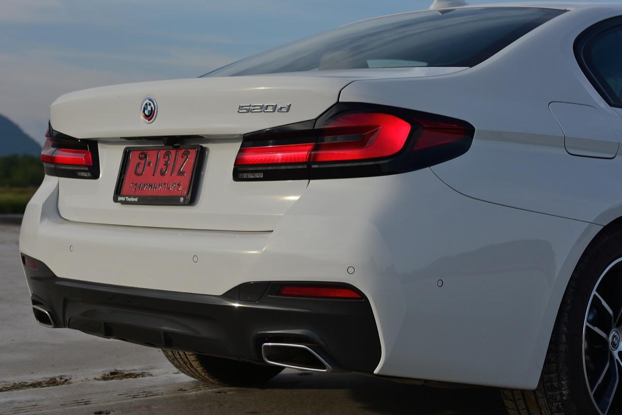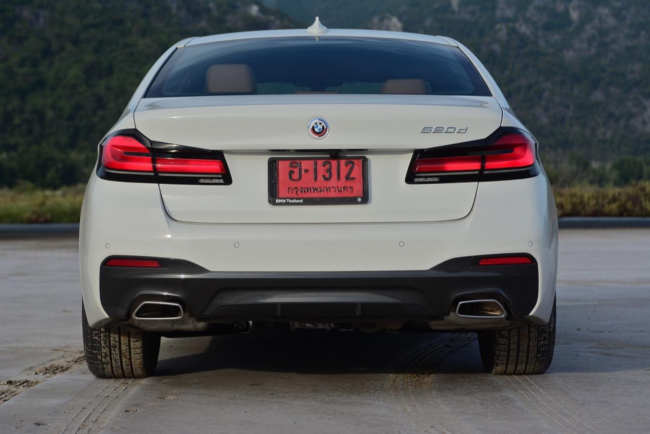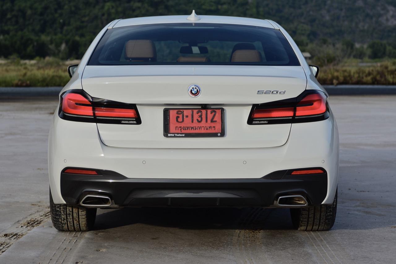 รถรุ่นปรับโฉมใหม่ หรือ LCI อย่าง Series-5 G30 เวอร์ชันไมเนอร์เชนจ์ ประจำปี 2021 รถทดสอบในอาทิตย์นี้คือซาลูนหรู 4 ประตู รุ่น New Series-5 520d M Sport ประกอบในประเทศ ราคาเปิดออกมาที่ 3,539,000 บาท เมื่อลองส่องดูทั่วทั้งคันก็จะพบว่าหน้าตาของ BMW 5-Series รุ่นปรับโฉมมีความสวยงามลงตัว รูปลักษณ์แตกต่างจากรุ่นที่แล้วไม่มากนัก งานออกแบบด้านหน้าใหม่เข้ามาเพิ่มเติมความเข้มข้นของ New Series-5 ให้เฉียบคมและดูดีขึ้นมาอีกนิด การปรับให้น้ำหนักส่วนเกินถูกตัดออกไป เกิดขึ้นจากแนวคิด BMW Efficient Lightweight เน้นการใช้วัสดุน้ำหนักเบาอย่างอลูมิเนียมและเหล็กกล้าที่มีความทนทานสูงแต่น้ำหนักเบามาใช้เป็นเปลือกตัวถังและแชสซี New Series-5 รุ่น 520d จึงมีน้ำหนักเบากว่ารุ่นก่อน (520d F10) 115 กิโลกรัม ตัวถังถูกออกแบบให้มีจุดศูนย์ถ่วงที่ต่ำ กระจายน้ำหนักอย่างสมดุล 50/50 และมีแรงเสียดทานอากาศต่ำที่สุดในรถระดับเดียวกัน