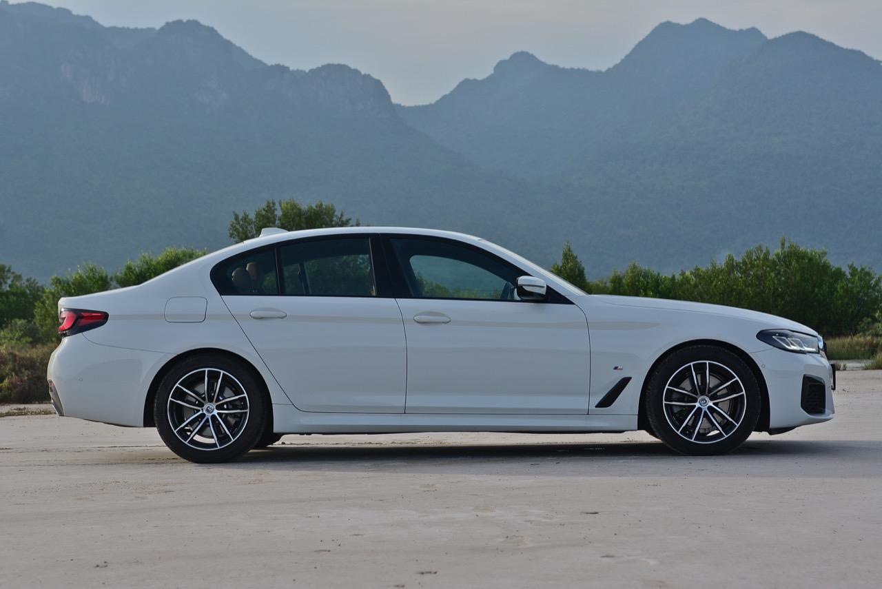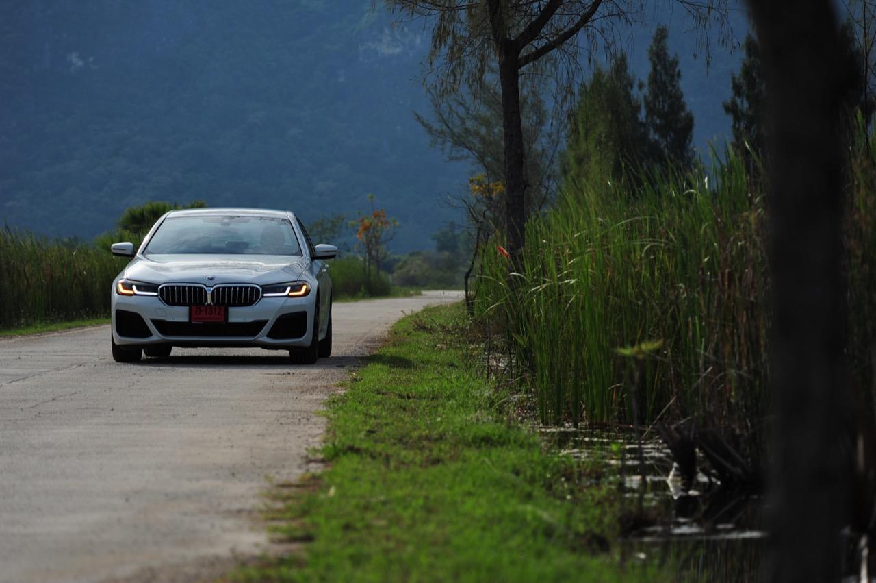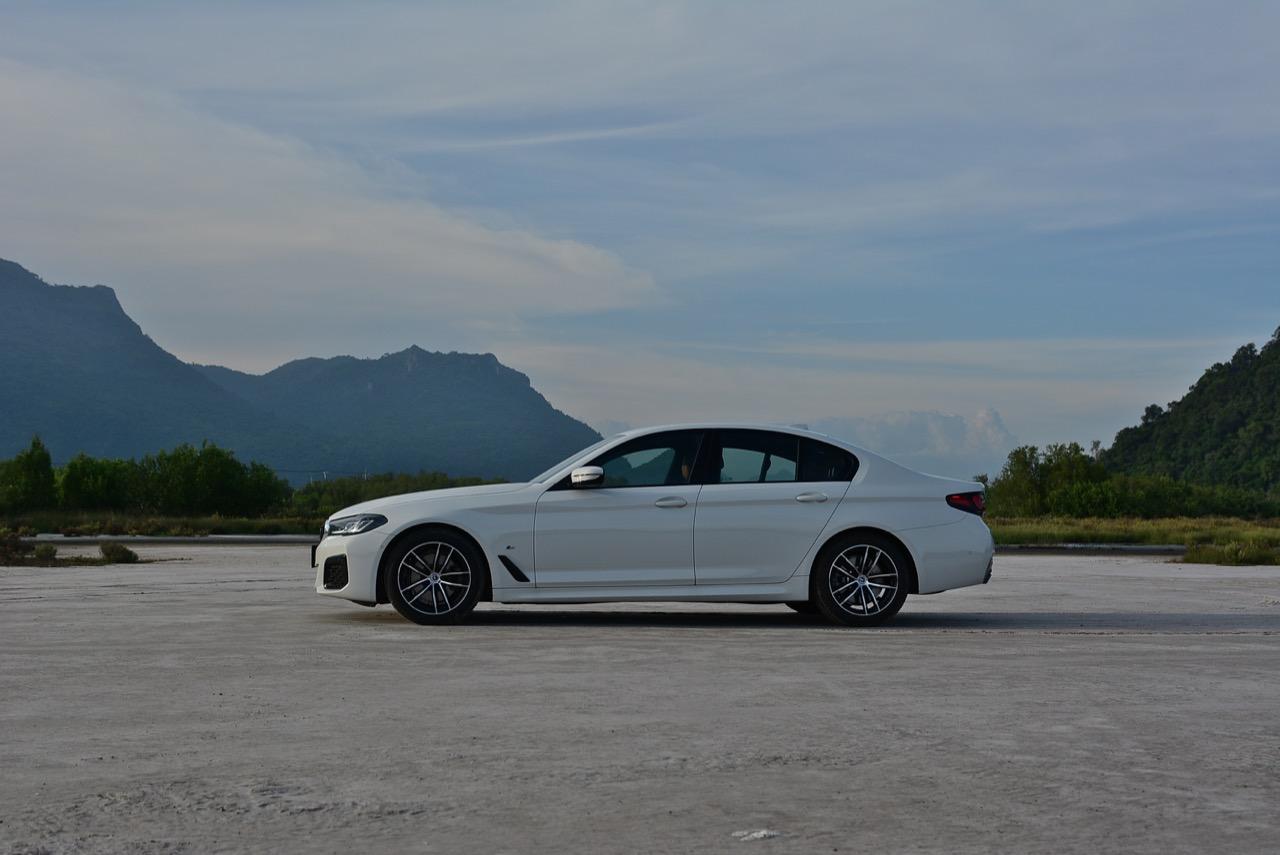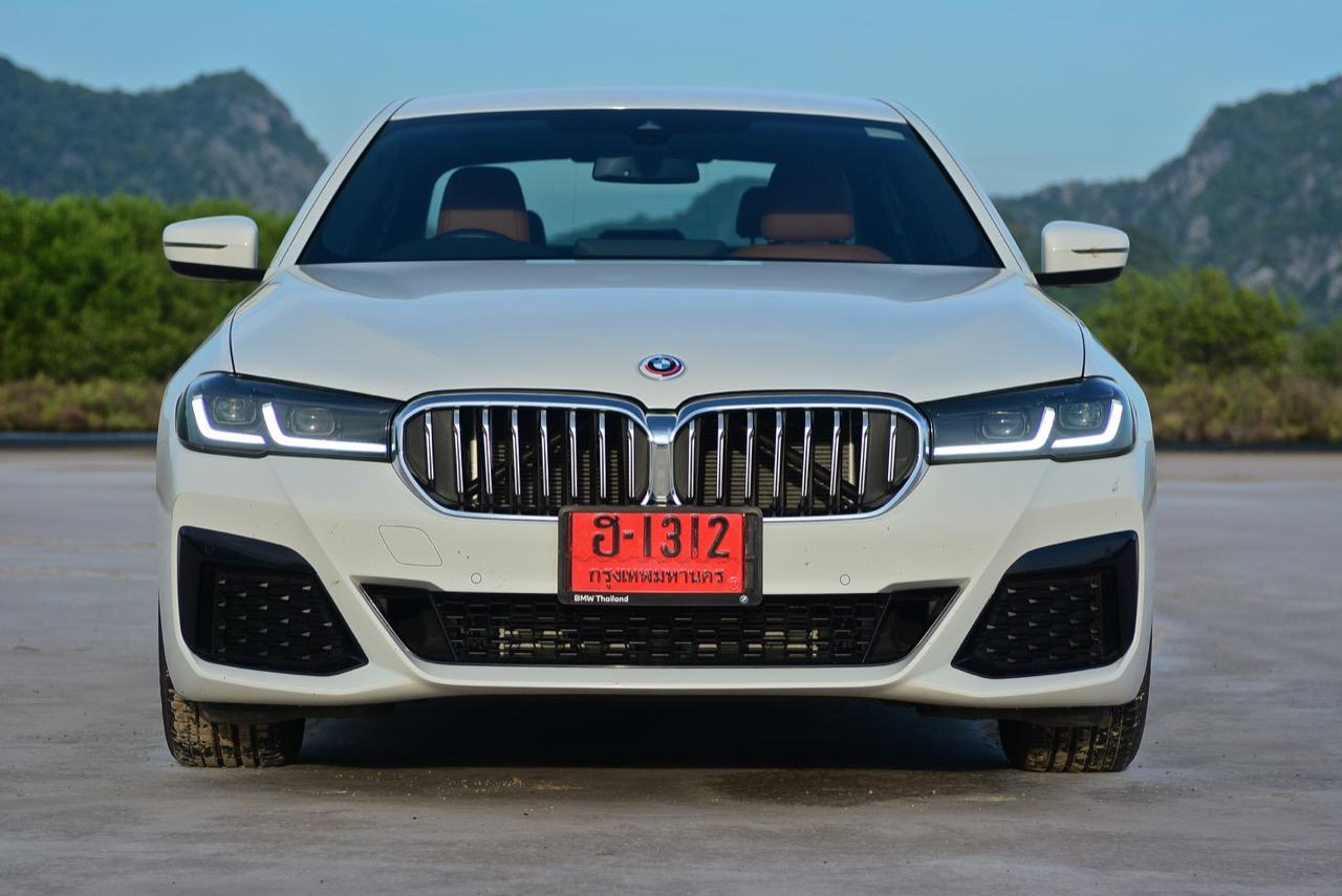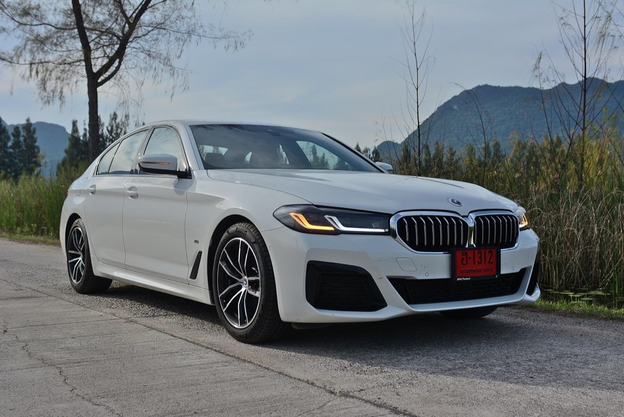 รถรุ่นปรับโฉมใหม่ หรือ LCI อย่าง Series-5 G30 เวอร์ชันไมเนอร์เชนจ์ ประจำปี 2021 รถทดสอบในอาทิตย์นี้คือซาลูนหรู 4 ประตู รุ่น New Series-5 520d M Sport ประกอบในประเทศ ราคาเปิดออกมาที่ 3,539,000 บาท เมื่อลองส่องดูทั่วทั้งคันก็จะพบว่าหน้าตาของ BMW 5-Series รุ่นปรับโฉมมีความสวยงามลงตัว รูปลักษณ์แตกต่างจากรุ่นที่แล้วไม่มากนัก งานออกแบบด้านหน้าใหม่เข้ามาเพิ่มเติมความเข้มข้นของ New Series-5 ให้เฉียบคมและดูดีขึ้นมาอีกนิด การปรับให้น้ำหนักส่วนเกินถูกตัดออกไป เกิดขึ้นจากแนวคิด BMW Efficient Lightweight เน้นการใช้วัสดุน้ำหนักเบาอย่างอลูมิเนียมและเหล็กกล้าที่มีความทนทานสูงแต่น้ำหนักเบามาใช้เป็นเปลือกตัวถังและแชสซี New Series-5 รุ่น 520d จึงมีน้ำหนักเบากว่ารุ่นก่อน (520d F10) 115 กิโลกรัม ตัวถังถูกออกแบบให้มีจุดศูนย์ถ่วงที่ต่ำ กระจายน้ำหนักอย่างสมดุล 50/50 และมีแรงเสียดทานอากาศต่ำที่สุดในรถระดับเดียวกัน