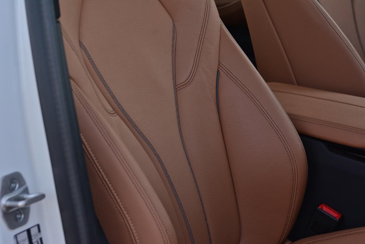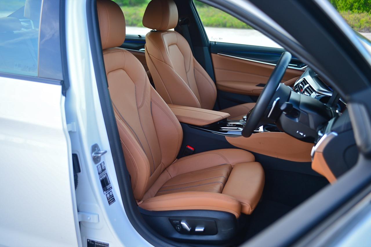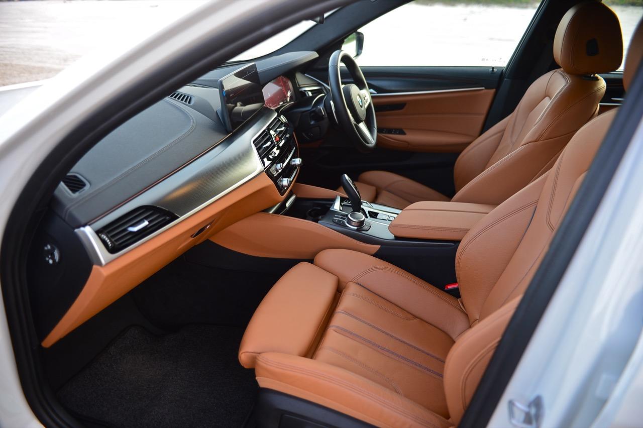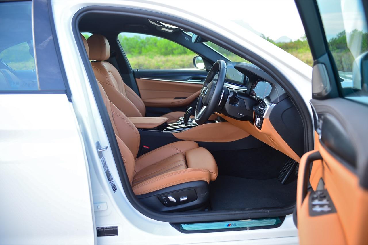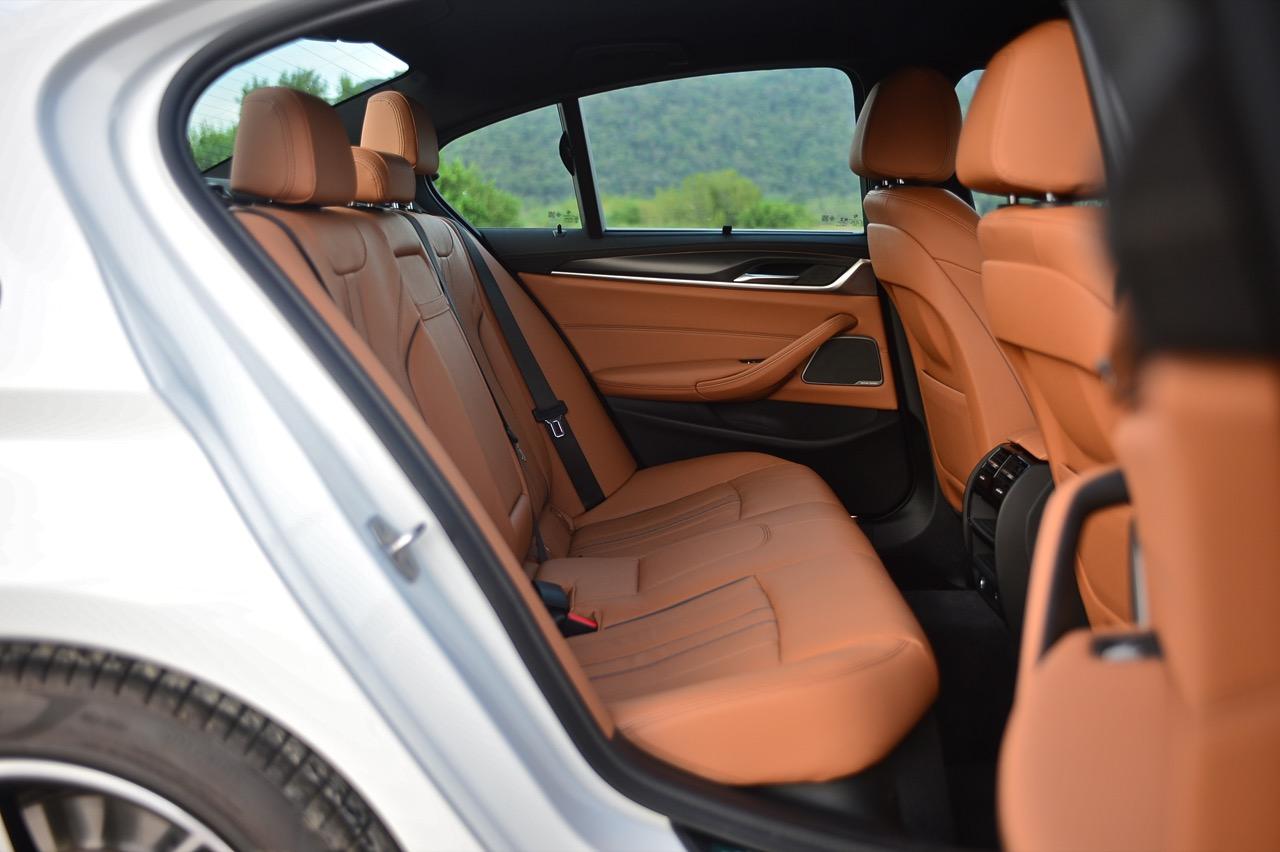 เบาะนั่ง M ดีไซน์สปอร์ต สำหรับคนขับและผู้โดยสารตอนหน้า ออกแบบส่วนด้านข้างของเบาะที่ยกสูง จุดนี้เองที่ทำให้เจ้าของหลายคนออกอาการเมื่อยเมื่อขับทางไกล บางคนถึงกับต้องทำเบาะรองเสริมเพื่อแก้ความเมื่อยดังกล่าว แต่ก็ไม่ได้เป็นทุกคน เพราะสรีระของลูกค้าซึ่งเป็นเจ้าของนั้นมีความแตกต่างกัน ขอบของเบาะบริเวณสะโพกที่ออกแบบให้ยกตัวสูงขึ้น เมื่อผมขับทางไกลทั้งวันจากกรุงเทพฯไปยังกุยบุรีแล้วขับกลับ รวมระยะทางเฉียด 600 กิโลเมตร ก็พบว่าเมื่อยอยู่เหมือนกัน เบาะหลังมีพื้นที่กว้างขวางพอเพียง พร้อมช่องแอร์เพื่อความเย็นฉ่ำที่กระจายได้อย่างทั่วถึง Series-5 520d M Sport ยังมีม่านไฟฟ้าด้านหลังและม่านด้านข้างของบานประตูหลังทั้งสอง ช่วยเพิ่มความเป็นส่วนตัวและช่วยบังแสงแดดได้ดี เพดานห้องโดยสารใช้วัสดุเก็บเสียงในตัว ช่วยลดเสียงรบกวนในห้องโดยสารได้ดี โดยเฉพาะในบริเวณที่ใกล้กับศีรษะเพื่อความผ่อนคลาย ชิ้นส่วนและอุปกรณ์ต่างๆ ที่ติดตั้งอยู่บนแชสซีได้รับการปรับให้มีน้ำหนักเบาลงมาก เช่น การรวมระบบเบรกมือไฟฟ้าเข้ากับคาร์ลิปเปอร์เบรกล้อหลังซึ่งลดน้ำหนักได้ 3 กิโลกรัม โดยรวมแล้วการลดน้ำหนักของตัวเบรก ล้อและยางที่มีขนาดพอดี ไม่ใหญ่จนเกินไป ทำให้ Series-5 LCI มีน้ำหนักรวมของช่วงล่างเบาลง มีผลต่อการตอบสนองและความนุ่มนวลในการขับขี่อย่างเห็นได้ชัด