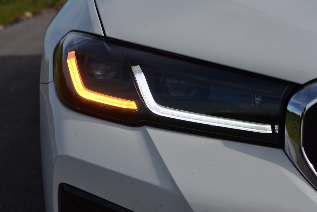 ดีไซน์ภายนอกของ BMW 520d M Sport Facelift มีการเติมอุปกรณ์ใหม่ทุกจุด เช่น ไฟหน้าแบบ Adaptive LED ที่ปรับทิศทางตามการหมุนของพวงมาลัย รงมถึงการทำงานในโหมดอัตโนมัติ ที่ได้รับการปรับใหม่ให้ทำงานได้ครอบคลุมและละเอียดเพิ่มขึ้น ไฟหน้าใน BMW ถือเป็นเอกลักษณ์ที่ได้รับการออกแบบให้เชื่อมโยงกับโมเดลนั้นๆ สำหรับ Series-5 รุ่นใหม่ ไฟหน้าแบบ Adaptive LED มีระบบปรับการกระจายแสงให้เหมาะสมกับเส้นทางที่ขับขี่ ไม่ว่าจะเป็นการเพิ่มแสงสว่างในมุมอับในขณะเข้าโค้ง ระบบปรับการทำงานไฟสูงอัตโนมัติในระยะไกลสุด 500 เมตร ไฟหน้าจะทำงานเป็นอิสระ โดยไม่ทำให้แสงไฟไปรบกวนรถยนต์คันอื่น การลดหรือยกไฟสูง เมื่อวิ่งเข้าไปใกล้รถยนต์คันข้างหน้า แม้ระบบจะยังคงเปิดไฟสูงแต่ใช้การแบ่งช่องเพื่อเบี่ยงเบนแสงไฟไม่ให้ไปแยงตารถคันข้างหน้า หรือรถที่แล่นสวนมา การทำงานและกำลังในการส่องสว่างใกล้เคียงกับ Multi Beam LED ของ new E-Class น่าเสียดายอยู่เหมือนกันที่ Mercedes-Benz E220d AMG Dynamic รุ่นปรับโฉมซึ่งเป็นรถคู่แข่งของ 520d มีแค่ไฟ LED High Performance เป็นอุปกรณ์มาตรฐาน