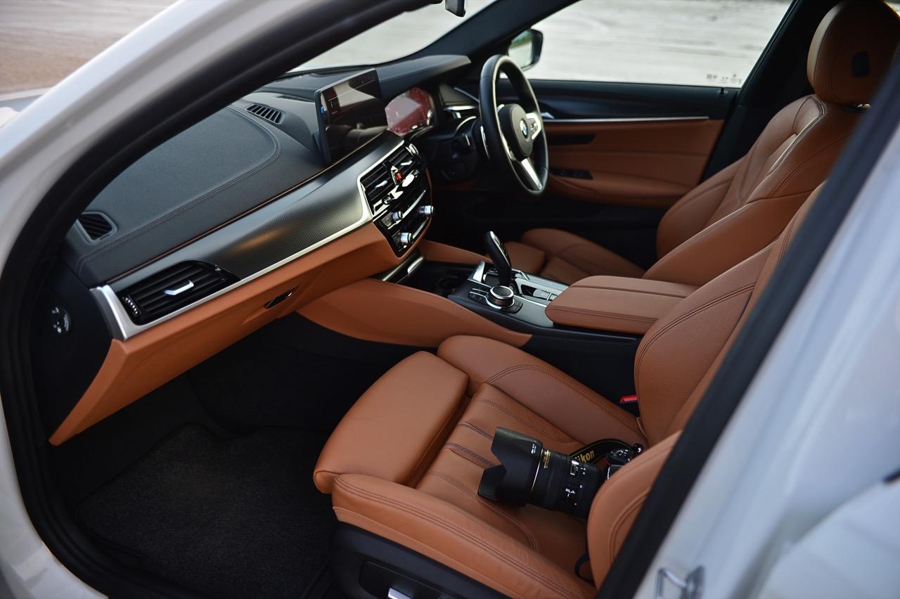 BMW G30 (Series-5) รุ่น 520d M Sport ออกแบบห้องโดยสารมาเพื่อการขับขี่อย่างเต็มประสิทธิภาพ การจัดวางตำแหน่งของปุ่มและสวิตช์ต่างๆ เอื้ออำนวยต่อการใช้งานของคนขับเป็นหลัก มันถูกตกแต่งภายในด้วยโลหะพวกอลูมิเนียม หนังแท้ ผ้าและพลาสติกเกรดสูง รวมถึงวัสดุในดีไซน์ที่แสดงออกถึงความหรูหรา เป็นเอกลักษณ์ของยานยนต์ซาลูนไซส์กลางจากแบรนด์ตราใบพัด หน้าปัดมาตรวัดแบบจอภาพ TFT 12.3 นิ้ว จอแสดงผลบนแผงคอนโซลกลางขนาดใหญ่ มาพร้อมกับหน้าจอแสดงผลขนาด 10.25 นิ้ว ที่ทำงานควบคู่กับระบบ iDrive Controller จอยิงสะท้อนข้อมูล BMW Head-up Display คอยแจ้งเตือนข้อมูลรายละเอียดของการเดินทางตรงหน้าคนขับ ส่วนฟังก์ชัน REMOTE SOFTWARE UPGRADE ระบบนี้รถจะได้รับการอัปเดตซอฟต์แวร์อัตโนมัติให้เป็นเวอร์ชันล่าสุดอยู่เสมอ โดยใช้สมาร์ทโฟนในการอัปเดตทำได้อย่างง่าย และยังสามารถเปิดการใช้งานฟังก์ชันอื่นๆ ได้อีกด้วย