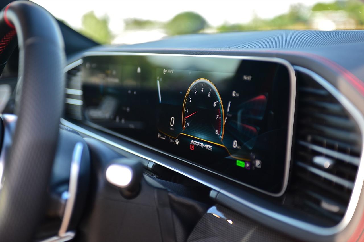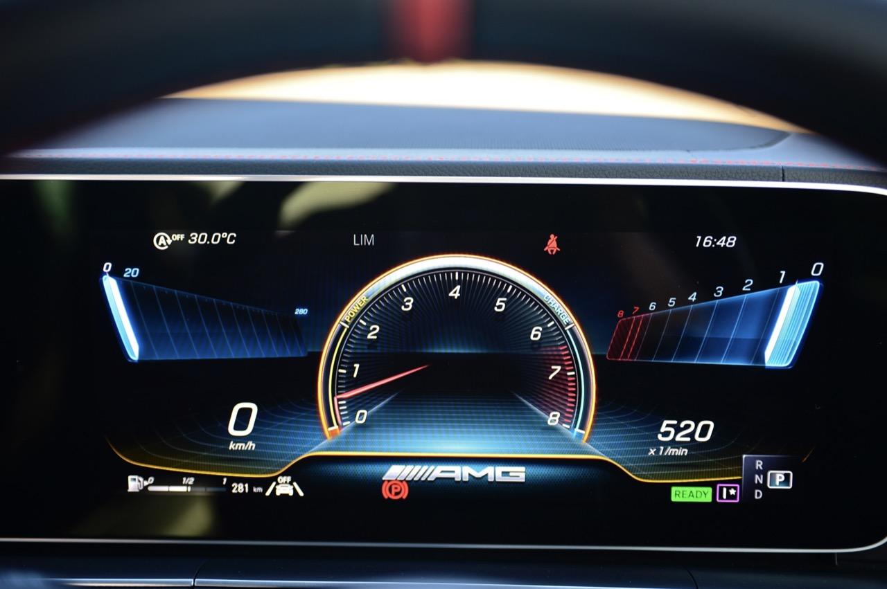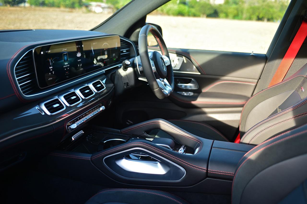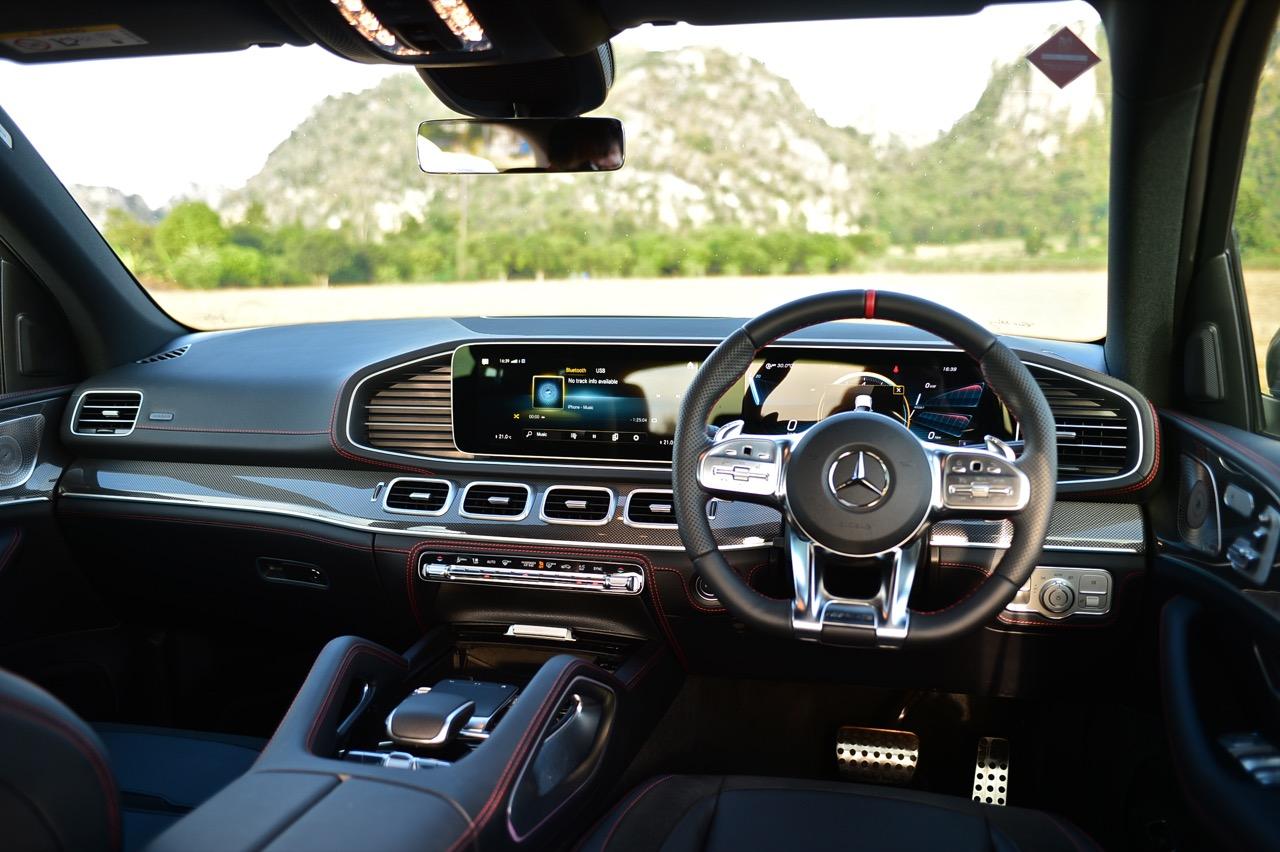 คอนโซลกลางตกแต่งด้วยงานคาร์บอนไฟเบอร์ แดชบอร์ดและแผงประตูประดับประดาด้วยงานอะลูมิเนียมสีเงินพร้อมตำแหน่งของกรวยลำโพงที่เต็มไปด้วยรายละเอียดสลับซับซ้อนและสง่างาม เข็มขัดนิรภัยสีแดงของ AMG เบาะครึ่งหนังเดินเส้นด้วยหนังกลับ Alcantara ตำแหน่งท่านั่งจัดวางมาดีมาก โดยเฉพาะตำแหน่งคนขับซึ่งเป็นจุดศูนย์กลางของการใช้อุปกรณ์ด้วยแดชบอร์ดที่กว้างขวาง ทัศนวิสัยและเส้นสายตาที่ยอดเยี่ยม เบาะนั่งแบบนวดได้ และที่เท้าแขนแบบปรับความร้อนได้ ทุกพื้นผิว จุดสัมผัส หน้าปัด และคันโยกให้ความรู้สึกพรีเมียม อบอวล และคู่ควรกับป้ายราคาดาวสีเงิน การตกแต่งภายในยังคงเป็นภาพยนตร์เต็มรูปแบบพร้อมอสังหาริมทรัพย์ดิจิทัลมากมาย หน้าจอคู่ขนาด 12.3 นิ้วเป็นอุปกรณ์มาตรฐานและติดตั้งเป็นแผงหน้าปัดแบบจอภาพ ซึ่งเป็นสิ่งที่เราเห็นได้จากรถเบนซ์รุ่นใหม่ๆ เป็นจอที่มีความคมชัดสูงและดูสมจริง