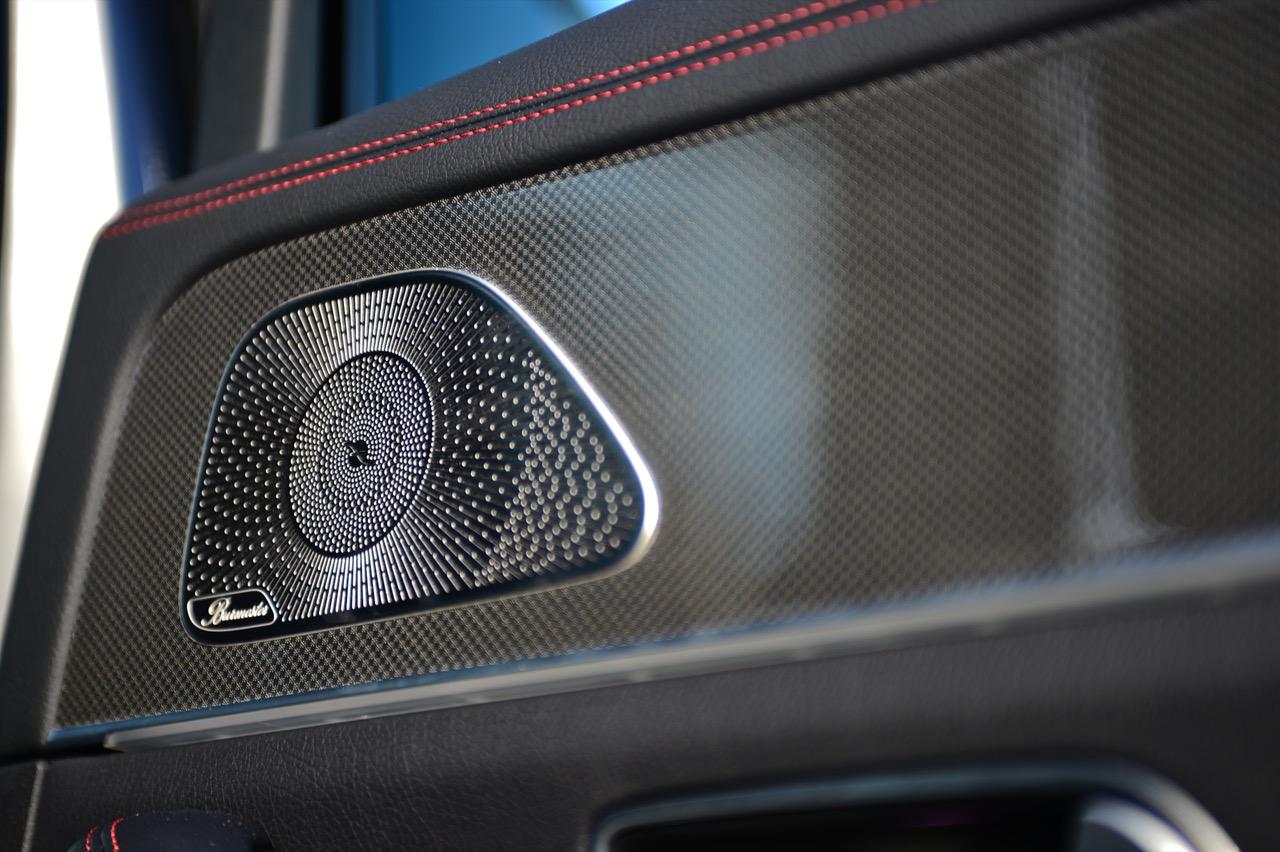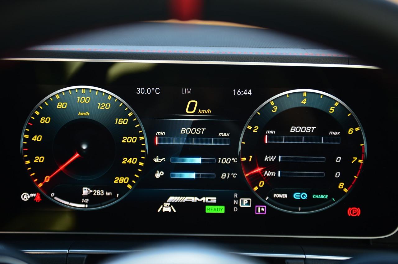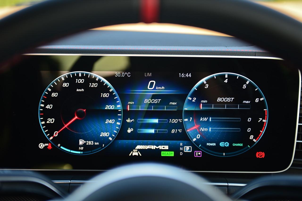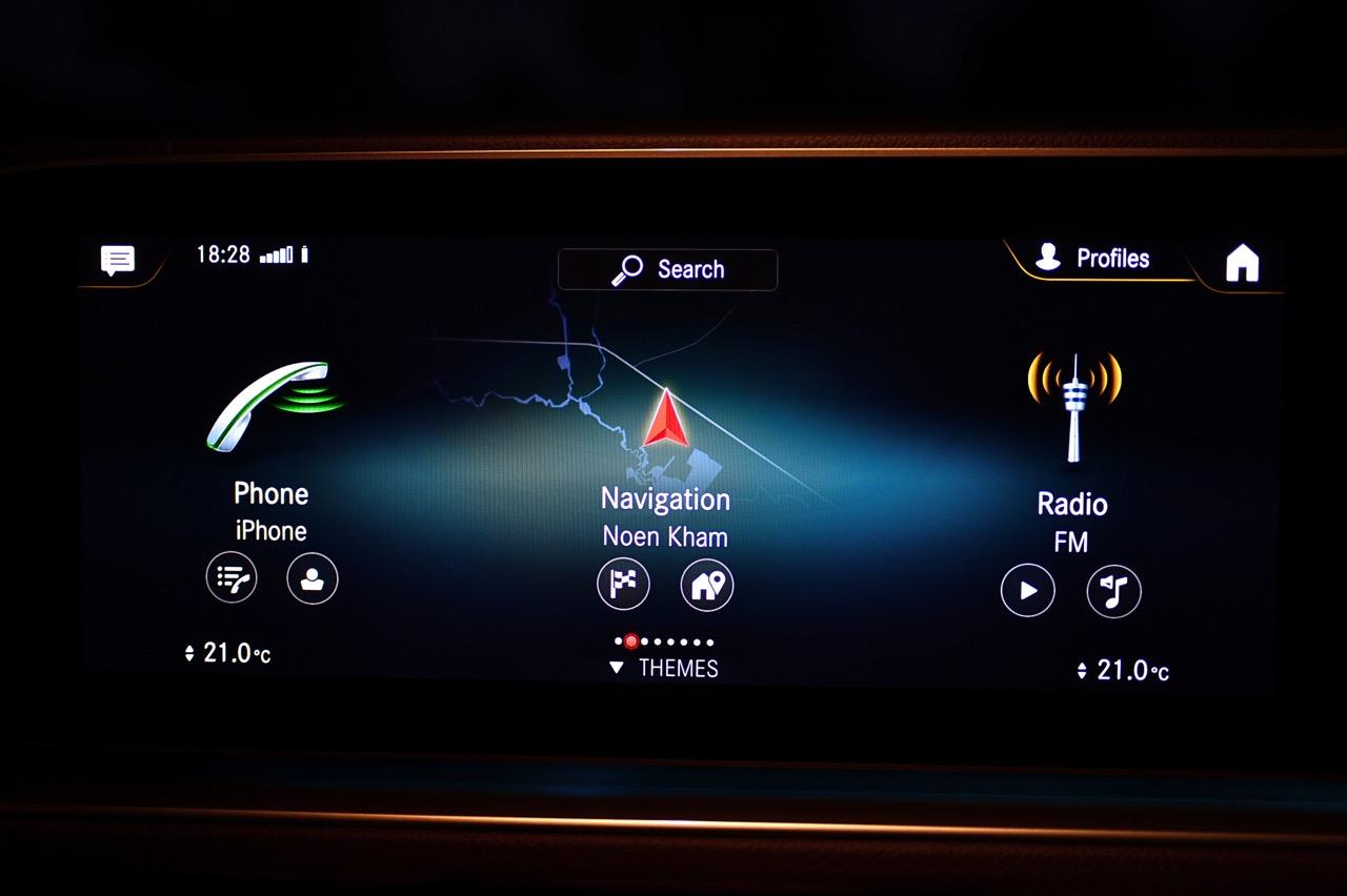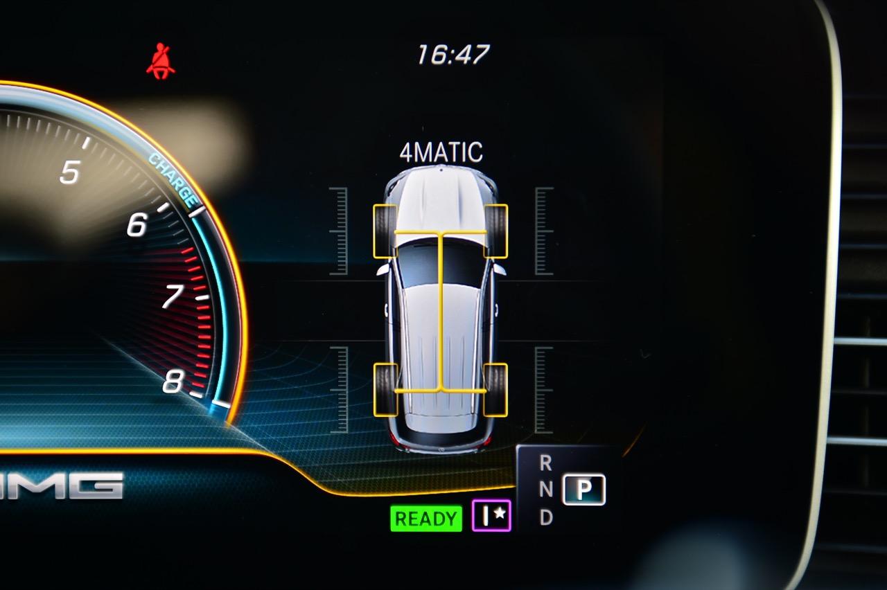คอนโซลกลางตกแต่งด้วยงานคาร์บอนไฟเบอร์ แดชบอร์ดและแผงประตูประดับประดาด้วยงานอะลูมิเนียมสีเงินพร้อมตำแหน่งของกรวยลำโพงที่เต็มไปด้วยรายละเอียดสลับซับซ้อนและสง่างาม เข็มขัดนิรภัยสีแดงของ AMG เบาะครึ่งหนังเดินเส้นด้วยหนังกลับ Alcantara ตำแหน่งท่านั่งจัดวางมาดีมาก โดยเฉพาะตำแหน่งคนขับซึ่งเป็นจุดศูนย์กลางของการใช้อุปกรณ์ด้วยแดชบอร์ดที่กว้างขวาง ทัศนวิสัยและเส้นสายตาที่ยอดเยี่ยม เบาะนั่งแบบนวดได้ และที่เท้าแขนแบบปรับความร้อนได้ ทุกพื้นผิว จุดสัมผัส หน้าปัด และคันโยกให้ความรู้สึกพรีเมียม อบอวล และคู่ควรกับป้ายราคาดาวสีเงิน การตกแต่งภายในยังคงเป็นภาพยนตร์เต็มรูปแบบพร้อมอสังหาริมทรัพย์ดิจิทัลมากมาย หน้าจอคู่ขนาด 12.3 นิ้วเป็นอุปกรณ์มาตรฐานและติดตั้งเป็นแผงหน้าปัดแบบจอภาพ ซึ่งเป็นสิ่งที่เราเห็นได้จากรถเบนซ์รุ่นใหม่ๆ เป็นจอที่มีความคมชัดสูงและดูสมจริง