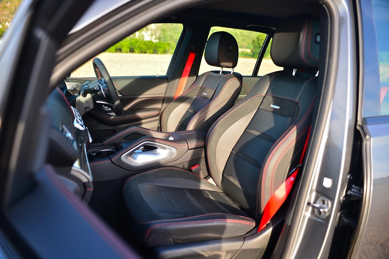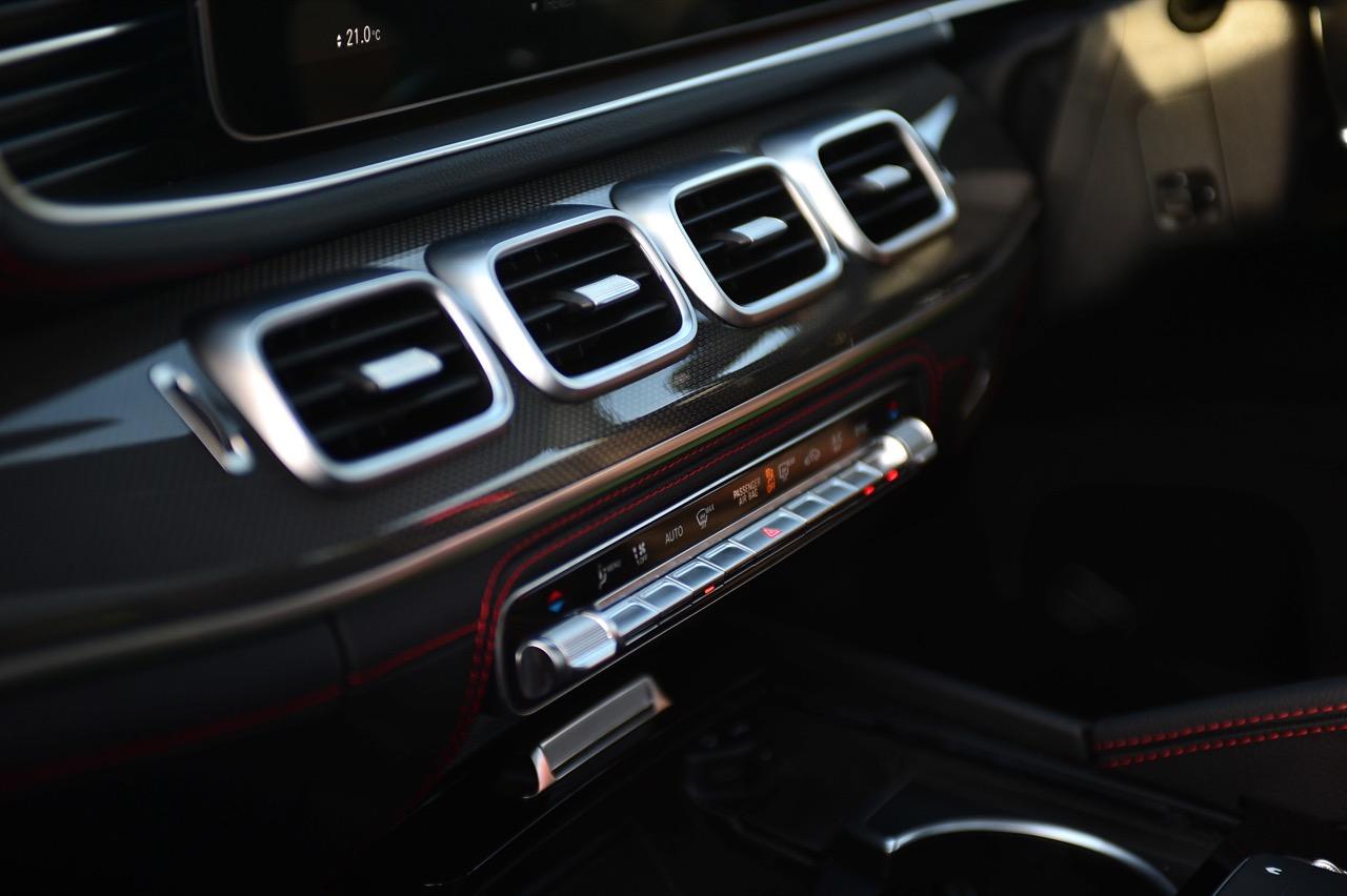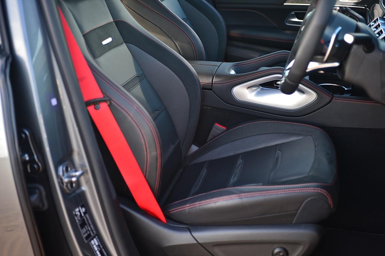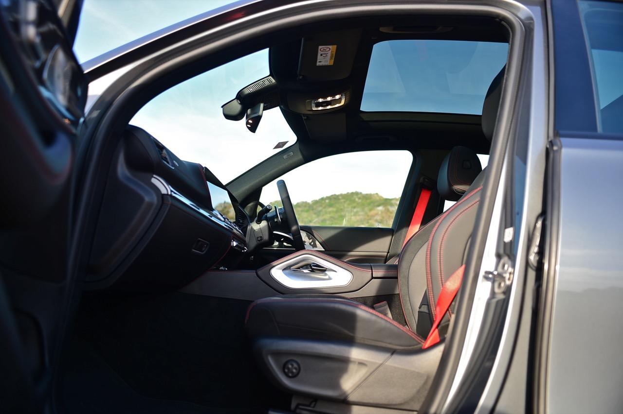 GLE 53 เพิ่มหนังและหนังกลับเป็นพิเศษทั่วทั้งห้องโดยสาร พวงมาลัยเฉพาะของ AMG พร้อมสมรรถนะที่ฝังอยู่ในระบบอินโฟเทนเมนต์ MBUX ใหม่ จับคู่กับแทร็กแพดแบบ Apple แทนปุ่มหมุนและปุ่มตัวเลขที่หมุนออก ผู้ใช้สามารถแตะ เลื่อน จีบนิ้ว และเลื่อน เหมือนกับอินพุตที่สั่งการสมาร์ทโฟนของคุณ และแม้ว่าปุ่มหมุนแบบหมุนจะเป็นวิธีที่เราชอบในการควบคุมอินเทอร์เฟซ (แต่ก็ยังเป็นเช่นนั้น) แทร็กแพดใหม่นี้ใช้งานง่ายพอที่จะใช้งานได้ทันที ผมชอบ iDrive ของ BMW ที่มีแถวของปุ่มทางลัดที่ตั้งโปรแกรมได้แปดปุ่ม แต่การเรียนรู้ MBUX ใหม่ และเมนูวางในแนวนอนพร้อมปุ่มขนาดใหญ่ มันคล้ายกับอินเทอร์เฟซของ Lexus ที่ใช้แทร็กแพดเช่นกัน แต่ MBUX นั้นซับซ้อนน้อยกว่า หน้าจอไม่โอเวอร์โหลด และระดับความไวในการป้อนข้อมูลนั้นลื่นไหลและสม่ำเสมอกว่า