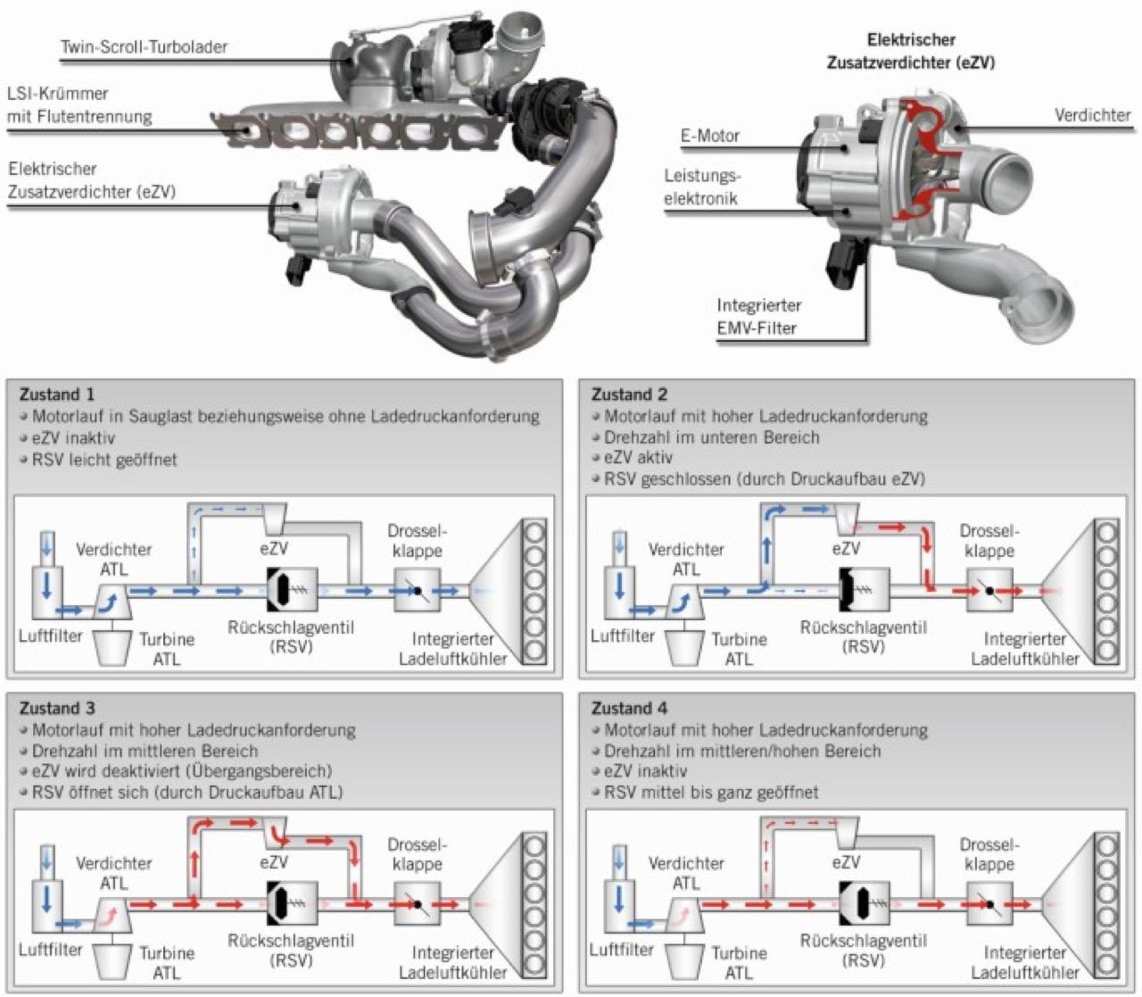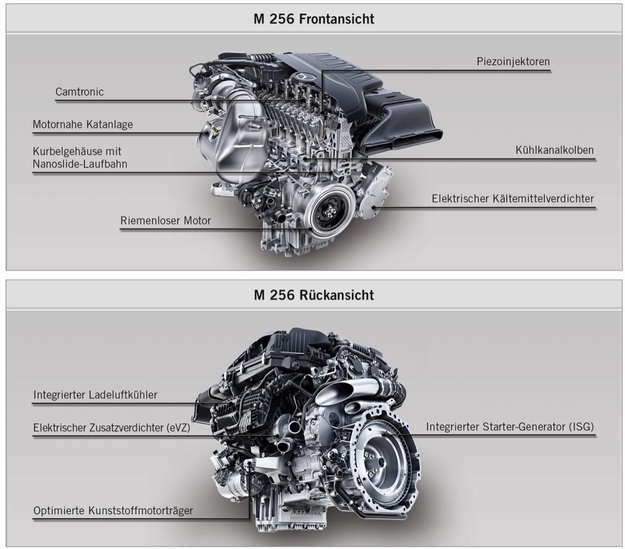 M256 มีระบบสตาร์ตเตอร์-อัลเทอร์เนเตอร์ (ISG) ที่ติดตั้งระหว่างเครื่องยนต์กับเกียร์อัตโนมัติ ต่อเชื่อมกับระบบไฟฟ้าออนบอร์ด 48V ISG ยึดติดกับเพลาข้อเหวี่ยงอย่างแน่นหนา และแลกเปลี่ยนพลังงานระหว่างเพลาขับกับแบตเตอรี่ลิเทียมไอออน 48V ที่มีปริมาณพลังงานเกือบ 1 กิโลวัตต์ชั่วโมง ระบบไฟฟ้า 48V จ่ายไฟให้กับปั๊มน้ำไฟฟ้าและคอมเพรสเซอร์เครื่องปรับอากาศ ระบบอัดอากาศเป็นคุณสมบัติหลักของเครื่องยนต์ M256 เทอร์โบชาร์จเจอร์แบบ twin-scroll turbocharger พร้อมท่อร่วมไอเสียที่หุ้มฉนวน คอมเพรสเซอร์ไฟฟ้าเพิ่มเติม (eZV) ที่รวมอยู่ในระบบไฟฟ้า 48 โวลต์ คอมเพรสเซอร์เสริมไฟฟ้า ขจัดเอฟเฟกต์ของอาการเทอร์โบแล็ก ครีบเทอร์ไบน์สามารถเร่งความเร็วได้ถึง 70,000 รอบต่อนาที ภายใน 300 มิลลิวินาที เป็นเทอร์โบไฟฟ้าที่มีศักยภาพสูง
