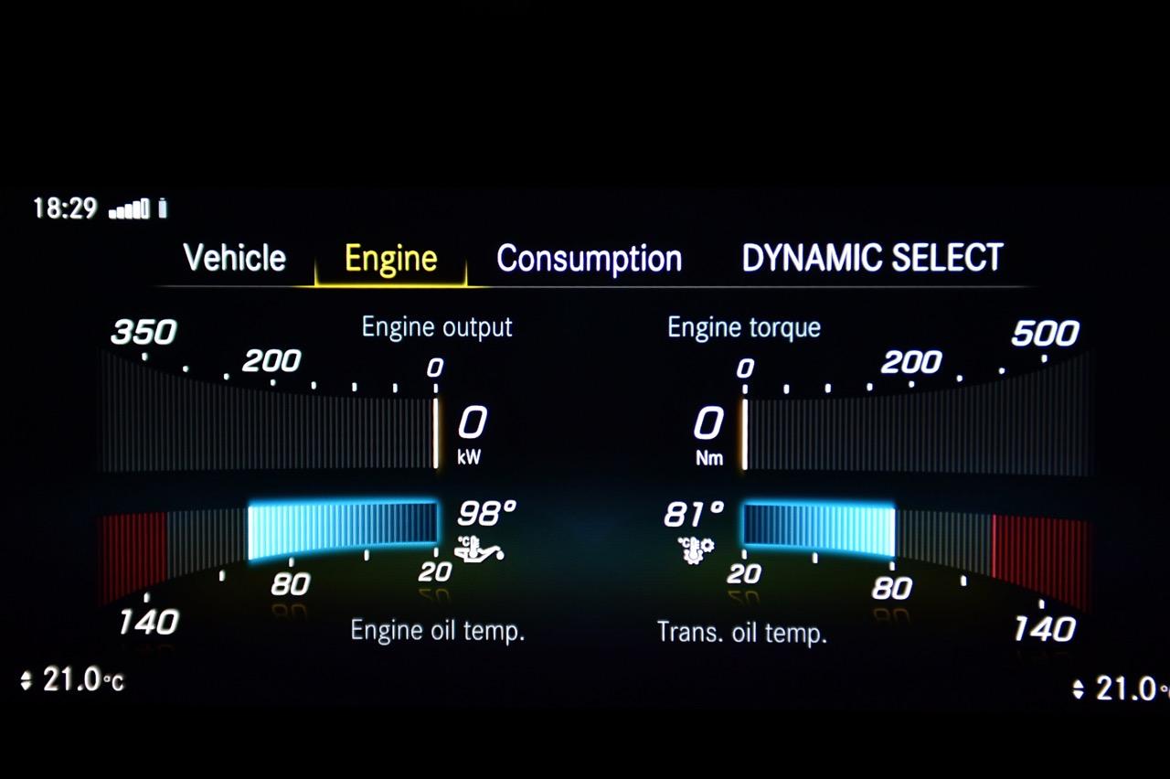 พวงมาลัยตั้งรับการขับที่เร็วขึ้นด้วยน้ำหนักที่ค่อนข้างกระชับรัดกุม คันเร่งไฟฟ้าตอบสนองได้เร็วขึ้น เกียร์ 9G-Tronic คาอยู่เกียร์ 3-4-5 เพื่อเรียกแรงบิดนานเป็นพิเศษ AMG RIDE CONTROL+ จะปรับระดับความสูงให้ลดต่ำลง ปรับให้โช้คถุงลมแข็งขึ้นมาอีกนิดเพื่อทำให้ช่วงล่างสอดรับกับการขับเร็ว
