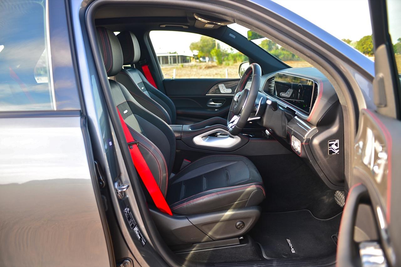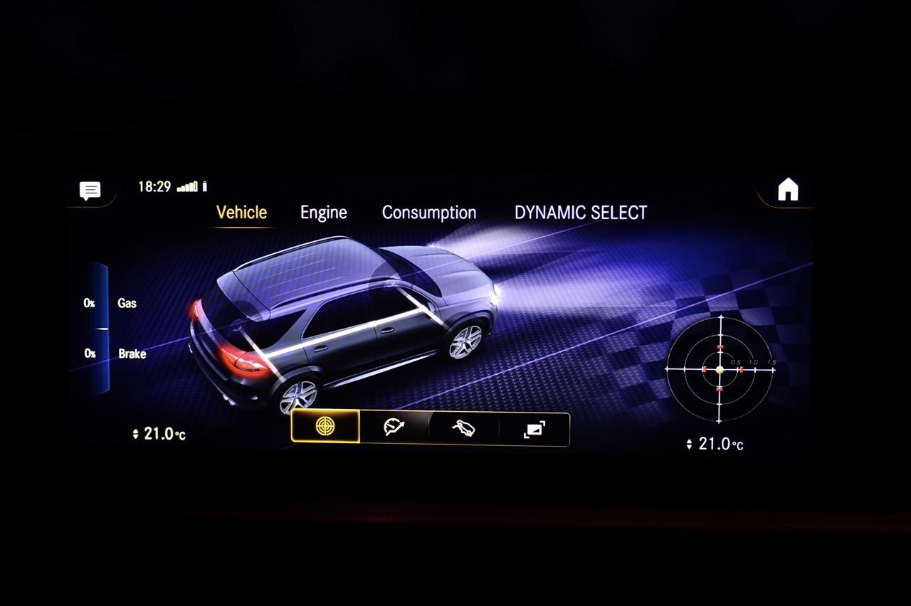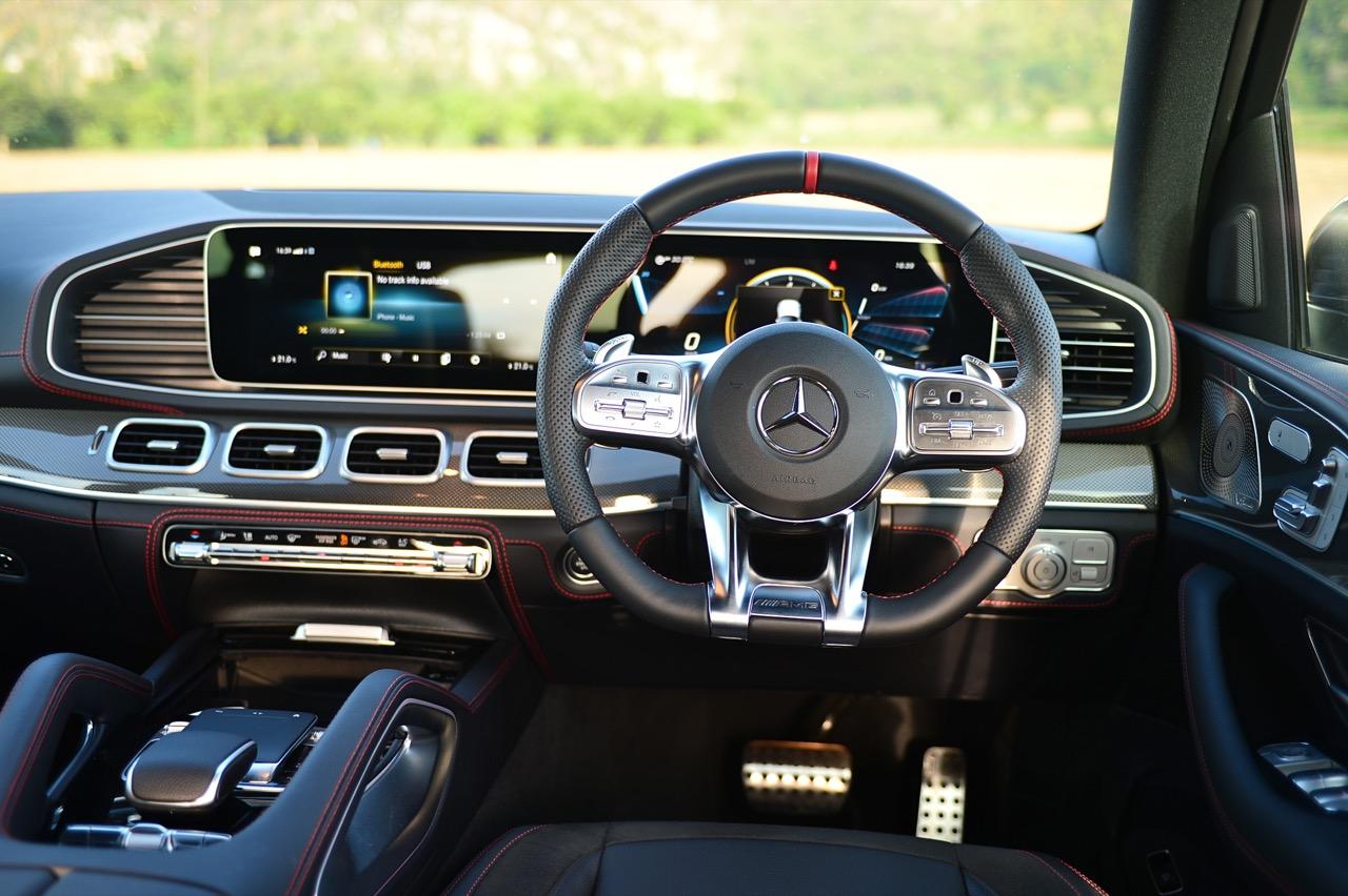 งานตกแต่งภายในสไตล์รถผู้ใหญ่เชื่อมโยงกับอุปกรณ์ใช้งานพวกจอภาพและปุ่มควบคุมอุณหภูมิแบบแยกโซน ภายในของ AMG GLE 53 ยังคงมีมนต์ขลังสำหรับคนที่ชอบรถเอสยูวีเสมอ สำหรับ GLE 53 4MATIC+ จัดงานตกแต่งภายในที่เน้นความหรูหราเหมือนเดิม เพิ่มเติมก็คือการเปลี่ยนพวงมาลัย AMG พร้อมปุ่มปรับโหมดแบบใหม่ที่ไฮเทคและสั่งงานได้เร็วขึ้นเพราะติดตั้งอยู่ใต้ก้านวงทั้งสองฝั่ง รวมถึงแผงควบคุมที่เปลี่ยนเป็น MBUX แบบใหม่ล่าสุด สั่งงานด้วยเสียงหรือใช้นิ้วแตะแป้นสัมผัสที่อยู่ถัดไปจากคอนโซลกลาง (บริเวณเดียวกับซุ้มเกียร์ในอดีต) วัสดุและโทนสีภายใน สร้างบรรยากาศให้มีความเป็นรถสปอร์ตควบคู่ไปกับความหรูหราน่าใช้งาน ด้วยสไตล์เอสยูวีของ AMG สะท้อนรูปทรงแข็งแกร่งจากภายนอกสู่งานดีไซน์ภายใน