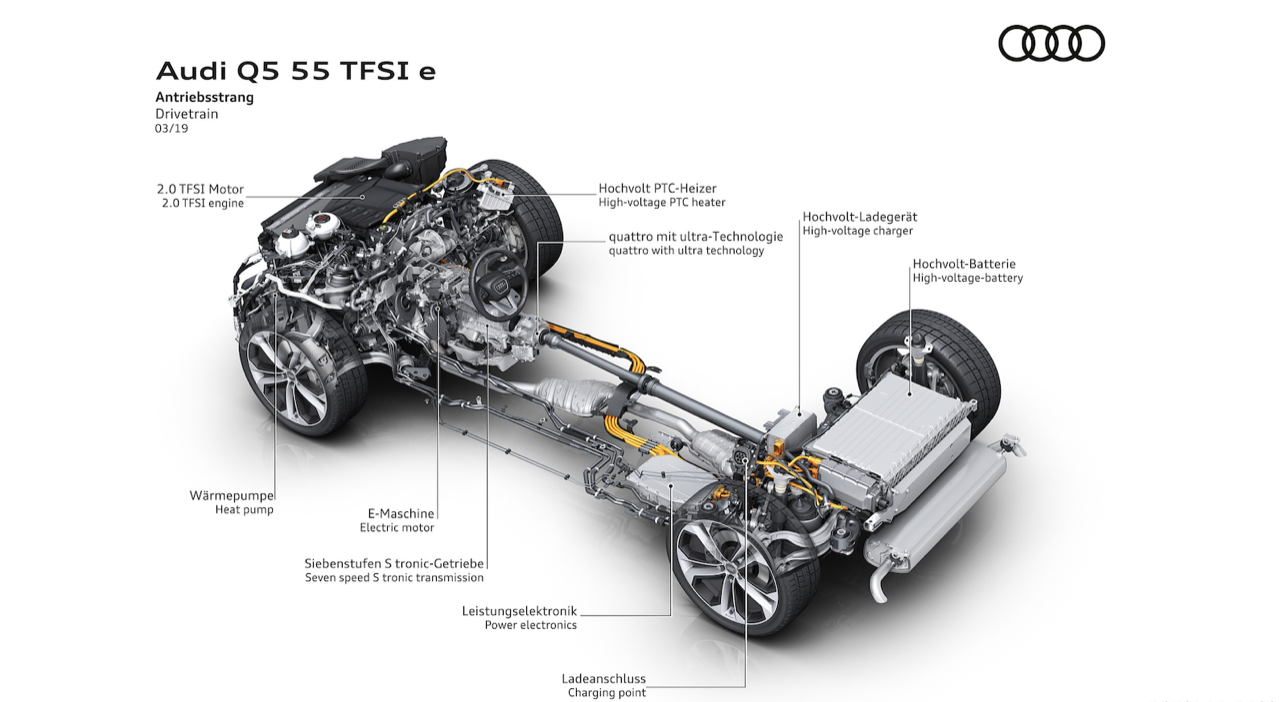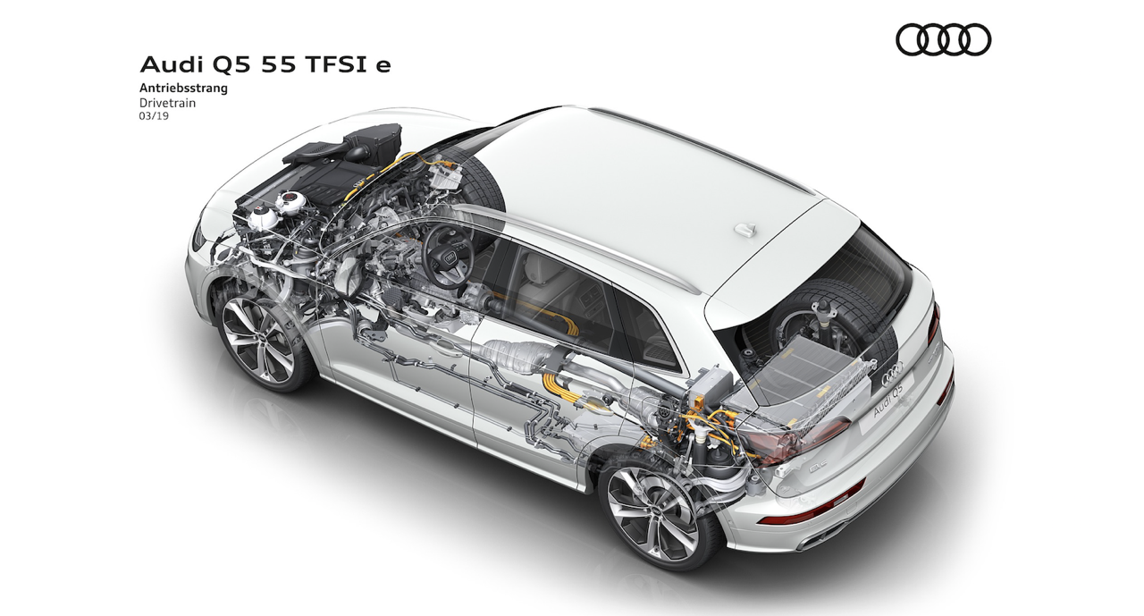 Q5 55TFSI e รุ่นที่ Audi Thailand นำเข้ามาขาย มาพร้อมเครื่องยนต์เบนซินสี่สูบ เทอร์โบชาร์จ ความจุ 2.0 ลิตร กำลัง 262 แรงม้า แรงบิด 370 นิวตันเมตร มอเตอร์ไฟฟ้าในเกียร์อัตโนมัติ 7 สปีด กำลัง 141 แรงม้า แรงบิดของมอเตอร์ขับเคลื่อนอยู่ที่ 350 นิวตันเมตร ระบบขับเคลื่อนสี่ล้อ Ultra Quattro คอยเฉลี่ยแรงบิดให้เกิดความสมดุลในทุกย่านความเร็ว แบตเตอรี่ lithium-ion ขนาด 17.9 kWh onboard charge เครื่องยนต์และมอเตอร์ไฟฟ้า เมื่อทำงานร่วมกันจะมีกำลังรวม 367 แรงม้า แรงบิดของทั้งสองระบบรวม 500 นิวตันเมตร (369 ปอนด์-ฟุต) เร่งความเร็วจาก 0-100 กิโลเมตร ใน 5.3 วินาที ความเร็วสูงสุดอยู่ที่ 240 กิโลเมตรต่อชั่วโมง ระบบกันสะเทือนของเอสยูวีขนาดกะทัดรัดที่หรูหรานั้นรองรับแรงกระแทกได้ดี และให้ความรู้สึกมั่นคง ไม่ว่าสภาพถนน หรือสภาพการขับจะเป็นอย่างไร การขับเน้นความราบรื่นและควบคุมได้ง่าย ไม่ว่าจะมีหรือไม่มีระบบกันสะเทือนแบบปรับได้อัตโนมัติก็ตาม แม้กระทั่งบนผิวยางมะตอยที่มีรอยแตก การบังคับเลี้ยวของพวงมาลัยไฟฟ้าอัตราทดแปรผันนั้นเน้นความแม่นยำและให้สัมผัสที่เบาสบายมือ โหมดไดนามิก พวงมาลัยจะปรับหน่วงเพื่อให้ความรู้สึกแข็งแกร่งแต่ยังคงความดุดัน เหมาะกับเส้นทางคดเคี้ยวซึ่งท้าทายคู่แข่งมากความสามารถอย่าง Porsche Macan อย่างจงใจ