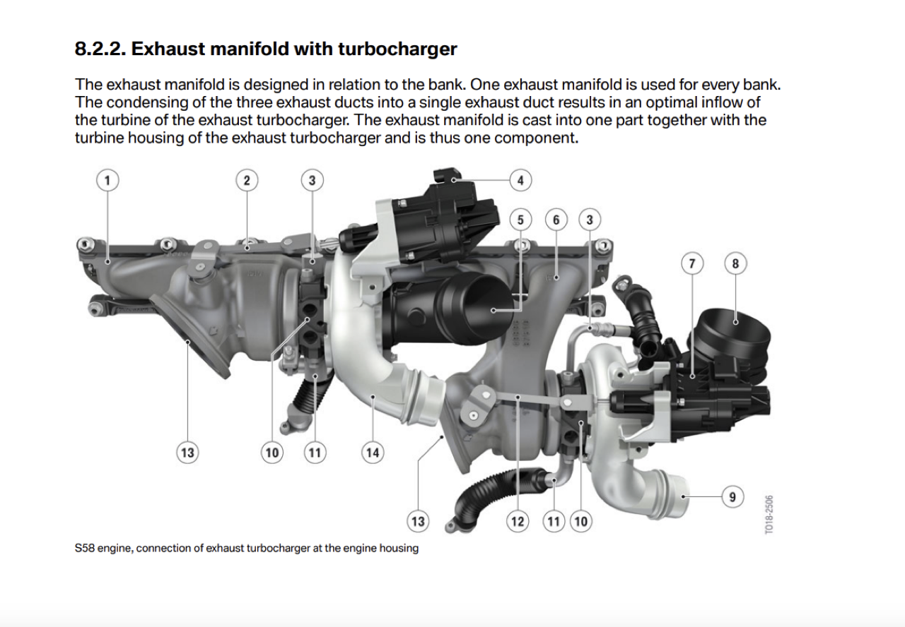 S58 ใช้เทอร์โบแฝดแบบโมโนสโครลเทอร์โบชาร์จเจอร์ สองตัว เป็นชุด คอมเพรสเซอร์ที่ถูกอัปเกรดเพิ่มประสิทธิภาพ อินเตอร์คูลเลอร์ที่ขับเคลื่อนโดยวงจรอุณหภูมิต่ำ นอกจากนี้ยังมีระบบดูดอากาศแบบใหม่ ปรับการไหลของอากาศให้เหมาะสม ลดการสูญเสียแรงดัน ระบบวาล์วระบายไอเสียที่ควบคุมด้วยอิเล็กทรอนิกส์ซึ่งปรับปรุงการปลดปล่อยไอเสียใหม่หมด แรงดันฉีดหัวฉีดไฟฟ้าสูงสุดเพิ่มขึ้นจาก 200 เป็น 350 บาร์ เทคโนโลยีการฉีดจ่ายเชื้อเพลิงไดเรคอินเจคชันแบบใหม่ที่มีความแม่นยำสูง ช่วยเพิ่มประสิทธิภาพในการเตรียมส่วนผสม ช่วยลดการปล่อยมลพิษที่ความเร็วรอบสูงหรือเมื่อผู้ขับใช้คันเร่งเต็มที่ ระบบแปรผันเต็มรูปแบบของ Valvetronic เทคโนโลยีการจับเวลาการทำงานของเพลาลูกเบี้ยวแบบแปรผัน Double-Vanos ช่วยเพิ่มกำลังและลดการปล่อยมลพิษ