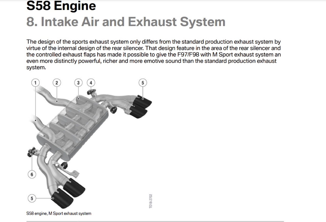 ท่อไอเสีย M Sport ของ X4 M Competition เพิ่มเสียงของท่อระบายท้ายที่ชัดเจน โดยเฉพาะอย่างยิ่ง เมื่ออยู่ภายใต้ภาระโหลดที่เพิ่มขึ้นและที่ความเร็วรอบเครื่องยนต์สูง ให้เสียงที่เหมือนรถแข่ง เพื่อประสบการณ์การขับที่เร้าอารมณ์ วาล์วแปรผันของระบบไอเสีย M Sport สามารถผลิตเสียงได้หลากหลายโทน ตั้งแต่ทุ้มต่ำเมื่อเดินเบา ไปจนถึงแฝดสนั่นเมื่อรอบเครื่องกวาดทะลุเกิน 3500 รอบต่อนาที ลากยาวไปถึง 7,000 รอบต่อนาที เสียงเครื่องยนต์และท่อท้าย เชื่อมโยงกับคุณลักษณะของ BMW M Gmbh โหมด SPORT วาล์วบายพาสในท่อระบายจะเปิดออกจนสุด ทำให้ได้เสียงคำรามที่กึกก้อง นอกจากนี้ยังสามารถใช้ปุ่ม M Sound Control บนคอนโซลกลางเพื่อควบคุมเสียงท่อท้าย เมื่อต้องการให้เงียบขึ้นขณะวิ่งในเมืองที่มีการห้ามใช้เสียงดัง สามารถกดยกเลิกหรือปิดการทำงานของระบบวาล์วปรุงแต่งเสียงของท่อระบายท้าย แต่เสียงเครื่องยนต์ก็ยังหนักแน่นเหมือนเดิม