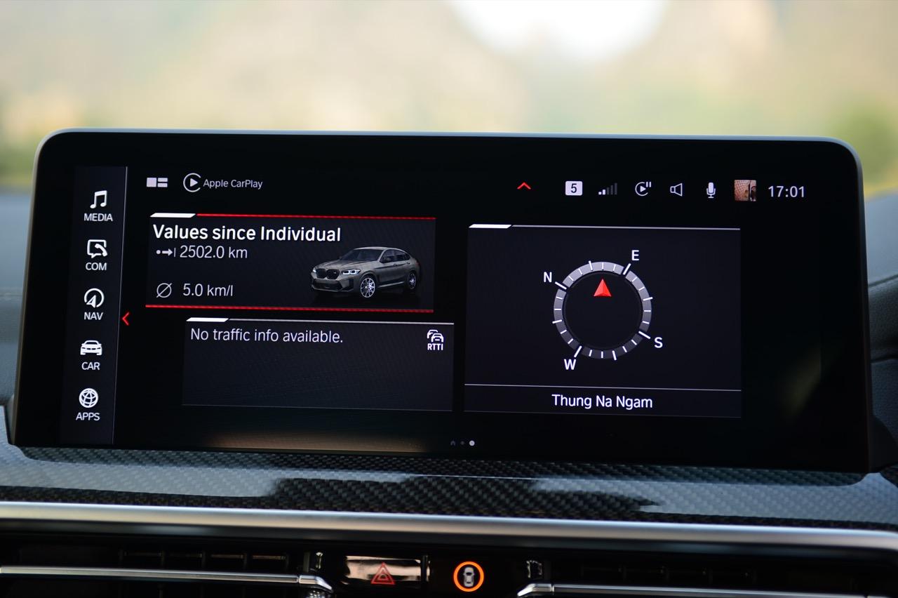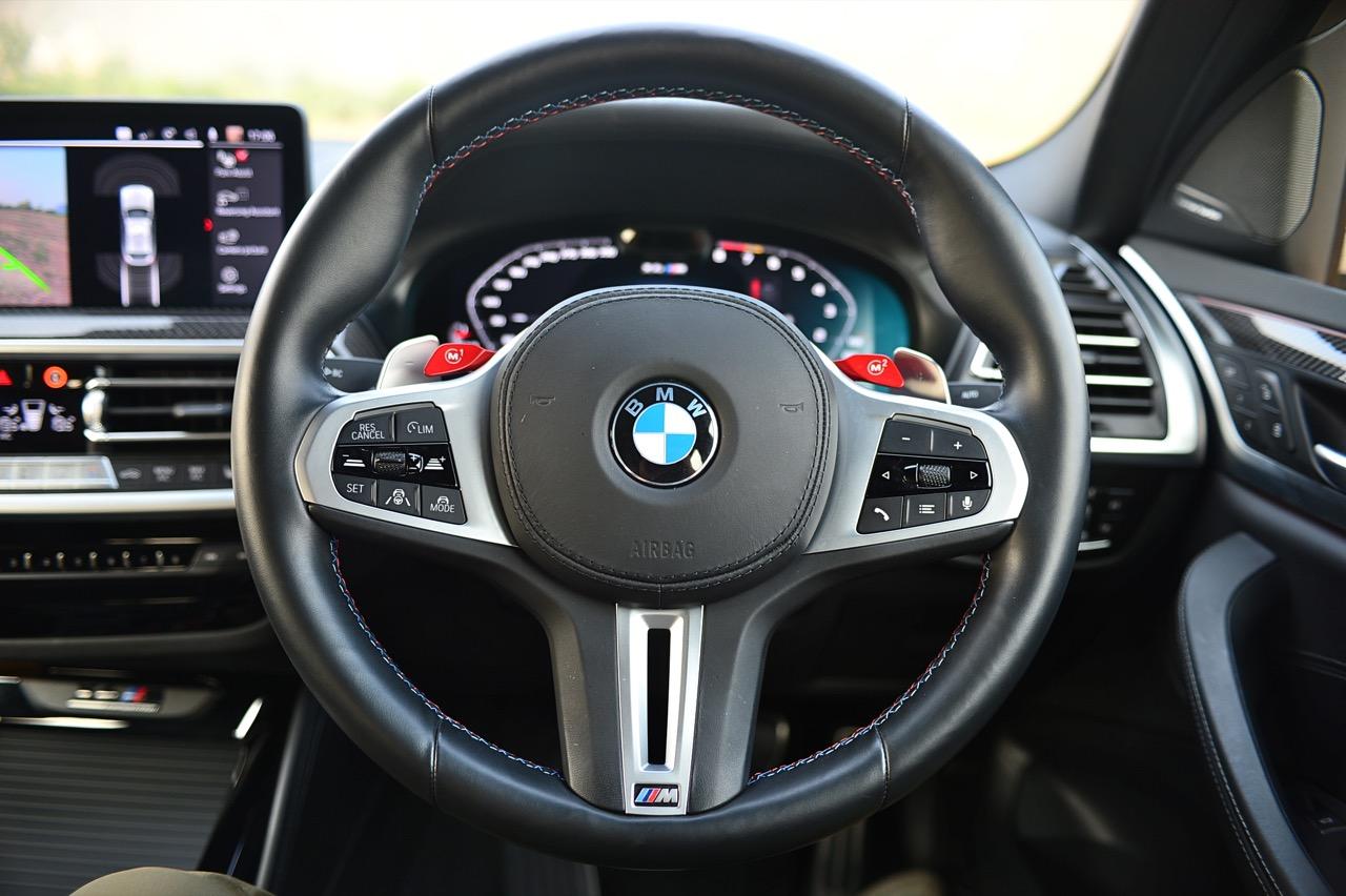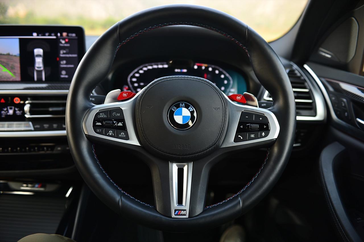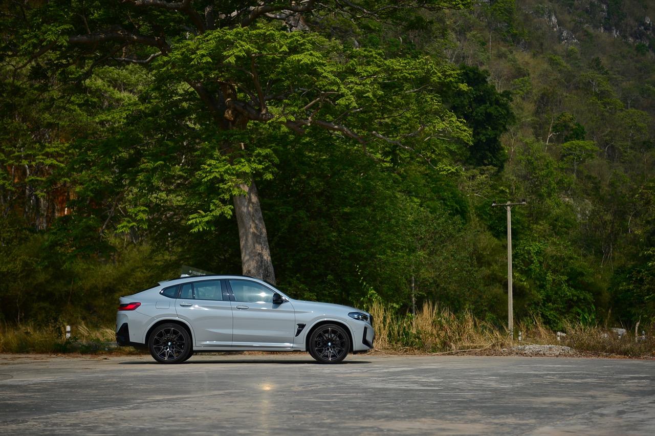 ขณะที่ผมกำลังขับรถทดสอบ BMW X4 M Competition สีเทา Brooklyn Grey metallic ราคา 8,599,000 บาท ไปรอบๆกรุงเทพมหานคร ท่ามกลางการจราจรที่คับคั่งแถบสุขุมวิท แม้ว่าจะใช้การตั้งค่าการตอบสนองของระบบขับเคลื่อนในโหมดต่ำสุดหรือโหมด Road เพื่อการควบคุมที่ง่ายที่สุด X4 M ก็ยังมีช่วงล่างที่ค่อนข้างแข็ง ความพยายามที่จะเพิ่มความเร็วในการเข้าโค้งและความสามารถในการลดอาการโคลงตัว วิศวกรแผนก M ได้ปรับแต่งเพื่อทำให้โช้คอัพไฟฟ้าตอบสนองได้อย่างเที่ยงตรงและมีค่าเฉพาะตัวเมื่อเลือกใช้โหมดที่แตกต่างกัน วิศวกรของ M เพิ่มค่าการรองรับแบบพิเศษให้กับเสาสตรัท ล้อขนาด 21 นิ้วสุดสวยแต่ล้างทำความสะอาดยาก ยางสมรรถนะกลางๆ ที่มีแก้มยางแข็งแรงราวกับหิน สุดท้าย ความแข็งของช่วงล่างจะทำให้คุณจะเกิดอาการหวาดกลัวหลุมบ่อไปตลอดทาง มันสะเทือนที่ความเร็วต่ำ แต่มั่นคงและนิ่งเมื่อใช้ความเร็วบนทางด่วน
