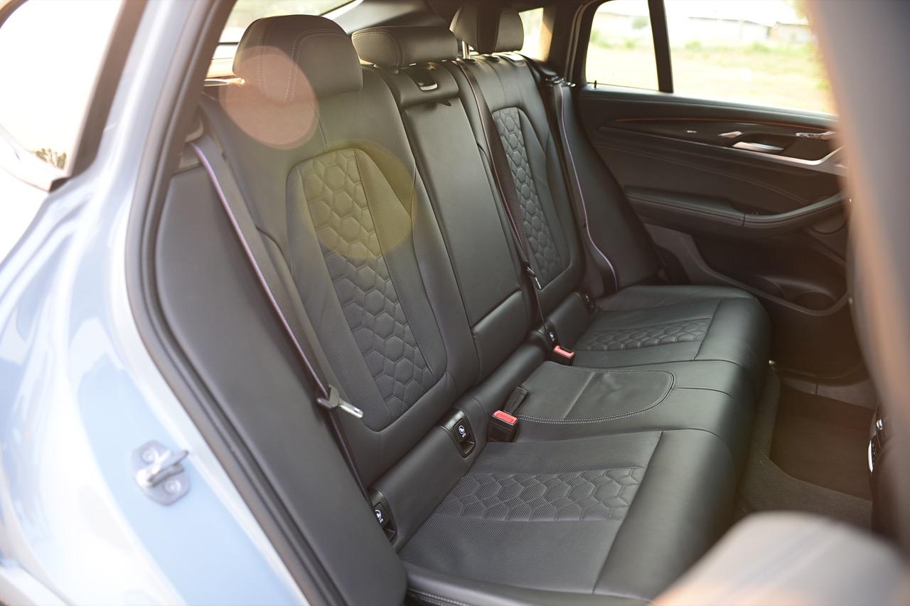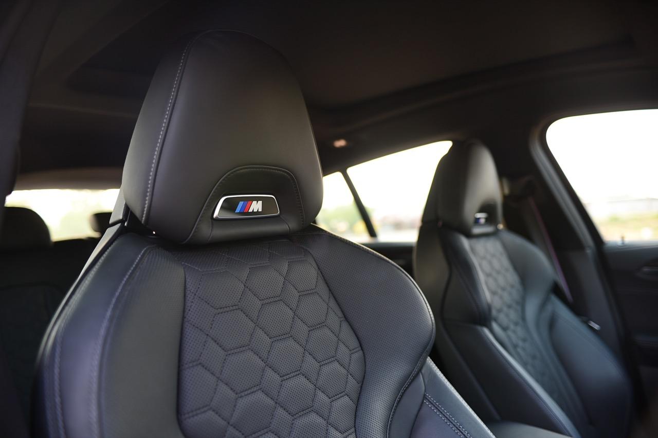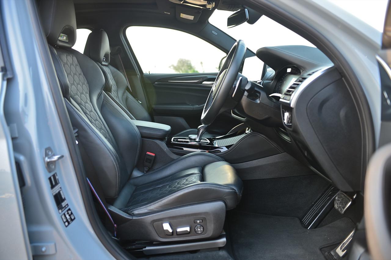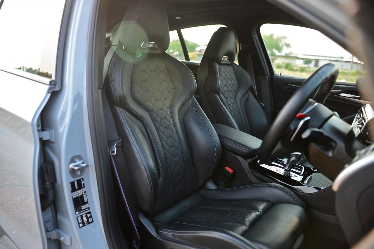 X4 M Competition มาพร้อมเบาะนั่งสปอร์ต M ปรับไฟฟ้า พร้อมพนักพิงศีรษะแบบปรับไฟฟ้าและโลโก้ M แบบเรืองแสงที่พนักพิงศีรษะ ทำให้ตราสัญลักษณ์บนหัวเบาะนั้นเรืองแสงทั้งกลางวันและกลางคืน เบาะนั่งหุ้มหนัง Merino สีดำ เช่นเดียวกับในรุ่น Bicolor สีส้ม Sakhir/ดำ, สีเทา Adelaide Grey/สีส้ม Sakhir และ Midrand Beige/Black เบาะนั่งหุ้มหนัง Merino ของ BMW Individual ในสี Tartufo มีให้เลือกเป็นออปชันเสริม เบาะนั่งแบบสปอร์ตของ M ปรับด้วยไฟฟ้าทั้งการเดินหน้าถอยหลัง ยก กระดกตัวรองน่อง หรือปรับจุดที่เป็นพนักพิงหลังเพื่อความโอบกระชับ เมื่อต้องขับในสนามแข่ง เข็มขัดนิรภัยแพ็กเกจ Competition เสริมด้วยแถบ BMW M พวงมาลัยหนังมัลติฟังก์ชันของ M สวยงามและประณีตด้วยการเย็บเฉดสีที่ตัดกันของ BMW M