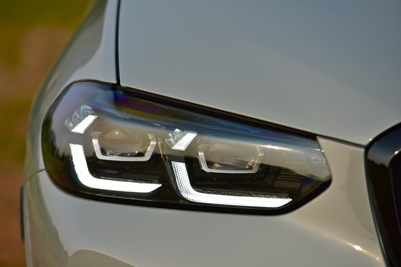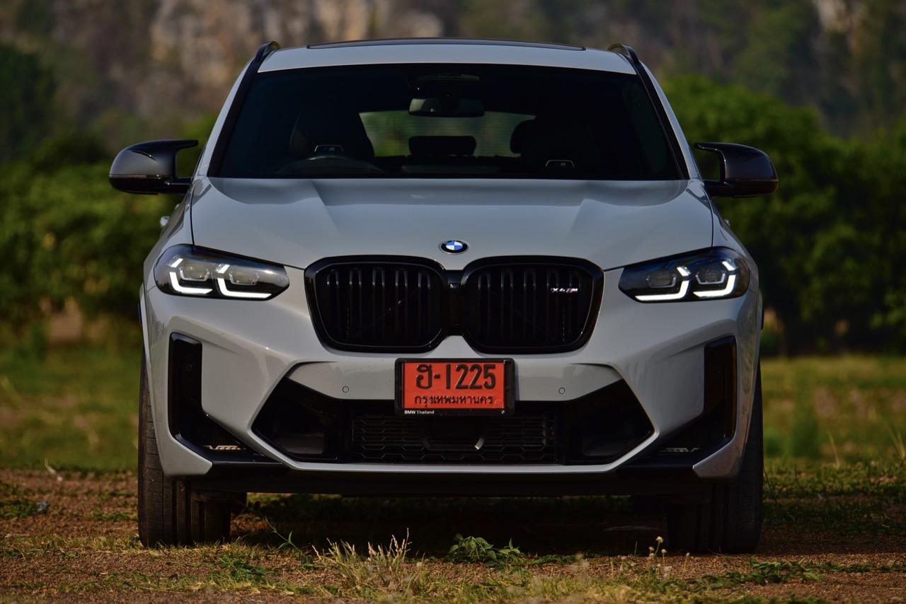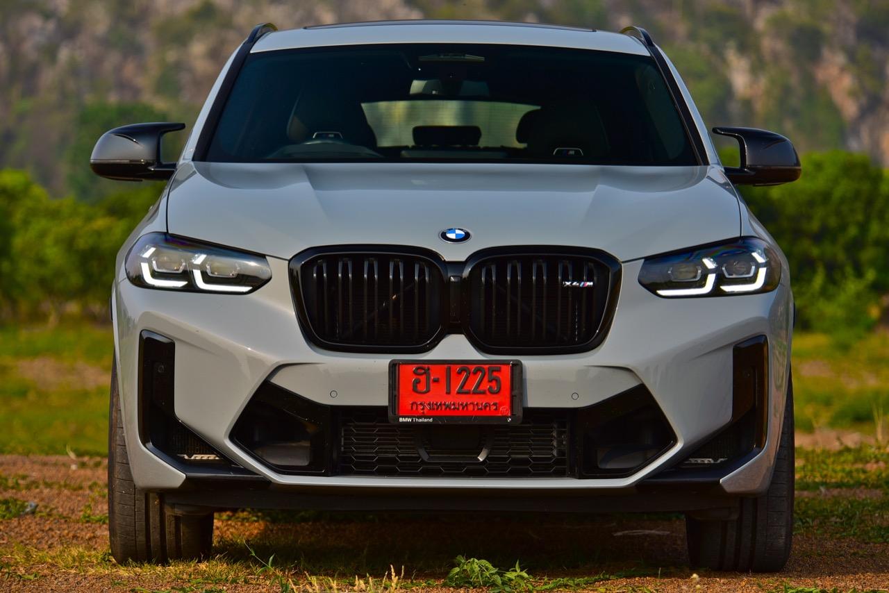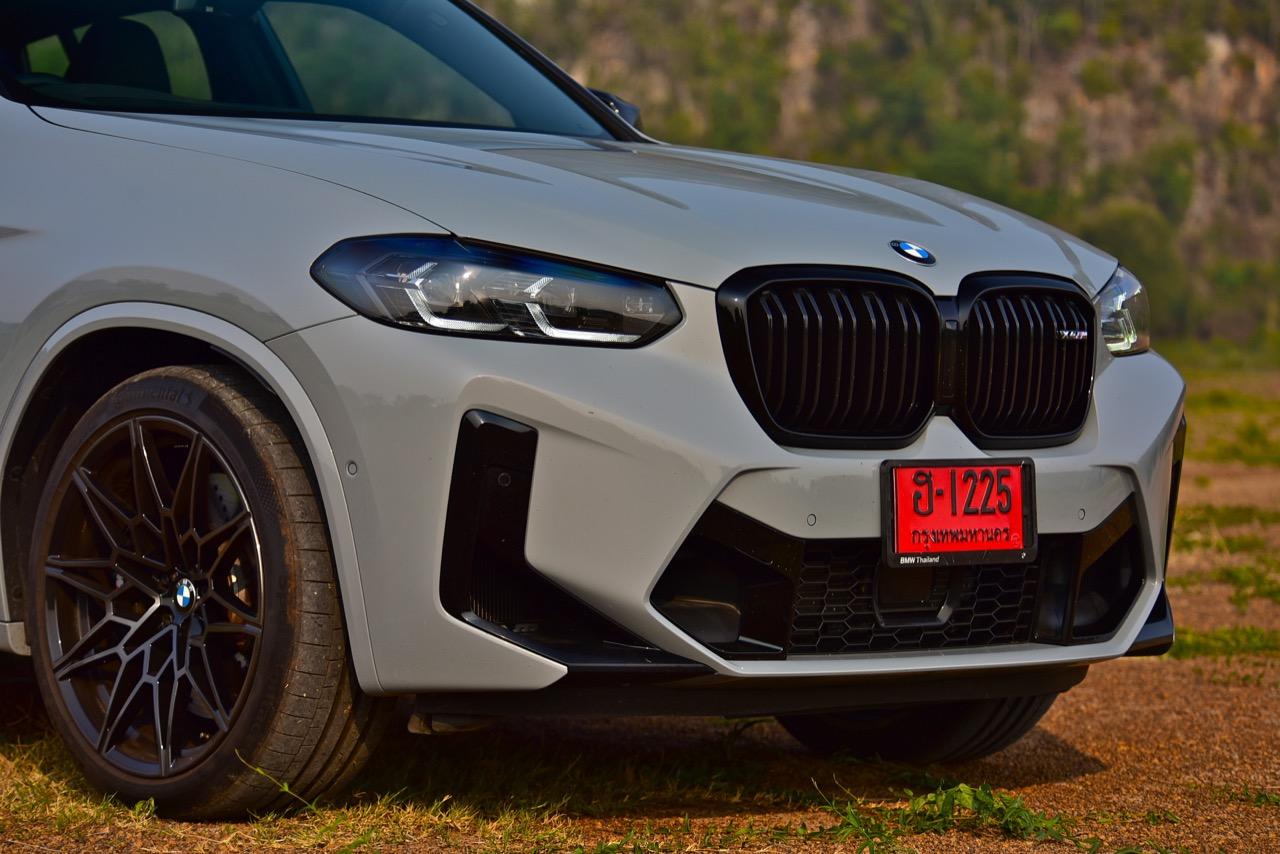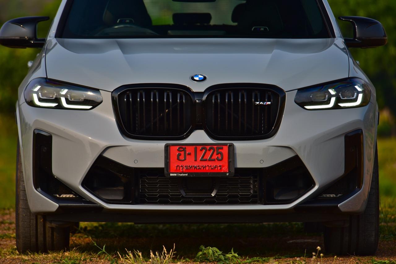 รถทดสอบ BMW X4 M Competition สีเทา Brooklyn Grey metallic ราคา 8,599,000 บาท เข้าสู่ช่วงที่สองของรุ่น ด้วยรูปลักษณ์โฉม LCI 2022-2023 ที่ดุเดือดเลือดพล่านมากกว่า X4 รุ่นมาตรฐาน แม้แต่ X4 M40i ตัวแรงก็ยังไม่โหดเท่า X4 M Competition LCI ตกแต่งด้านหน้าด้วยกระจังหน้าพลาสติกสีดำเงารูปไตคู่ขนาดใหญ่ พร้อมด้วยกรอบแบบชิ้นเดียว ตราสัญลักษณ์ X4M ขนาดเล็กแปะอยู่บนกระจังด้านขวา เมื่อหันหน้าเข้าหารถ ไฟหน้า Adaptive LED พร้อมไฟหรี่กลางวัน LED Daytime Running Light ระบบไฟอัตโนมัติ Adaptive LED พร้อมซอฟต์แวร์ที่ปรับปรุงใหม่ ทำให้ไฟอัตโนมัติใน X4 M Competition LCI ทำงานได้เร็วขึ้น ระบบเบี่ยงเบนลำแสง จะทำการแบ่งช่องไฟเพื่อไม่ทำให้แสงไฟไปรบกวนสายตาของผู้ขับคันอื่นทั้งข้างหน้าและที่แล่นสวนมา Adaptive LED สามารถยกไฟสูงคาเอาไว้ในขณะที่แล่นเข้าไปใกล้กับรถคันข้างหน้า หรือรถที่กำลังแล่นสวนทางมา การเบี่ยงเบนลำแสงไปยังไหล่ทาง เพื่อเปิดทัศนวิสัยให้มองเห็นได้อย่างชัดเจน Adaptive LED ทำงานเร็วและมีกำลังในการส่องสว่างไกลประมาณ 600 เมตร ไฟหน้าถูกรีดให้บางลง 0.4 นิ้ว BMW M GmbH ออกแบบกันชนหน้า M เฉพาะของ X4 M ให้โดดเด่นยิ่งขึ้นสำหรับตัว LCI ปี 2022 ช่องเปิดรับอากาศขนาดใหญ่ในกันชนหน้า ช่วยส่งลมเย็นส่งไปยังเครื่องยนต์ ระบบส่งกำลัง รวมถึงยังนำกระแสลมไประบายความร้อนให้กับระบบเบรกได้อย่างเหมาะสม ในขณะที่รายละเอียดการออกแบบ ลักษณะเฉพาะของรถ M ที่ด้านหน้า ด้านข้าง และด้านหลัง เป็นไปตามหลักอากาศพลศาสตร์โดยไม่มีชิ้นส่วนที่รกหูรกตาหรือไร้ประโยชน์