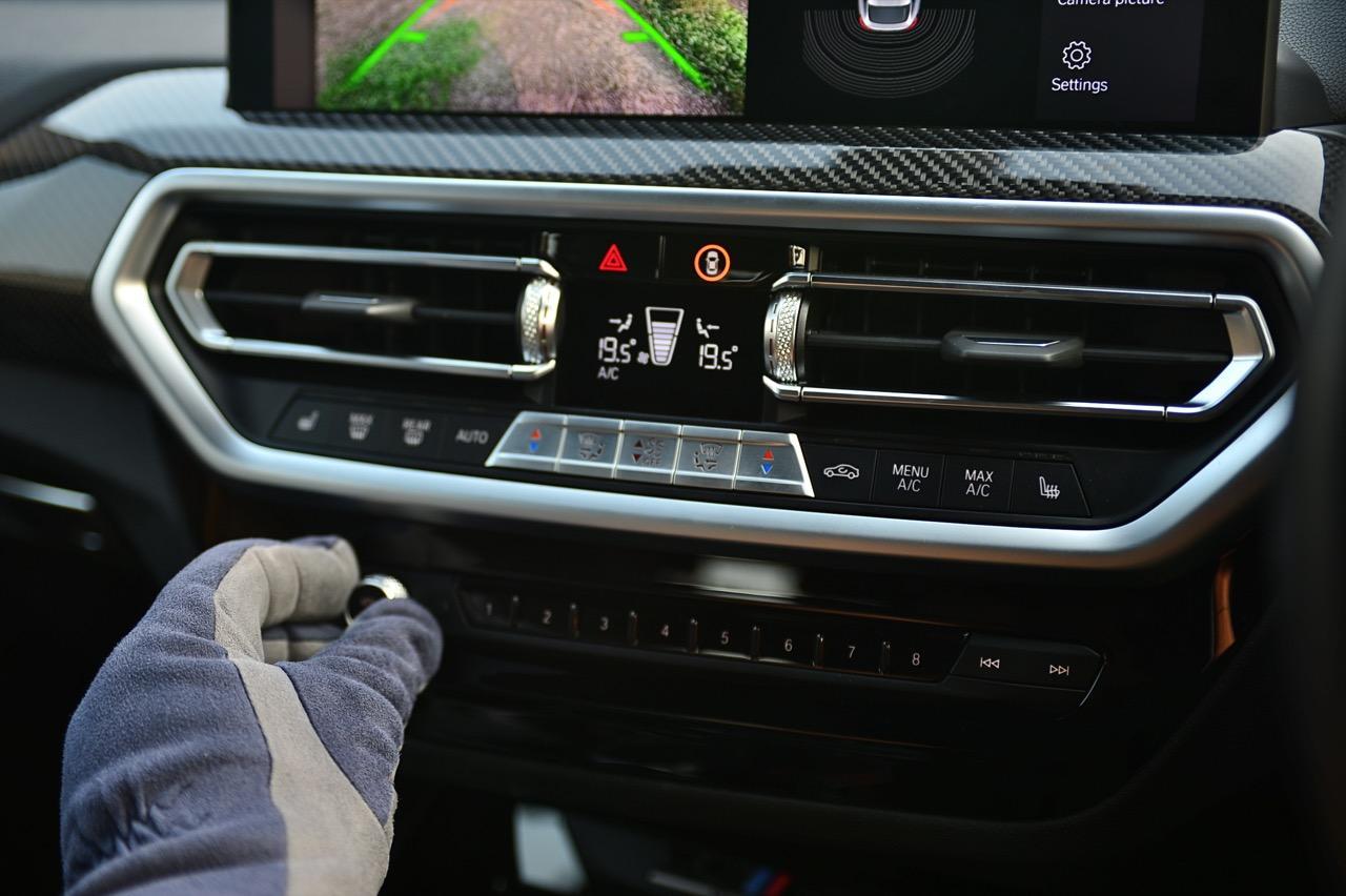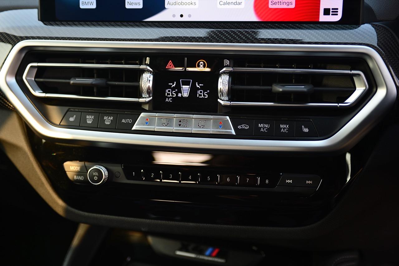 ชุดควบคุมสำหรับระบบปรับอากาศอัตโนมัติแบบ 3 โซน ชุดควบคุมบนคอนโซลกลางออกแบบใหม่ มีต้นกำเนิดมาจาก BMW M3 และ M4 รุ่นปัจจุบัน รวมถึงปุ่มใหม่สองปุ่ม นอกเหนือจากตัวเลือกเกียร์ M พร้อมสวิตช์โยก Drivelogic, BMW Controller และปุ่มสตาร์ตเครื่องยนต์สีแดง ปุ่มตั้งค่า เข้าถึงตัวเลือกการตั้งค่าทั้งหมด สำหรับควบคุมการตอบสนองของเครื่องยนต์และระบบกันสะเทือนได้โดยตรง ปุ่มนี้ใช้เพื่อเข้าถึงเมนูในหน้าจอควบคุม แสดงรายการการตั้งค่าเรียลไทม์ สามารถจัดเก็บและเรียกใช้การตั้งค่าโหมด M ที่กำหนดค่าแยกกันได้สองแบบโดยใช้ปุ่ม M สองปุ่มบนพวงมาลัย