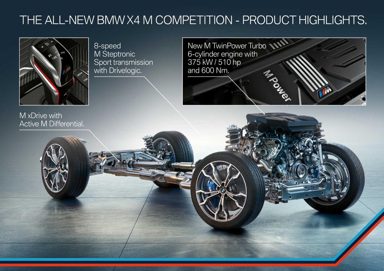 ระบบส่งกำลังขับเคลื่อนผ่านกระปุกเกียร์อัตโนมัติที่ติดตั้งทอร์คคอนเวอร์เตอร์แปดสปีดที่ปรับเทียบใหม่พร้อมแป้นเปลี่ยนเกียร์ที่พวงมาลัยและระบบขับเคลื่อนสี่ล้อ xDrive แบบแปรผันเต็มรูปแบบของ BMW M ซึ่งใช้ร่วมกับ M3, M4 และ M5 มีโหมดขับเคลื่อนจำนวนมากจนน่าตกใจผ่านฟังก์ชัน DriveLogic มาตรฐาน ช่วยให้ผู้ขับขี่สามารถปรับเปลี่ยนลักษณะของเครื่องยนต์ กระปุกเกียร์ ระบบขับเคลื่อนสี่ล้อ ช่วงล่าง พวงมาลัย และ DSC (ระบบควบคุมเสถียรภาพไดนามิก) ระบบกันสะเทือนแบบปีกนกคู่และระบบกันสะเทือนแบบมัลติลิงค์ที่เป็นรากฐานของ X4 M Competition ได้รับการปรับแต่งใหม่โดยเป็นส่วนหนึ่งของความพยายามในการตอบคำวิจารณ์เกี่ยวกับการขับขี่ที่สมบุกสมบัน การเปลี่ยนแปลงที่เรียกว่า Adaptive M set-up รวมถึงโช้คอัพแบบปรับได้ที่ได้รับการปรับปรุงใหม่ ซึ่งมีเป้าหมายเพื่อให้สอดคล้องกับการใช้ความเร็ว
