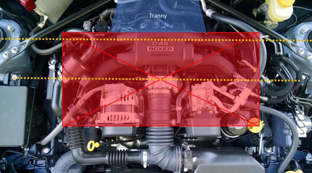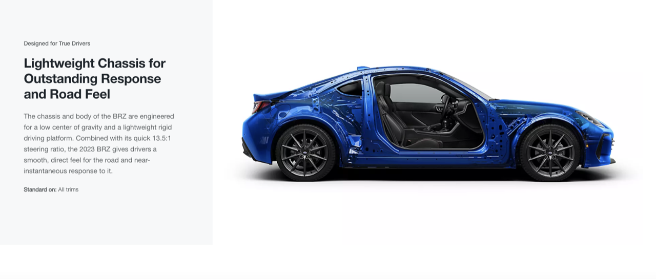 สูตรสำเร็จในการสร้างรถสปอร์ตคูเป้คันเล็กนี้ ยังคงไม่มีการเปลี่ยนแปลง นั่นก็คือ เครื่องยนต์อยู่ด้านหน้า วางต่ำเตี้ยเรี่ยพื้นเพื่อลดจุดศูนย์ถ่วง จริงๆ แม่งโคตรเตี้ยอยู่แล้ว วางเครื่องเตี้ยแบบนั้นรถจะตอบโต้เร็วมาก BRZ ยังทำตัวเป็นซูบี้ขับเคลื่อนล้อหลัง ตัวถังเน้นที่ความเบาและความคล่องตัวเหนือสิ่งอื่นใด เอาอะลูมิเนียมมาทำฝากระโปรง หลังคา เพื่อลดน้ำหนัก ลองเปิดฝากระโปรงดูก็จะรู้ว่า ยกแล้วเบามือมาก หากมองในแง่มิติแล้ว BRZ ใหม่นั้นยาวกว่ารุ่นก่อน 1.2 นิ้ว และสูงสั้นกว่า 0.4 นิ้ว มันหนักขึ้นเพียง 7.7 กิโลกรัม น้ำหนักรวม 1,289 กิโลกรัม ในสเปกที่เบาที่สุด แม้จะมีเครื่องยนต์ที่ใหญ่กว่าเดิมและมีอุปกรณ์อำนวยความสะดวกสบายมากกว่ารถรุ่นแรก แต่น้ำหนักก็ไม่ได้เพิ่มมากมายอะไร
