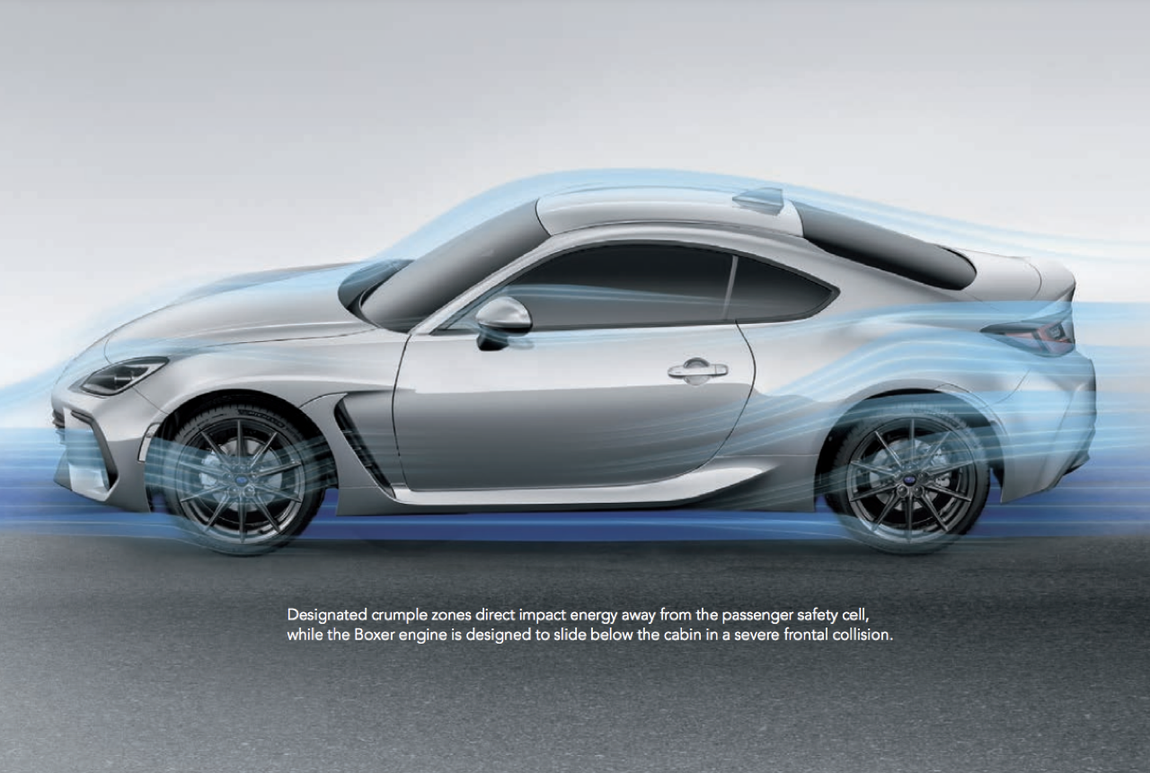 กระจังหน้าหกเหลี่ยมที่ต่ำลงและกว้าง บ่งบอกถึงจุดศูนย์ถ่วงที่ต่ำของ SUBARU BRZ เส้นที่เริ่มต้นจากกระจังหน้าต่อเนื่องผ่านบังโคลนหน้าไปทางท้ายรถ แสดงออกถึงความแข็งแกร่งของแนวแกนกลางตัวถัง ไดนามิกระหว่างห้องโดยสารที่แคบและบังโคลนที่ทรงพลัง ทำให้เกิดความคาดหวังถึงสมรรถนะ ในฐานะรถสปอร์ตของแบรนด์หมู่ดาว BRZ 2023 ใช้อุปกรณ์แอโรไดนามิกหลายรายการ เช่น สปอยเลอร์ธรณีประตูด้านข้างและช่องระบายอากาศที่อยู่ด้านหลังบังโคลนหน้า คุณลักษณะเหล่านี้ไม่เพียงแต่เพิ่มจุดเด่นให้กับการออกแบบภายนอก แต่ยังเพิ่มประสิทธิภาพของรถในด้านอากาศพลศาสตร์