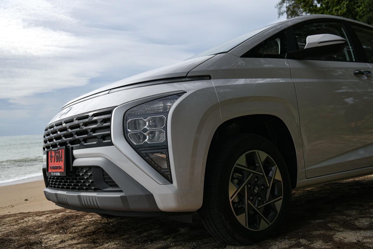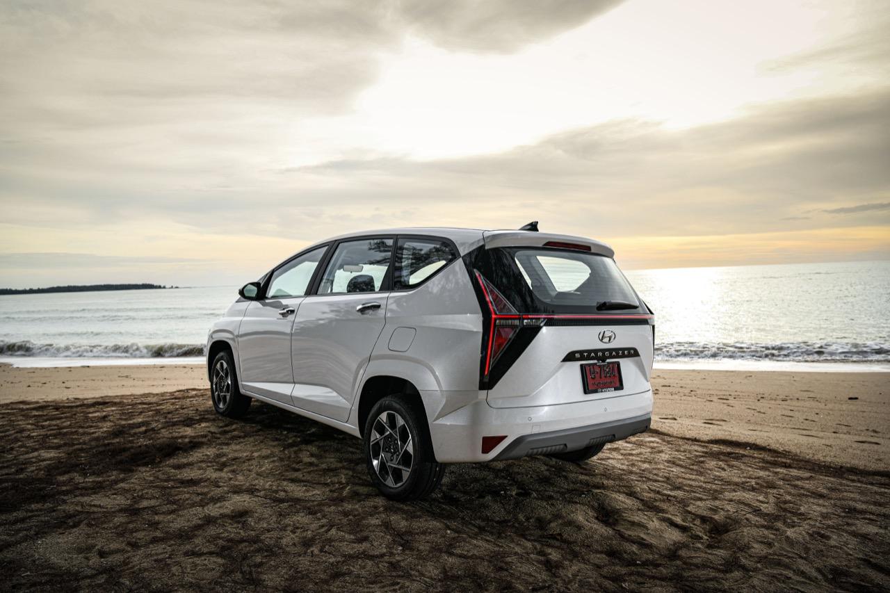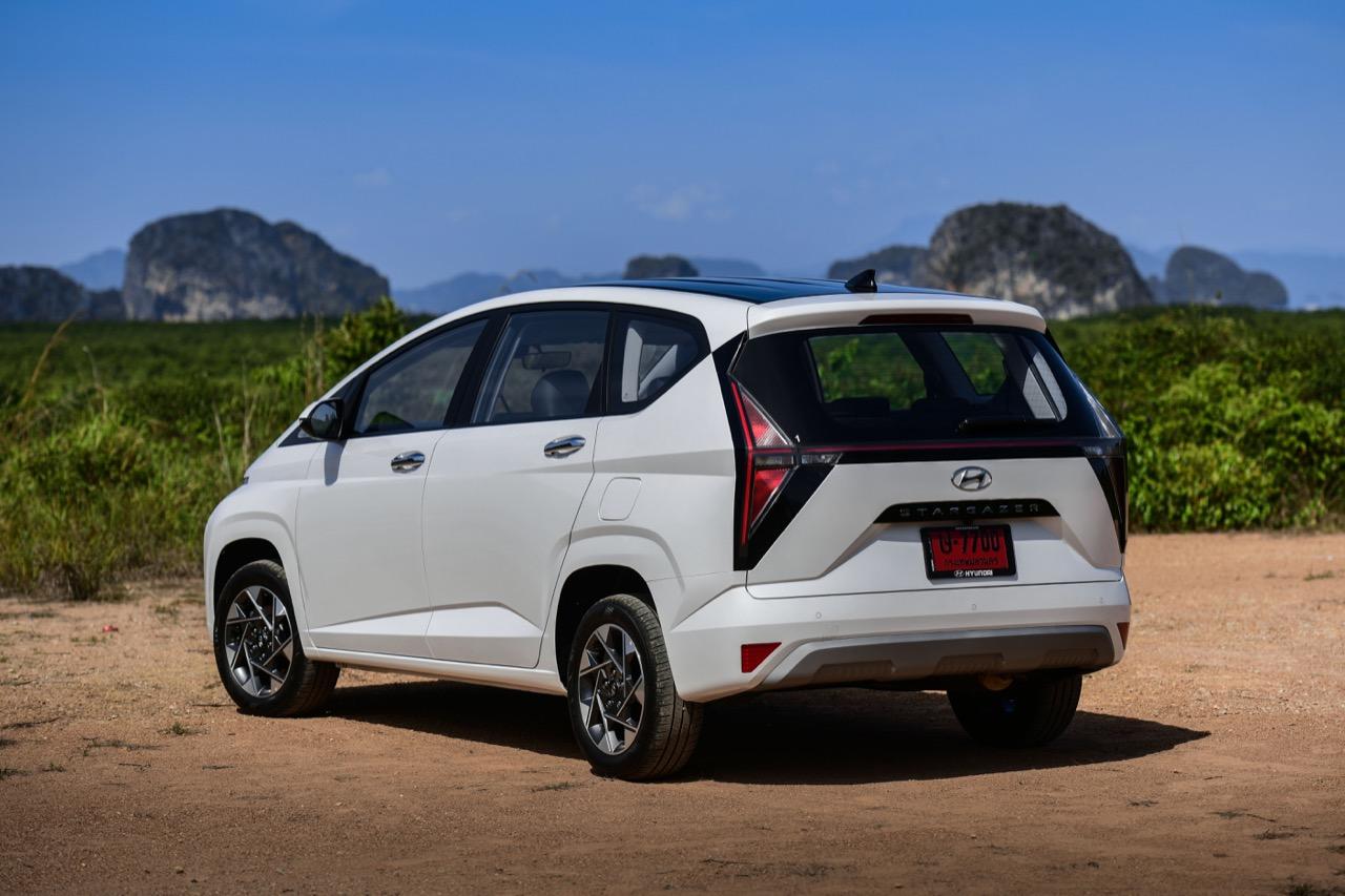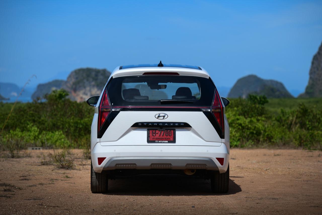 รูปลักษณ์นั้นสั้นกว่า Xpander และ Veloz แต่มีพื้นที่ภายในกว้างใช้ได้ ทรงด้านข้างออกแนวป้อมอ้วน บานประตูกหลังเปิดเข้าออกสะดวก เส้นด้านข้าง ลากจากขอบด้านบนของไฟหน้า ผ่านบานประตูทั้งสองไปจนถึงกึ่งกลางของขอบไฟท้าย รุ่น Smart 6) 6 ที่นั่ง ราคา 910,000 บาท คันทดสอบสีขาวหลังคาดำ Creamy White Pear ล้ออัลลอยขอบ 16 นิ้ว ไซล์ 16 x 6.5J ยาง 205/55 R16 ไฟท้ายตรงยาวจากขอบด้านหลังของเสาท้ายไปจนถึงขอบของกันชนหลัง ไฟท้าย LED ออกแบบให้เข้ากับส่วนท้ายของรถและมีรูปทรงสวยงามแปลกตา คล้ายกับยานอวกาศ ฝาท้ายไม่มีระบบไฟฟ้า เปิดออกในมุมที่กว้างแบบยกขึ้นเพื่อความสะดวกในการขนสัมภาระเข้าไปเก็บ มิติตัวถังของ Hyundai Stargazer มีความยาว 4,460 มิลลิเมตร กว้าง 1,780 มิลลิเมตร สูง 1,695 มิลลิเมตร ความยาวฐานล้อ 2,780 มิลลิเมตร ความสูงจากพื้นถึงใต้ท้องรถ 195 มิลลิเมตร ปริมาตรถังน้ํามัน 40 ลิตร น้ําหนักรถโดยประมาณ 1,272 กิโลกรัม รัศมีวงเลี้ยวแคบสุด 5.4 เมตร