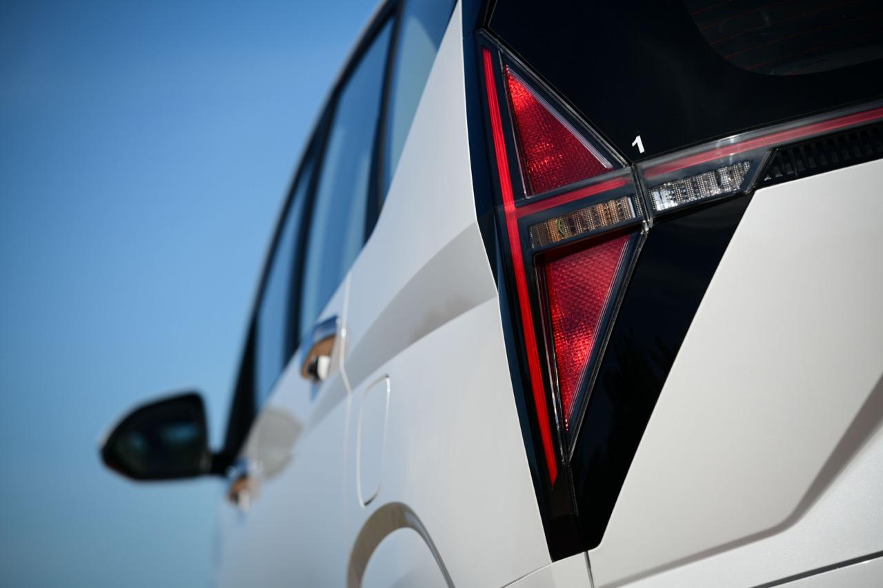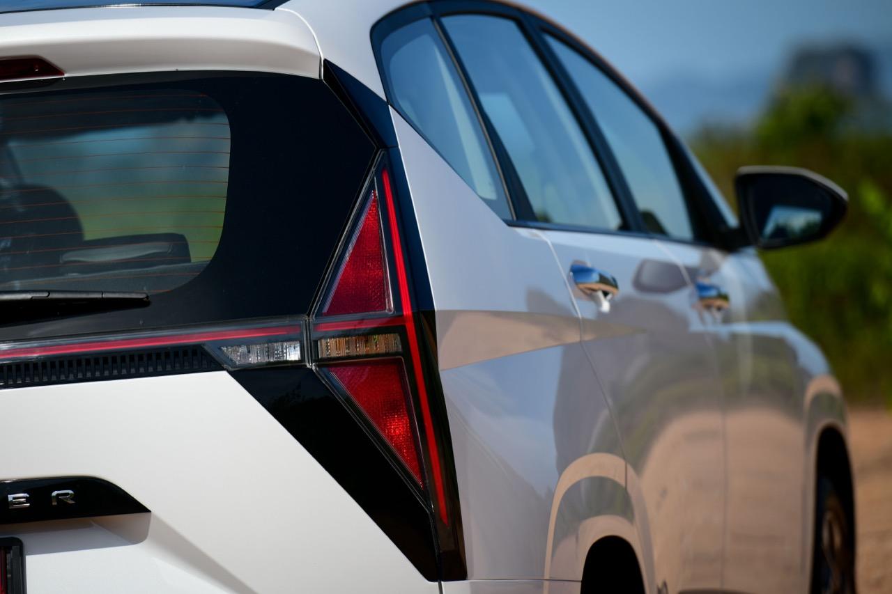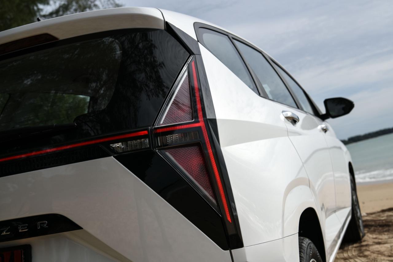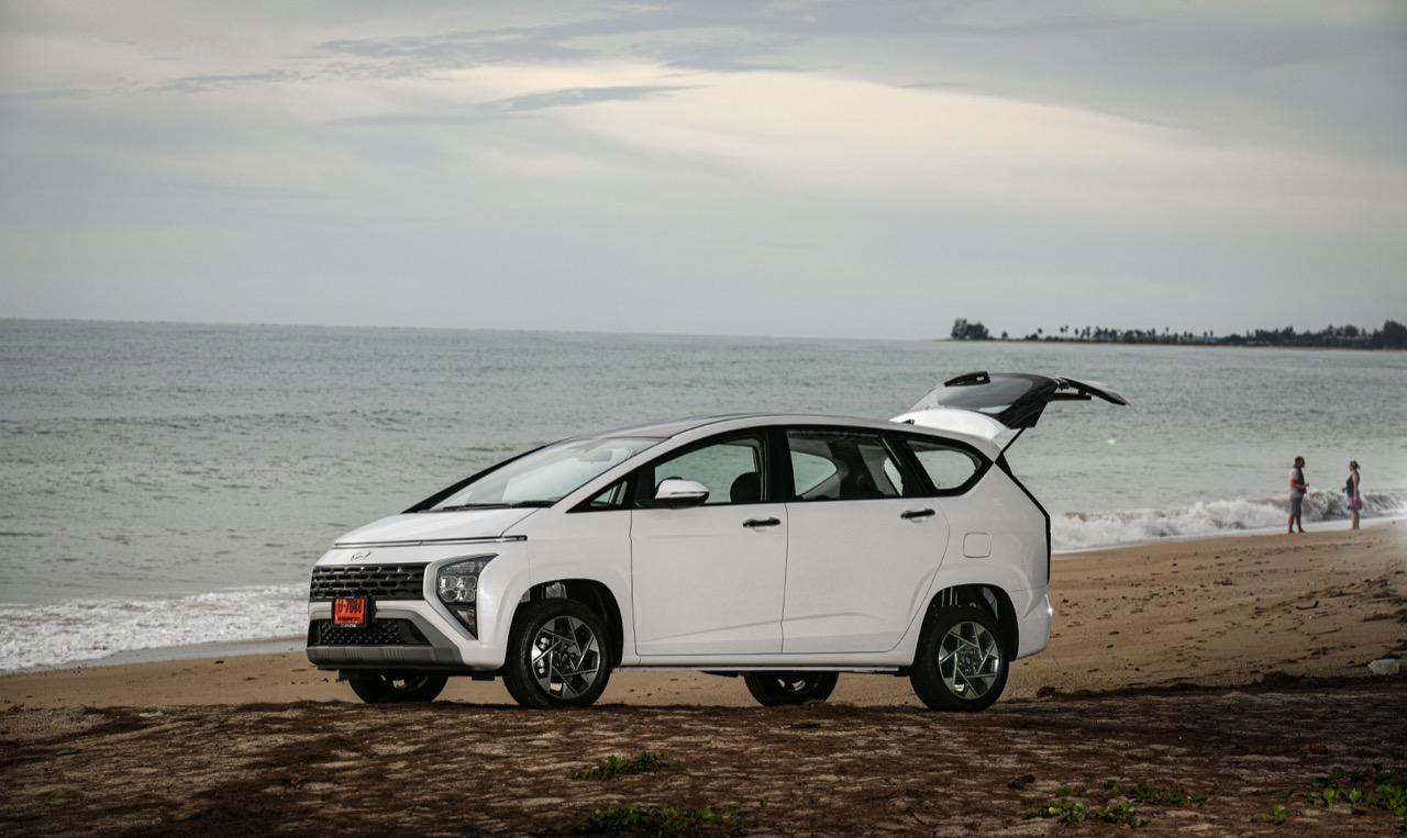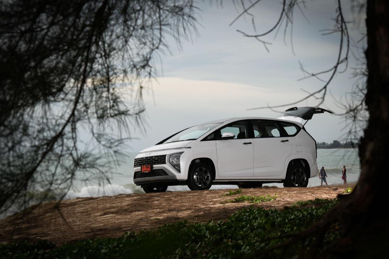รูปลักษณ์นั้นสั้นกว่า Xpander และ Veloz แต่มีพื้นที่ภายในกว้างใช้ได้ ทรงด้านข้างออกแนวป้อมอ้วน บานประตูกหลังเปิดเข้าออกสะดวก เส้นด้านข้าง ลากจากขอบด้านบนของไฟหน้า ผ่านบานประตูทั้งสองไปจนถึงกึ่งกลางของขอบไฟท้าย รุ่น Smart 6) 6 ที่นั่ง ราคา 910,000 บาท คันทดสอบสีขาวหลังคาดำ Creamy White Pear ล้ออัลลอยขอบ 16 นิ้ว ไซล์ 16 x 6.5J ยาง 205/55 R16 ไฟท้ายตรงยาวจากขอบด้านหลังของเสาท้ายไปจนถึงขอบของกันชนหลัง ไฟท้าย LED ออกแบบให้เข้ากับส่วนท้ายของรถและมีรูปทรงสวยงามแปลกตา คล้ายกับยานอวกาศ ฝาท้ายไม่มีระบบไฟฟ้า เปิดออกในมุมที่กว้างแบบยกขึ้นเพื่อความสะดวกในการขนสัมภาระเข้าไปเก็บ มิติตัวถังของ Hyundai Stargazer มีความยาว 4,460 มิลลิเมตร กว้าง 1,780 มิลลิเมตร สูง 1,695 มิลลิเมตร ความยาวฐานล้อ 2,780 มิลลิเมตร ความสูงจากพื้นถึงใต้ท้องรถ 195 มิลลิเมตร ปริมาตรถังน้ํามัน 40 ลิตร น้ําหนักรถโดยประมาณ 1,272 กิโลกรัม รัศมีวงเลี้ยวแคบสุด 5.4 เมตร