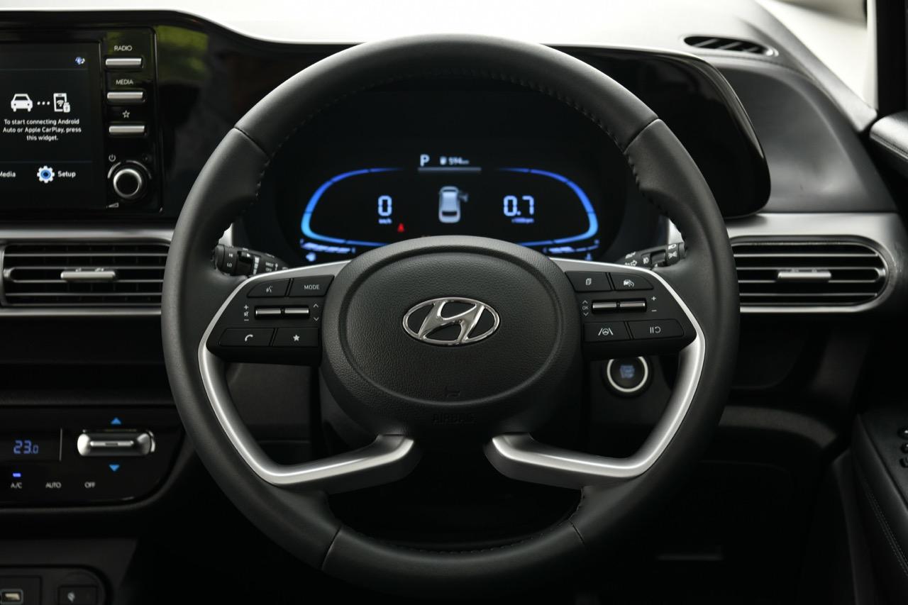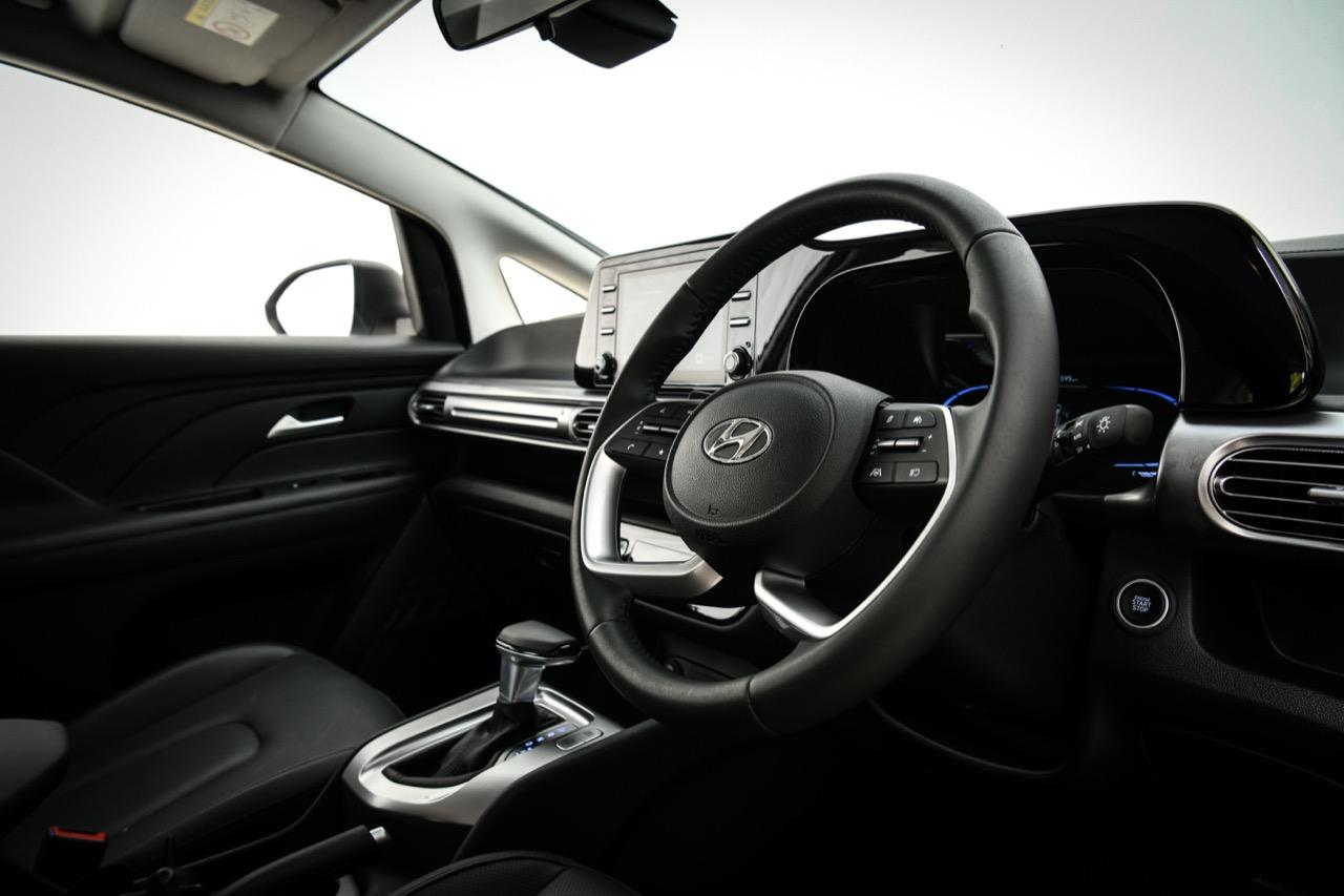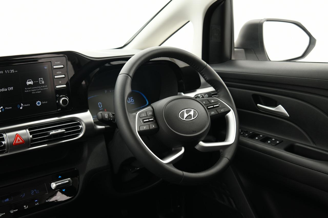 พวงมาลัยแบบสี่ก้านสีดำ หุ้มหนังแท้จับได้อย่างถนัดมือ คล้ายกับพวงมาลัยของ Hyundai Staria ก้านวงด้านขวา มีปุ่มปรับระบบปรับตั้งความเร็วอัตโนมัติ Cruise Control ปุ่มควบคุมระบบรักษาช่องทางและแจ้งเตือนการออกนอกเลน ก้านวงด้านซ้ายเป็นปุ่มสั่งงานด้วยเสียง โหมดของระบบอินโฟเทนเมนท์ ปุ่มรับและวางสายโทรศัพท์บูลธูท
