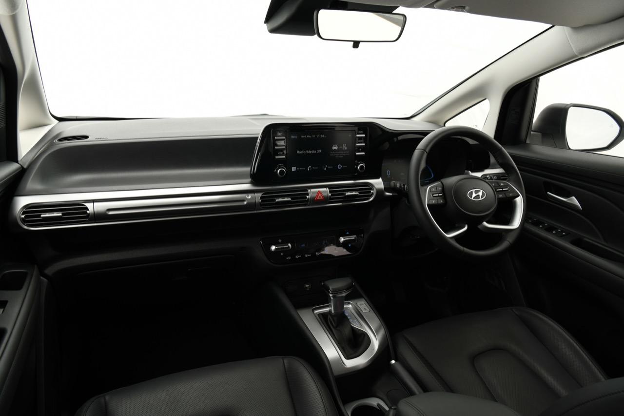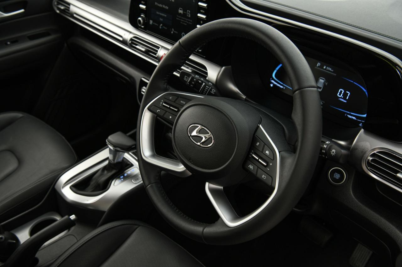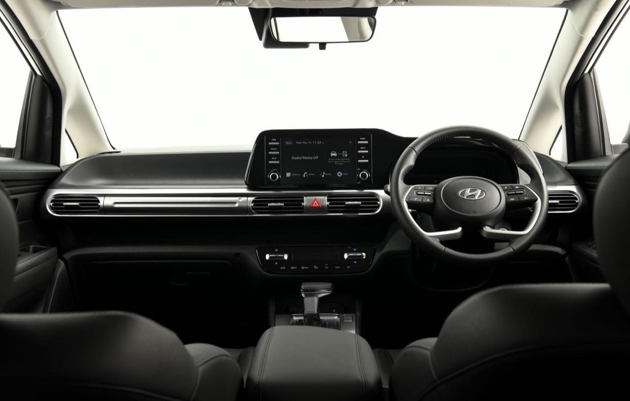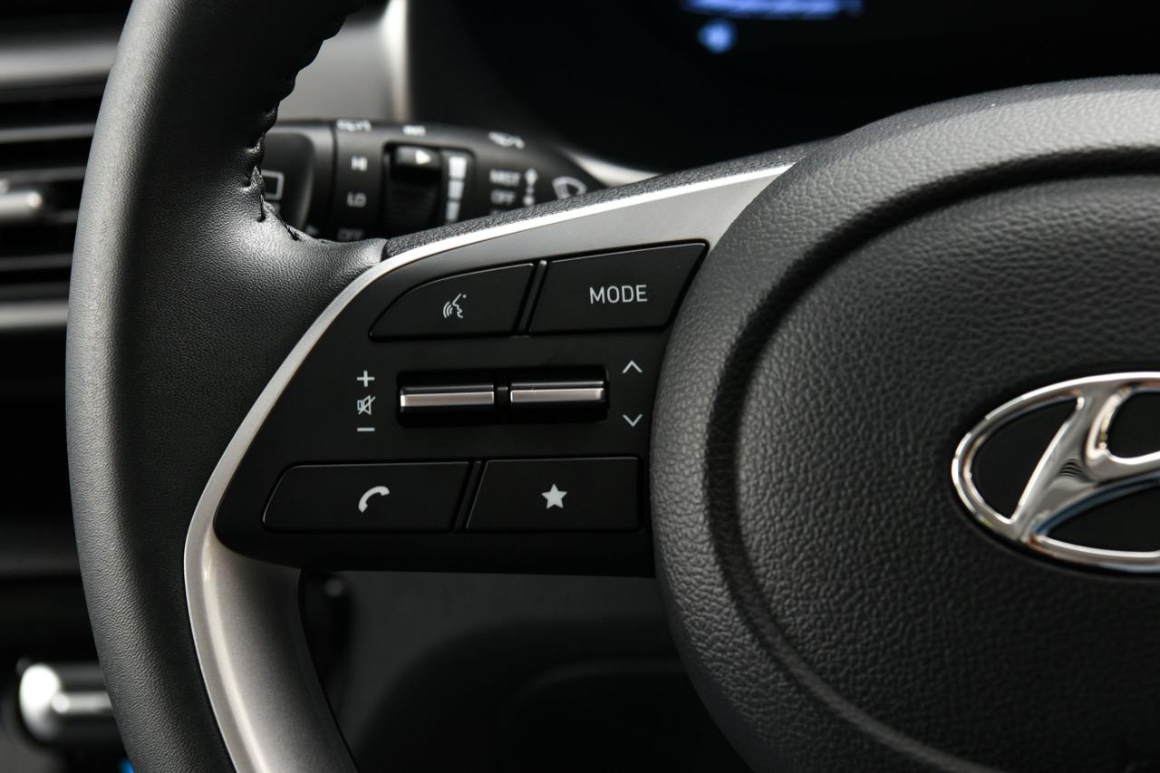 พวงมาลัยแบบสี่ก้านสีดำ หุ้มหนังแท้จับได้อย่างถนัดมือ คล้ายกับพวงมาลัยของ Hyundai Staria ก้านวงด้านขวา มีปุ่มปรับระบบปรับตั้งความเร็วอัตโนมัติ Cruise Control ปุ่มควบคุมระบบรักษาช่องทางและแจ้งเตือนการออกนอกเลน ก้านวงด้านซ้ายเป็นปุ่มสั่งงานด้วยเสียง โหมดของระบบอินโฟเทนเมนท์ ปุ่มรับและวางสายโทรศัพท์บูลธูท