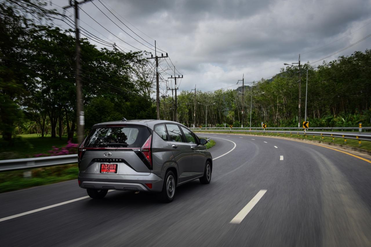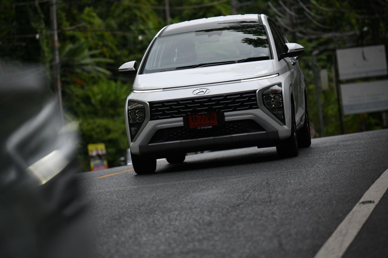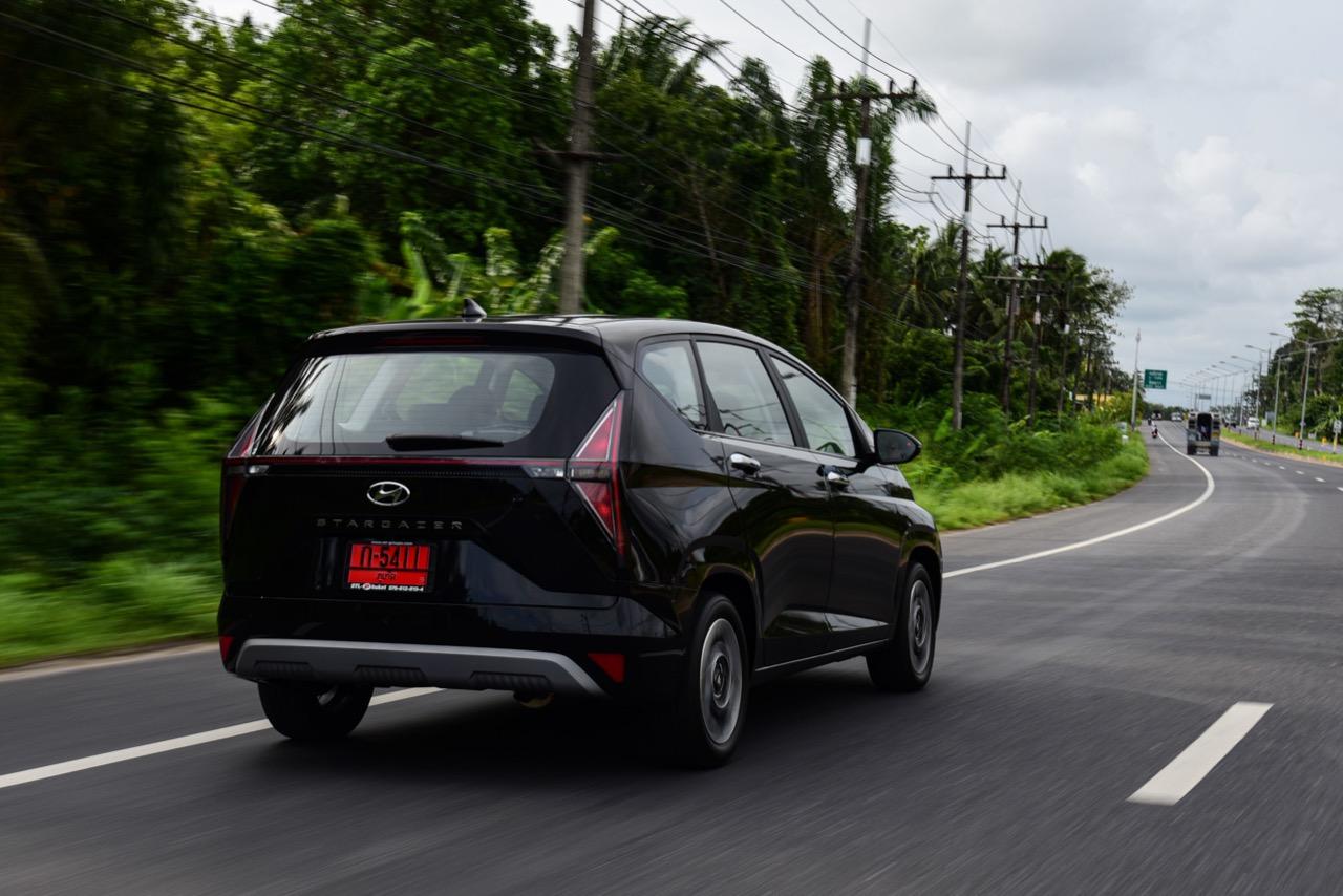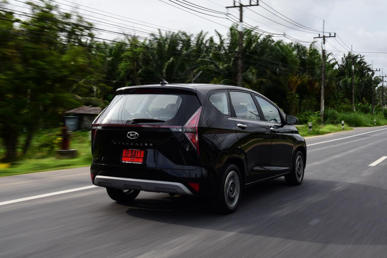ช่วงล่างของ Hyundai Stargazer เข้ากับทางลาดยางแบบสองเลนสวนกันแถวๆพังงา ระบบรองรับด้านหน้าแมคเฟอร์สัน สตัรท สปริงโช้คอัพและเหล็กกันโคลง ช่วงล่างหลังแบบทอร์ชันบีม ให้ความรู้สึกอยู่ตรงกลางระหว่างความนิ่มนวลของ Xpander และความหนึบของ XL7 ในย่านความเร็วสูงก็ทรงตัวได้ดี ส่วนการใช้ความเร็วเดินทางไม่เกิน 120 กิโลเมตรต่อชั่วโมง ทำให้ควบคุมรถได้ง่าย เนื่องจากการเซ็ตค่าช่วงล่างแบบกลางๆ ไม่แข็ง หรือนุ่มมากจนเกินไป เมื่อบรรทุกผู้โดยสาร 4 คน พร้อมสัมภาระเต็มคัน กำลังของเครื่องยนต์เพียงพอต่อการเร่งความเร็วเพื่อแซง แต่แรงบิดแค่ 144 นิวตันเมตร ไม่ได้มากมายอะไร ได้เกียร์ดีๆ อย่าง IVT เข้ามาช่วย การแซงก็ต้องมีการกะระยะให้ดีๆ เผื่อเหลือเผื่อขาดเอาไว้บ้างเนื่องจาก Stargazer ไม่ได้มีเรี่ยวแรงมากนัก แค่พอเร่งความเร็วเพื่อแซงได้อย่างปลอดภัย ส่วนการเก็บเสียง เมื่อลองขับและนั่งก็พบว่า เบาะแถวกลางเก็บเสียงได้ดี ส่วนโซนของคนขับและผู้โดยสารตอนหน้า จะได้ยินเสียงเครื่องยนต์ดังอย่างชัดเจนเมื่อใช้คันเร่งสำหรับแซงแบบกดลงจนสุด ย่านความเร็ว 80-100 กิโลเมตร การเก็บเสียง ถือว่าได้มาตรฐาน ยิ่งขับไม่เร็วแค่ 60 กิโลเมตร โดยเฉพาะการขับผ่านตัวเมืองเล็กๆของพังงานในอำเภอท้ายเหมือง Stargazer เป็นรถที่มีความเงียบอยู่ในเกณฑ์ดี