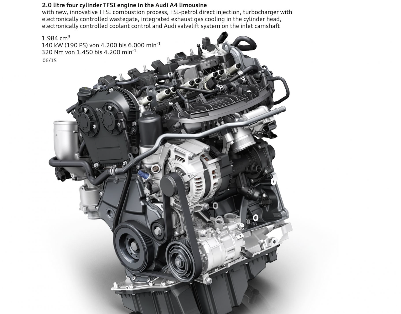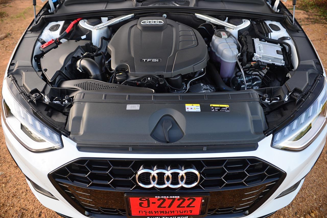 เครื่องยนต์ของ Audi ยุคใหม่นั้นขึ้นชื่อในเรื่องของความแรง Audi A4 40 TFSI S-Line วางเครื่องยนต์เบนซินแถวเรียง 4 สูบ 16 วาล์ว พร้อมระบบวาล์วแปรผัน Audi valvelift system เครื่องยนต์วางตามยาว ขับเคลื่อนล้อหน้า เครื่อง 4 สูบ อัดอากาศด้วยเทอร์โบ ระบบจ่ายเชื้อเพลิงแบบผสมผสาน Dual Injection ซึ่งอยู่ตรงกลางระหว่าง Direct Injection และ Manifold Injection ในแต่ละสูบของเครื่อง 2.0 TFSI ใช้หัวฉีดเชื้อเพลิง 2 หัว ระบบ Dual Injection จะควบรวมการทำงานโดยขึ้นตรงกับโหลดและรอบเครื่องเป็นหลัก โดยมี Direct Injection เป็นหัวฉีดฝั่งแรงดันสูง ใช้เทคโนโลยีล่าสุดของหัวฉีดแบบ Piezo สามารถฉีดจ่ายเชื้อเพลิงได้เร็ว ปลดปล่อยแรงดันสูงสุด 250 บาร์ โดยที่แรงดันในการฉีดจ่ายเชื้อเพลิงจะแปรผันไปตามโหลดของเครื่องยนต์เป็นหลัก เครื่องยนต์เบนซิน ความจุ 1984 ซีซี กำลัง 190 แรงม้า แรงบิด 320 นิวตันเมตร เร่งจาก 0-100 กิโลเมตรต่อชั่วโมงใน 7.3 วินาที ความเร็วสูงสุด 240 กิโลเมตรต่อชั่วโมง