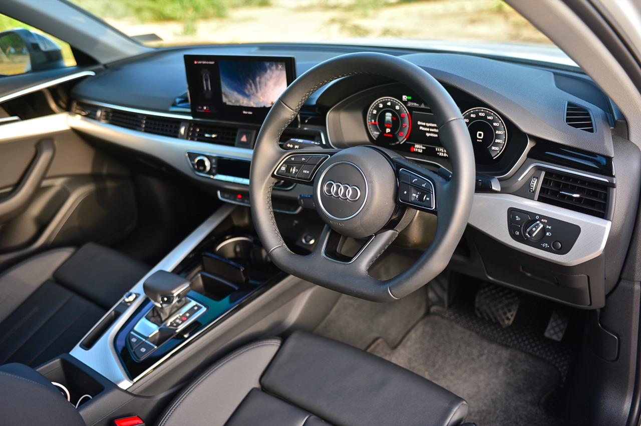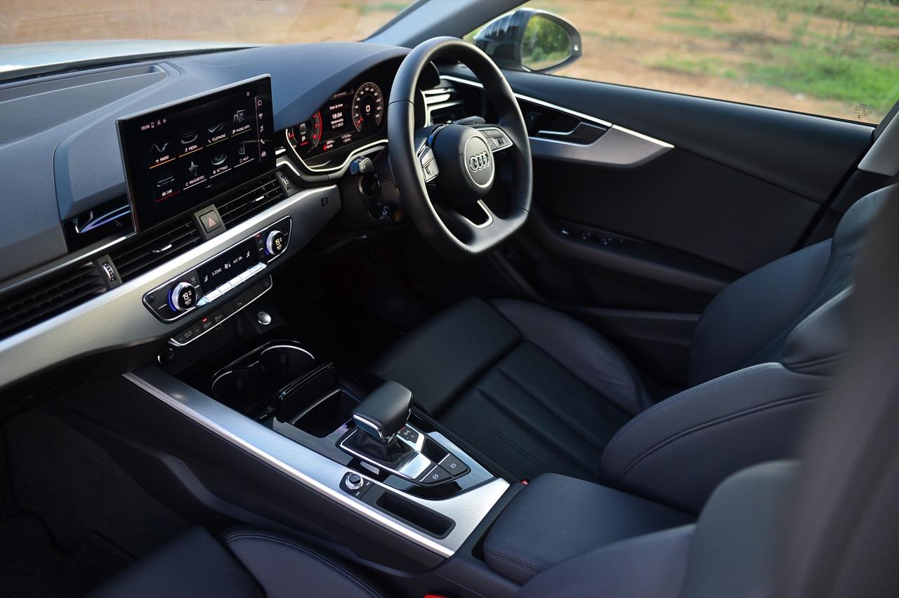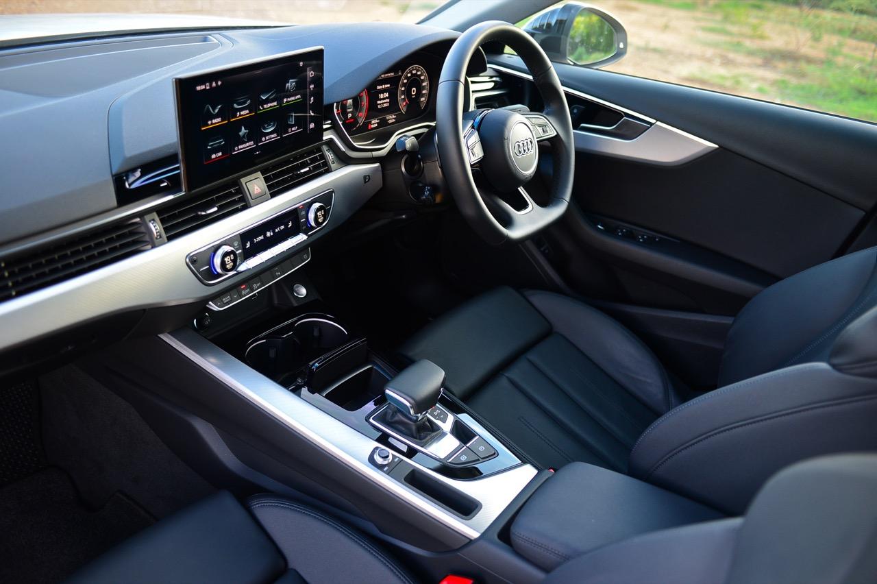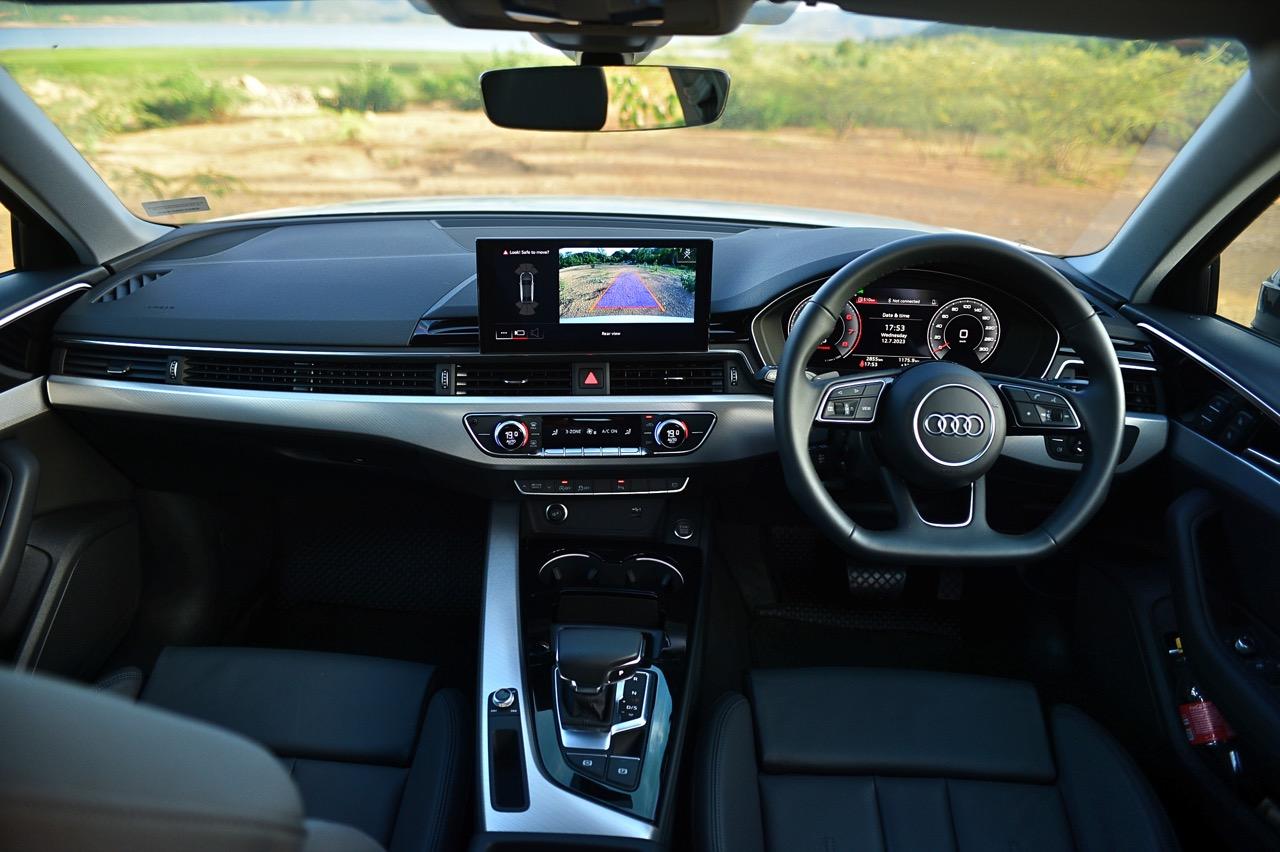 ภายในของ A4 Facelift มีการปรับปรุงเพื่อยกระดับความทันสมัย กราฟิกของระบบสาระบันเทิงที่ได้รับการปรับเปลี่ยนนั้นเหมือนกับพี่น้องสี่ห่วงยุคใหม่ปี 2023 เมนูใช้งานแยกย่อย จัดวางอย่างมีเหตุผล จอภาพมาตรวัด ขนาด 12.3 นิ้ว เวอร์ชันล่าสุด ปรับเปลี่ยนการแสดงผลได้อย่างหลากหลาย คุณภาพของวัสดุที่สัมผัสได้และงานประกอบทั่วทั้งห้องโดยสารนั้นอยู่ในระดับสูงอย่างน่าพึงพอใจเมื่อเทียบกับราคา 2.6 ล้าน A4 รุ่นปรับปรุง Connect กับฟังก์ชั่นออนไลน์ที่นิยมใช้งานกันในยุคนี้ แดชบอร์ดคอนโซลเน้นเหลี่ยมมุมที่ลงตัว ตัดขอบด้วยพลาสติกสีดำเงากับชิ้นงานอัลลอยสีเงิน ชุดควบคุมระบบปรับอากาศที่คุ้นเคย พร้อมระบบแอร์แบบสามโซน (รวมช่องแอร์และการปรับตั้งอุณหภูมิของเบาะผู้โดยสารตอนหลัง S Line iCon Black จัดเบาะไฟฟ้าคู่หน้าแบบสปอร์ต เบาะคนขับมีหน่วยความจำเพื่อเพิ่มความสะดวกในการใช้งาน เบาะหลังแบบสามที่นั่งแต่นั่งสองคนจะสบายตัวมากกว่า พื้นที่เหนือศีรษะและพื้นที่วางขาของเบาะหลังมีพอเพียง สำหรับช่องเชื่อมต่อ USB ให้มาทั้ง Type A และ C