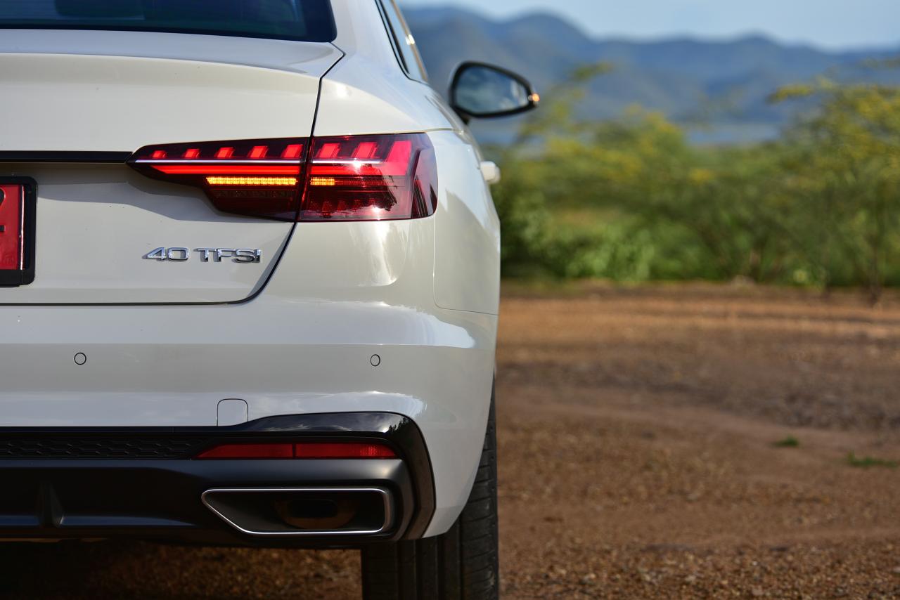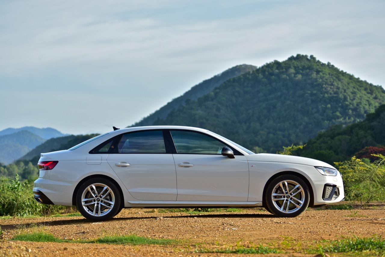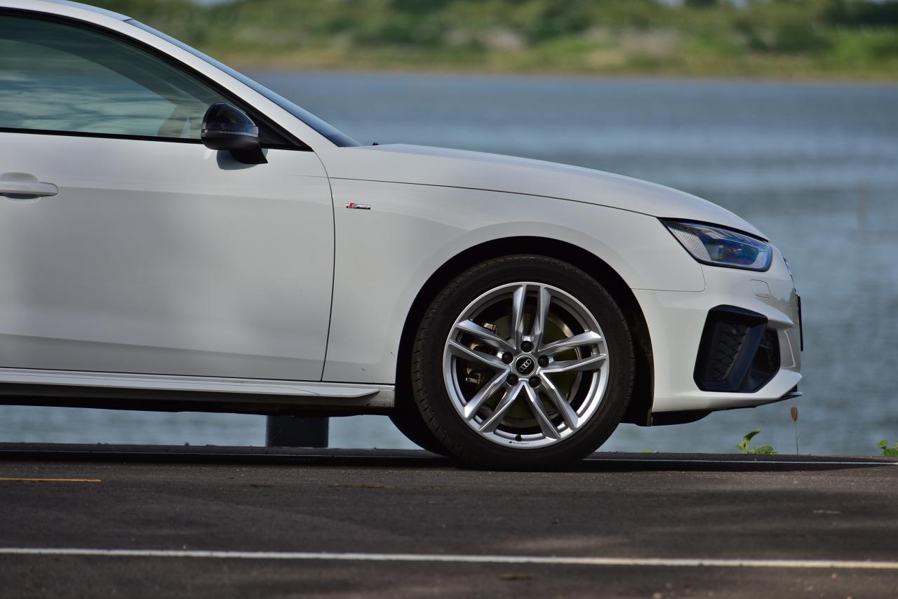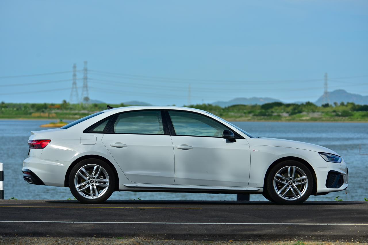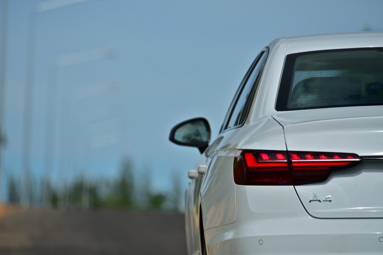 A4 ไหลลื่นด้วยเส้นข้างลำตัวลากจากมุมไฟหน้าผ่านบานประตูไปจนถึงมุมของไฟท้าย เสาหน้าและเสาท้ายถูกรีดจนบางเฉียบ บานประตูทั้งสี่บริเวณขอบกระจกกรุทับด้วยงานอัลลอยสีดำ iCon Black เพื่อยกระดับความหรู ล้ออัลลอยขอบ 18 นิ้ว ลาย 10 ก้านคู่ ยางเกาหลียี่ห้อ Hankook รุ่น ventus s1 evo2 ไซส์ 245/40 R18 ไฟท้าย LED แบบใหม่คมกริบราวกับใบมีด ออกแบบให้เชื่อมโยงเหลี่ยมมุมบริเวณส่วนท้ายของตัวรถ A4 ได้อย่างกลมกลืน