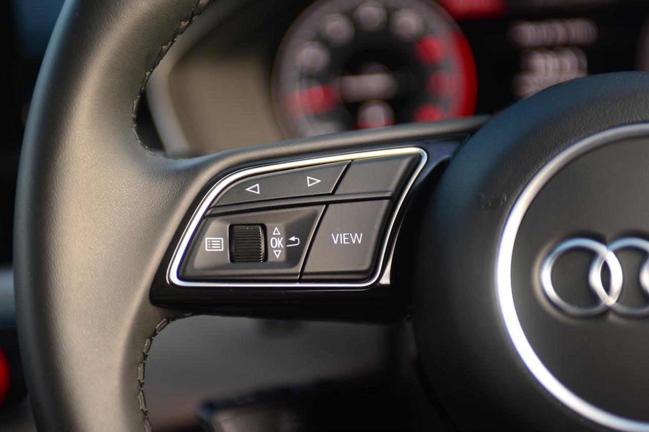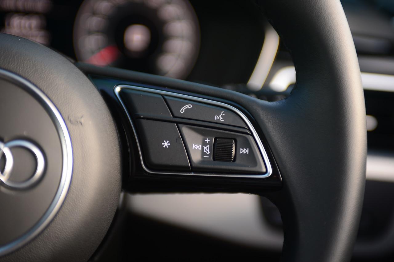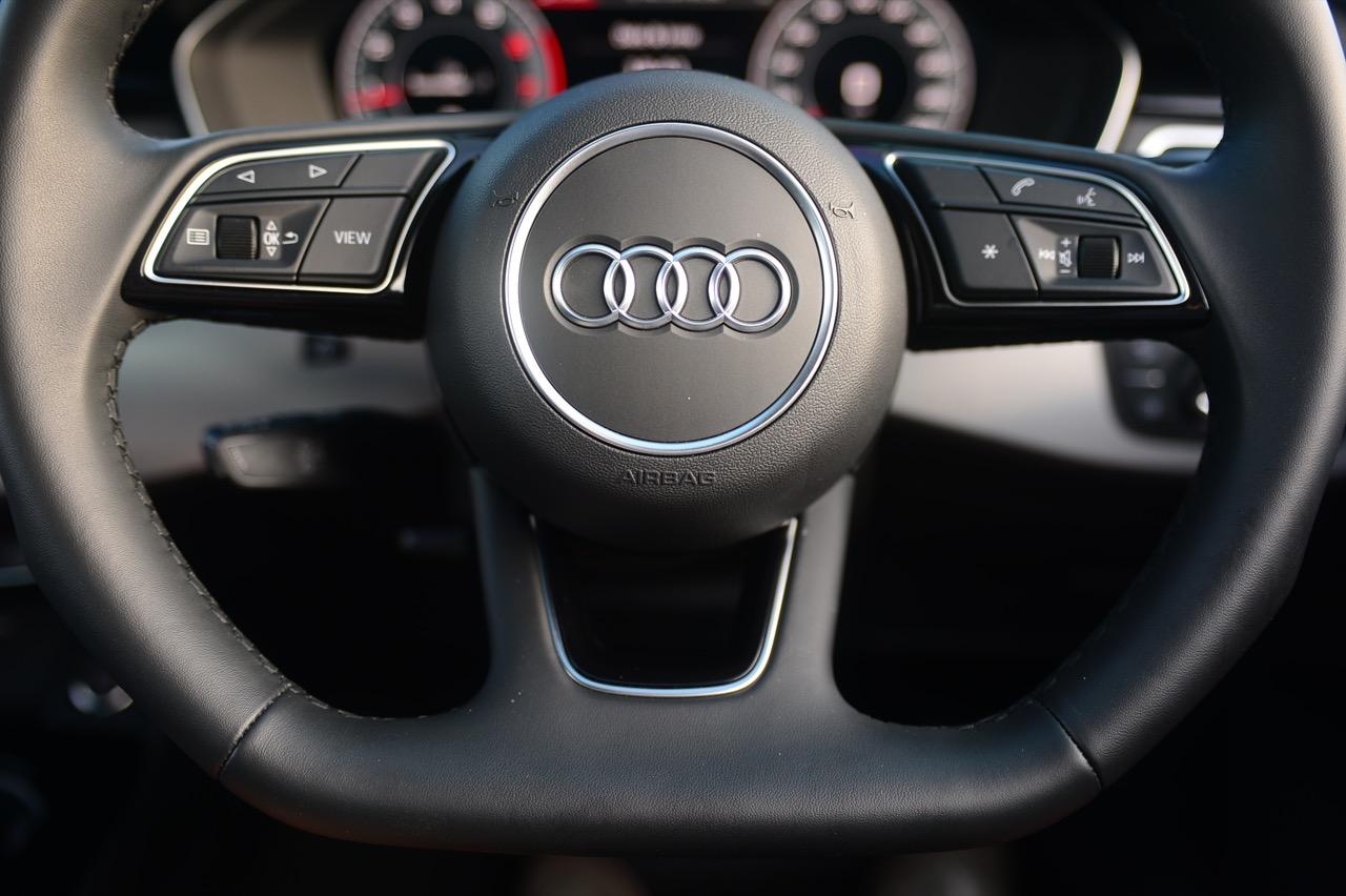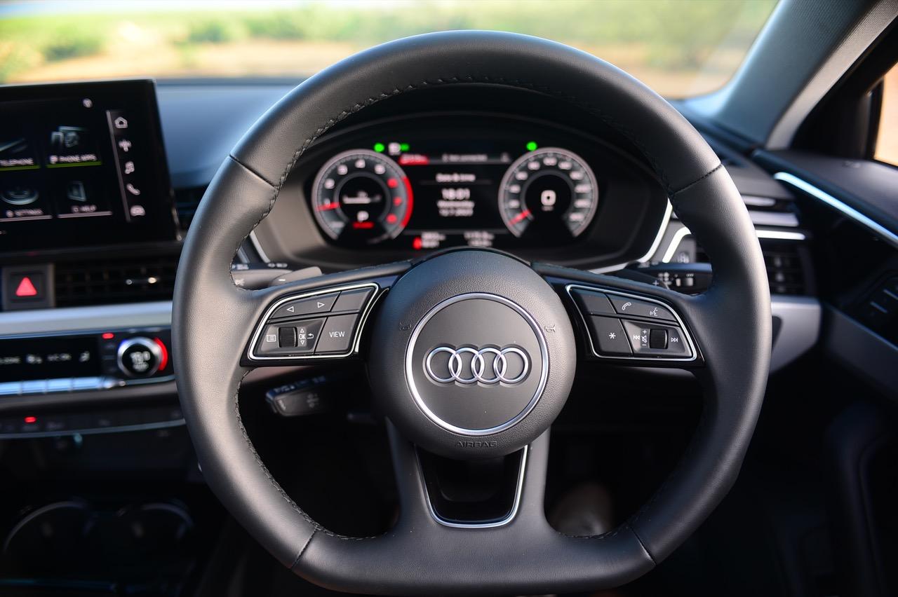 พวงมาลัยหุ้มหนังแท้ทรง 3 ก้านฐานตัดออกแนวสปอร์ต ก้านวงมีสวิตช์ปรับตั้งมัลติฟังก์ชั่นสำหรับการปรับเครื่องเสียง รับหรือวางสายโทรศัพท์ ก้านสวิตช์ปรับตั้งความเร็วอัตโนมัติ Cruise Control แป้นเปลี่ยนตำแหน่งเกียร์หลังพวงมาลัย Paddle Shift พวงมาลัยหนังแท้ของ A4 มีขนาดกำลังพอดีไม่ใหญ่หรือเล็กเกินไป ทำให้ยึดจับได้อย่างถนัดมือ พวงมาลัยปรับได้ 4 ทิศทาง