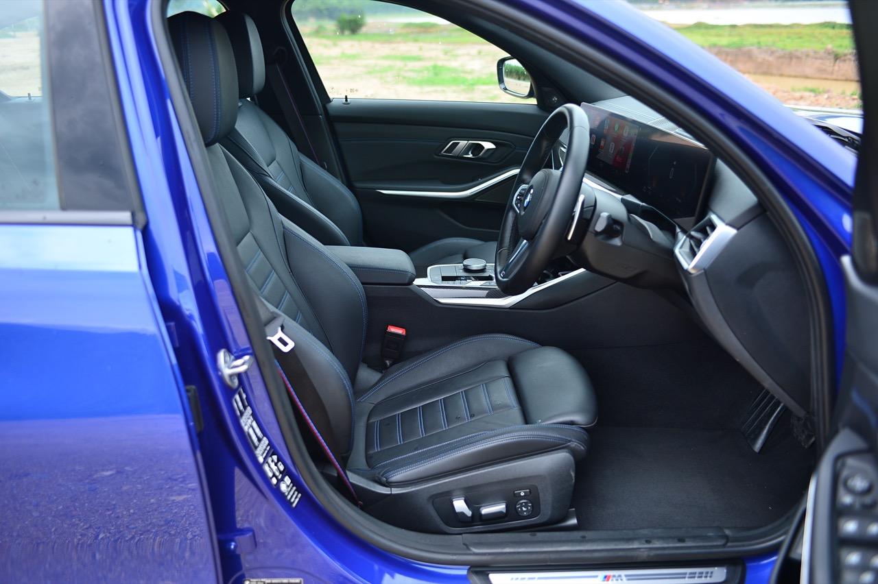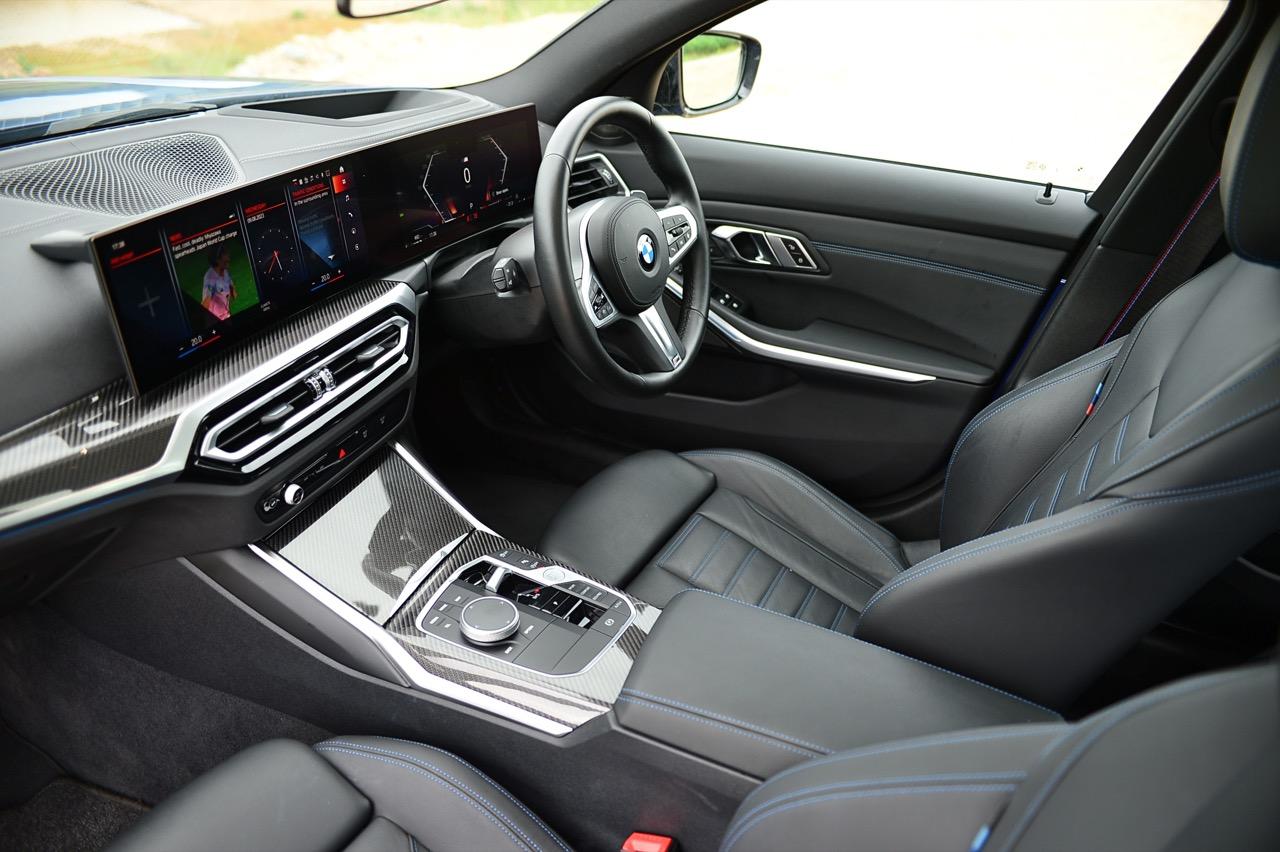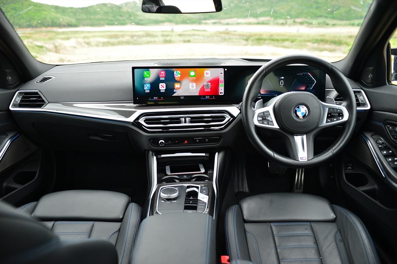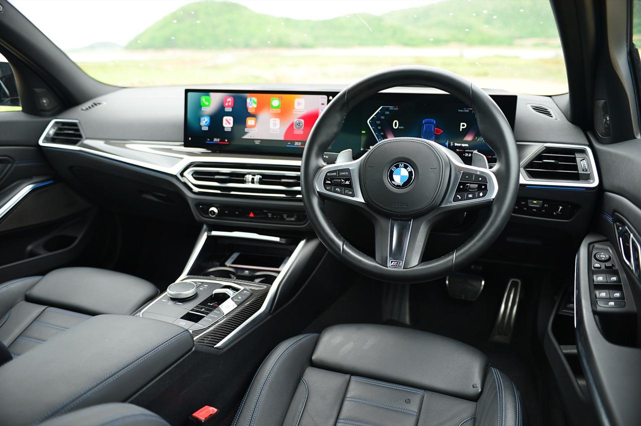 เบาะนั่ง M Sport ใหม่ หุ้มด้วยหนัง Vernasca เดินตะเข็บด้วยด้ายสีฟ้า พร้อมขอบสัญลักษณ์โทนสีของ BMW M เข็มขัดนิรภัย BMW M หนัง Vernasca เป็นหนังมาตรฐานตั้งแต่รุ่น 330e ขึ้นไป และในรุ่น M340i หากงานตกแต่งภายในยังไม่สาแก่ใจในความแพง สามารถเลือกสั่งงานภายในที่ตกแต่งในสไตล์ BMW Individual build แต่ต้องควักจ่ายในราคาที่สูงกว่าปกติ เบาะนั่งคู่หน้าปรับไฟฟ้าเต็มรูปแบบ ให้ความสบายและการรองรับที่ดี ไม่รู้สึกว่าจำเป็นต้องปรับท่านั่งตลอดเวลาขณะขับรถเพราะเมื่อย!! แม้ว่าที่นั่งใหม่จะดีมาก แต่การเปลี่ยนแปลงบางอย่างในห้องนักบินกลับไม่เป็นเช่นนั้น คันเกียร์แบบ e-shifter ทำให้นึกถึงคันเกียร์จิ๋วที่เปิดตัวใน 911/992 มันดูเล็กเกินไป มากกว่าจะให้ความรู้สึกของคันเกียร์แบบเก่า การละทิ้งคันเกียร์ทำให้ลูกค้าเก่าบางคนไม่ชอบใจ แต่พวงมาลัยหุ้มหนังแท้ของ BMW M ยังคงยอดเยี่ยม มีสวิตช์สำหรับปรับตั้ง Adaptive Cruise Control ที่วางแก้วและช่องเก็บของกระจุกกระจิก ยังคงเป็นจุดแข็งของ Series-3 ช่องเก็บของและที่ใส่ขวดน้ำบริเวณด้านข้างแผงประตูขนาดใหญ่ ที่ชาร์จโทรศัพท์แบบไร้สาย ทั้งหมดภายใต้ฝาปิดคาร์บอนไฟเบอร์ที่ดูดี ช่องเก็บของตรงกลางแบบลึก