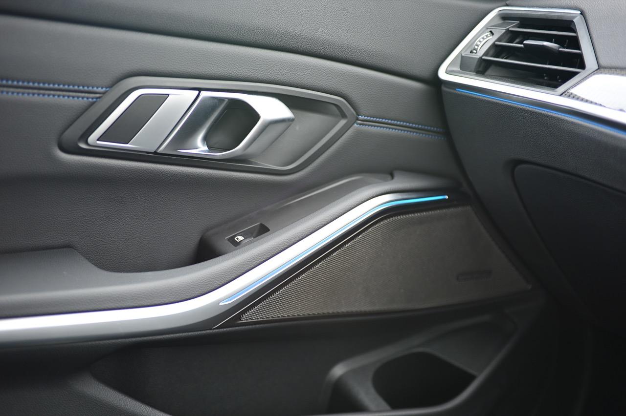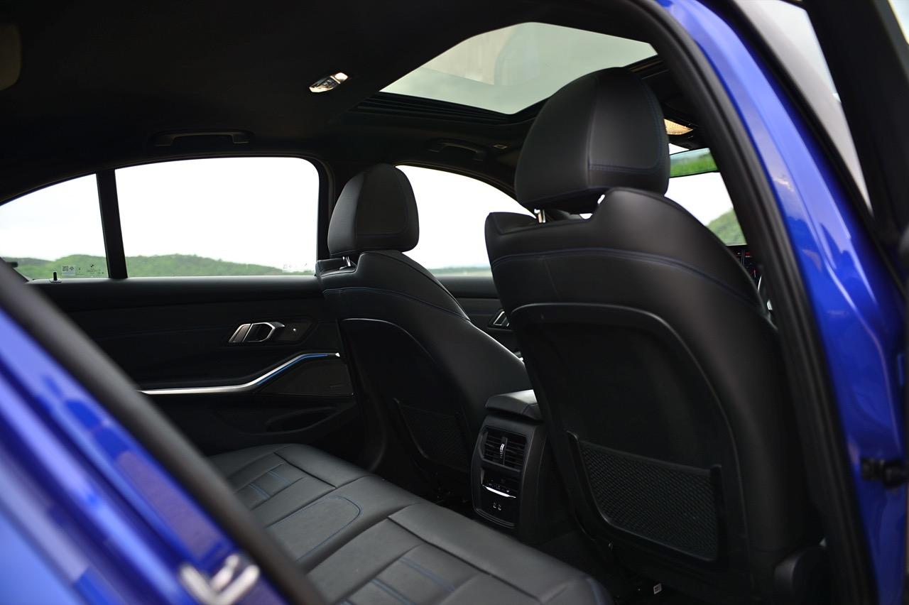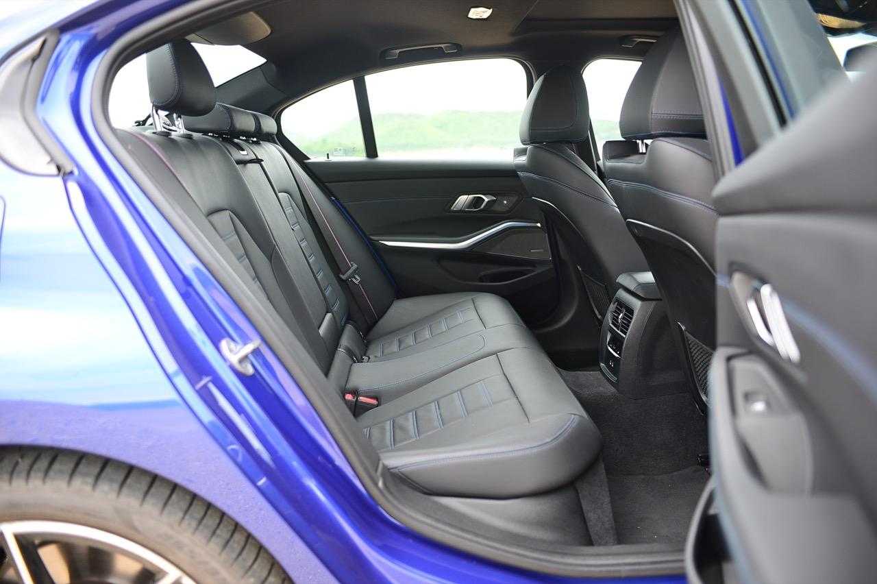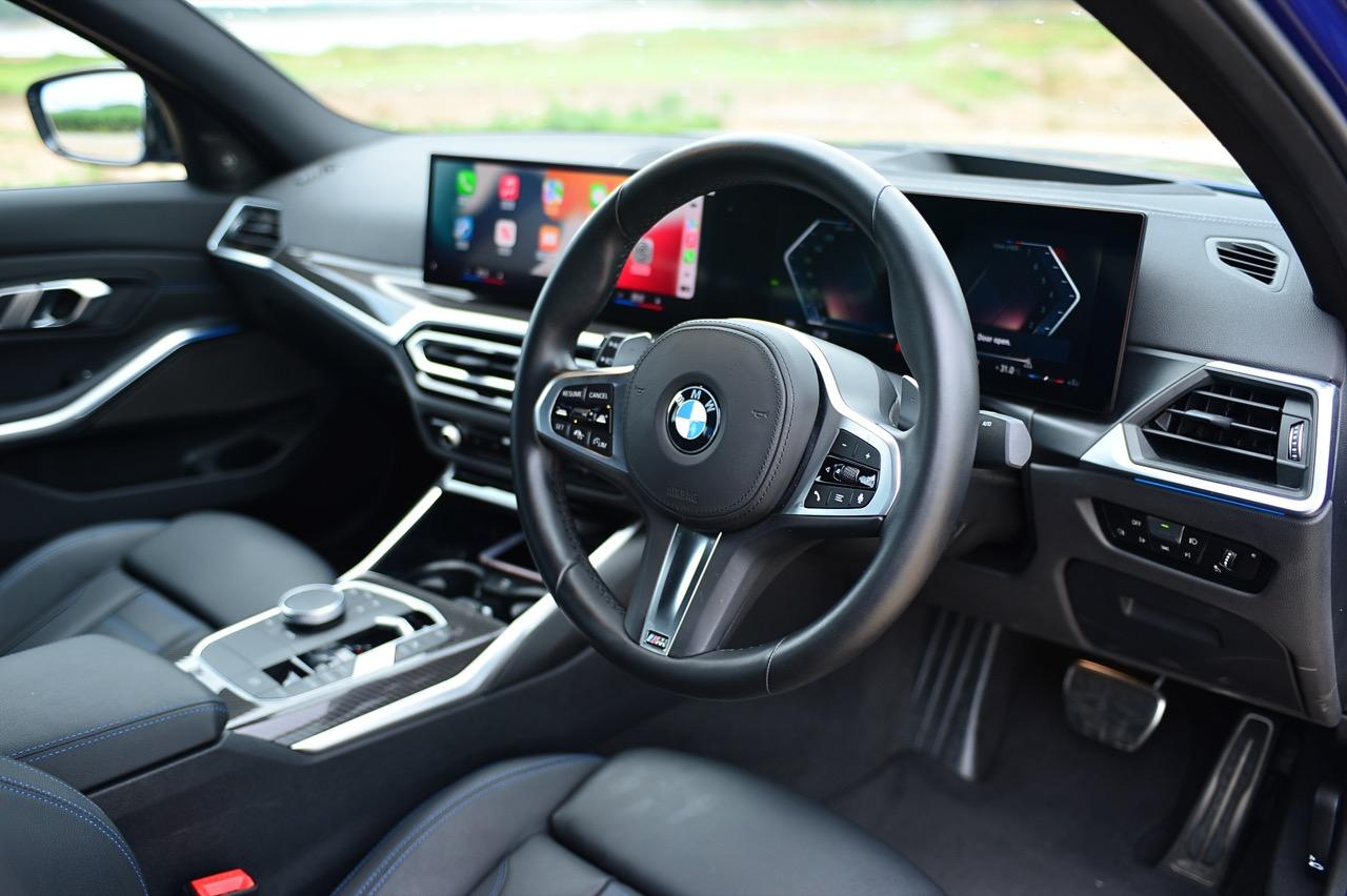 เบาะนั่ง M Sport ใหม่ หุ้มด้วยหนัง Vernasca เดินตะเข็บด้วยด้ายสีฟ้า พร้อมขอบสัญลักษณ์โทนสีของ BMW M เข็มขัดนิรภัย BMW M หนัง Vernasca เป็นหนังมาตรฐานตั้งแต่รุ่น 330e ขึ้นไป และในรุ่น M340i หากงานตกแต่งภายในยังไม่สาแก่ใจในความแพง สามารถเลือกสั่งงานภายในที่ตกแต่งในสไตล์ BMW Individual build แต่ต้องควักจ่ายในราคาที่สูงกว่าปกติ เบาะนั่งคู่หน้าปรับไฟฟ้าเต็มรูปแบบ ให้ความสบายและการรองรับที่ดี ไม่รู้สึกว่าจำเป็นต้องปรับท่านั่งตลอดเวลาขณะขับรถเพราะเมื่อย!! แม้ว่าที่นั่งใหม่จะดีมาก แต่การเปลี่ยนแปลงบางอย่างในห้องนักบินกลับไม่เป็นเช่นนั้น คันเกียร์แบบ e-shifter ทำให้นึกถึงคันเกียร์จิ๋วที่เปิดตัวใน 911/992 มันดูเล็กเกินไป มากกว่าจะให้ความรู้สึกของคันเกียร์แบบเก่า การละทิ้งคันเกียร์ทำให้ลูกค้าเก่าบางคนไม่ชอบใจ แต่พวงมาลัยหุ้มหนังแท้ของ BMW M ยังคงยอดเยี่ยม มีสวิตช์สำหรับปรับตั้ง Adaptive Cruise Control ที่วางแก้วและช่องเก็บของกระจุกกระจิก ยังคงเป็นจุดแข็งของ Series-3 ช่องเก็บของและที่ใส่ขวดน้ำบริเวณด้านข้างแผงประตูขนาดใหญ่ ที่ชาร์จโทรศัพท์แบบไร้สาย ทั้งหมดภายใต้ฝาปิดคาร์บอนไฟเบอร์ที่ดูดี ช่องเก็บของตรงกลางแบบลึก