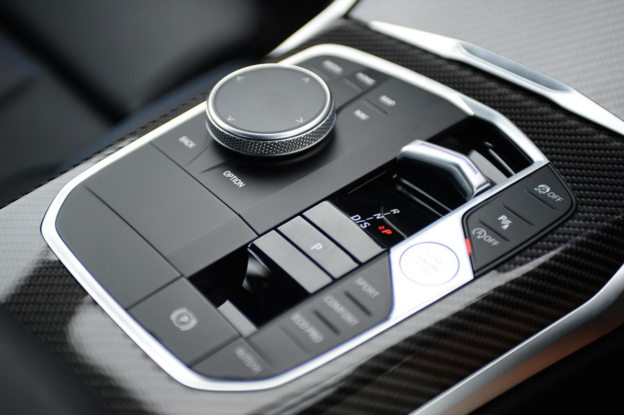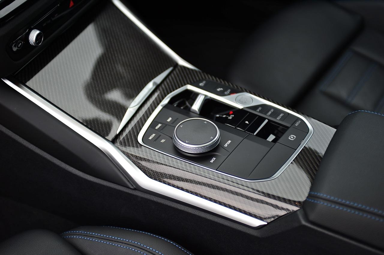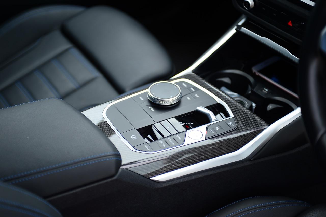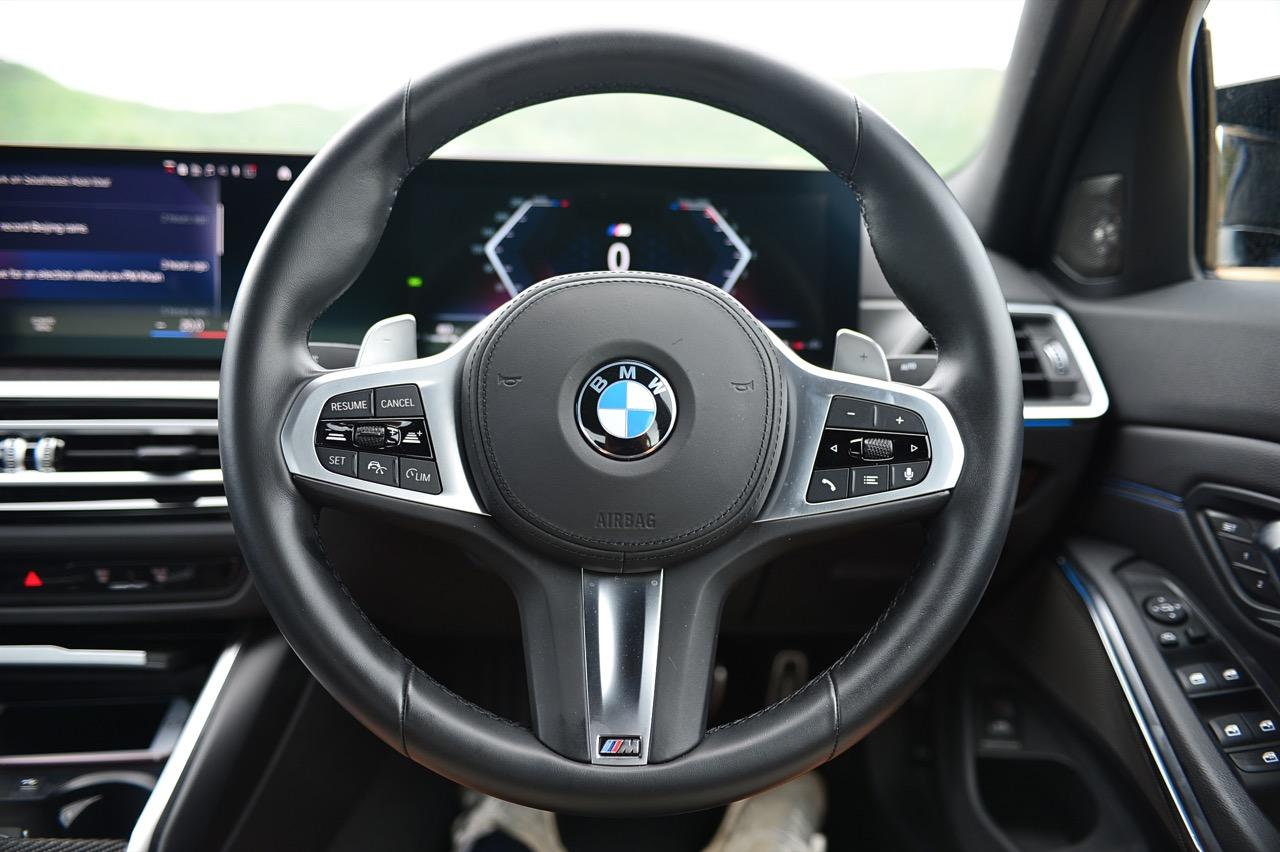 เบาะนั่ง M Sport ใหม่ หุ้มด้วยหนัง Vernasca เดินตะเข็บด้วยด้ายสีฟ้า พร้อมขอบสัญลักษณ์โทนสีของ BMW M เข็มขัดนิรภัย BMW M หนัง Vernasca เป็นหนังมาตรฐานตั้งแต่รุ่น 330e ขึ้นไป และในรุ่น M340i หากงานตกแต่งภายในยังไม่สาแก่ใจในความแพง สามารถเลือกสั่งงานภายในที่ตกแต่งในสไตล์ BMW Individual build แต่ต้องควักจ่ายในราคาที่สูงกว่าปกติ เบาะนั่งคู่หน้าปรับไฟฟ้าเต็มรูปแบบ ให้ความสบายและการรองรับที่ดี ไม่รู้สึกว่าจำเป็นต้องปรับท่านั่งตลอดเวลาขณะขับรถเพราะเมื่อย!! แม้ว่าที่นั่งใหม่จะดีมาก แต่การเปลี่ยนแปลงบางอย่างในห้องนักบินกลับไม่เป็นเช่นนั้น คันเกียร์แบบ e-shifter ทำให้นึกถึงคันเกียร์จิ๋วที่เปิดตัวใน 911/992 มันดูเล็กเกินไป มากกว่าจะให้ความรู้สึกของคันเกียร์แบบเก่า การละทิ้งคันเกียร์ทำให้ลูกค้าเก่าบางคนไม่ชอบใจ แต่พวงมาลัยหุ้มหนังแท้ของ BMW M ยังคงยอดเยี่ยม มีสวิตช์สำหรับปรับตั้ง Adaptive Cruise Control ที่วางแก้วและช่องเก็บของกระจุกกระจิก ยังคงเป็นจุดแข็งของ Series-3 ช่องเก็บของและที่ใส่ขวดน้ำบริเวณด้านข้างแผงประตูขนาดใหญ่ ที่ชาร์จโทรศัพท์แบบไร้สาย ทั้งหมดภายใต้ฝาปิดคาร์บอนไฟเบอร์ที่ดูดี ช่องเก็บของตรงกลางแบบลึก